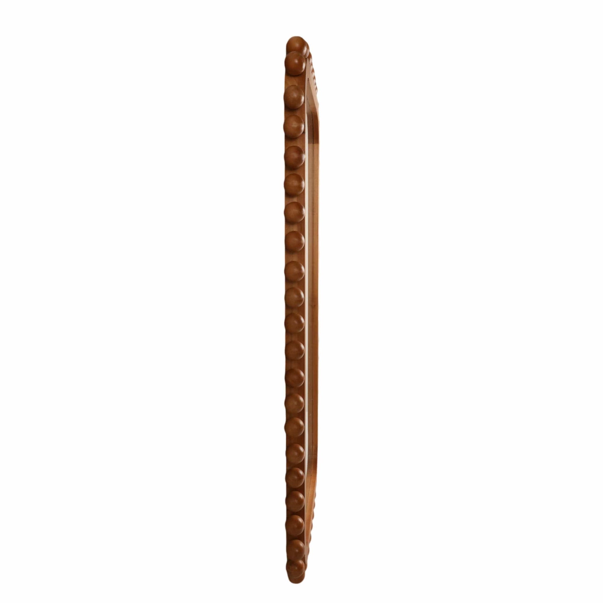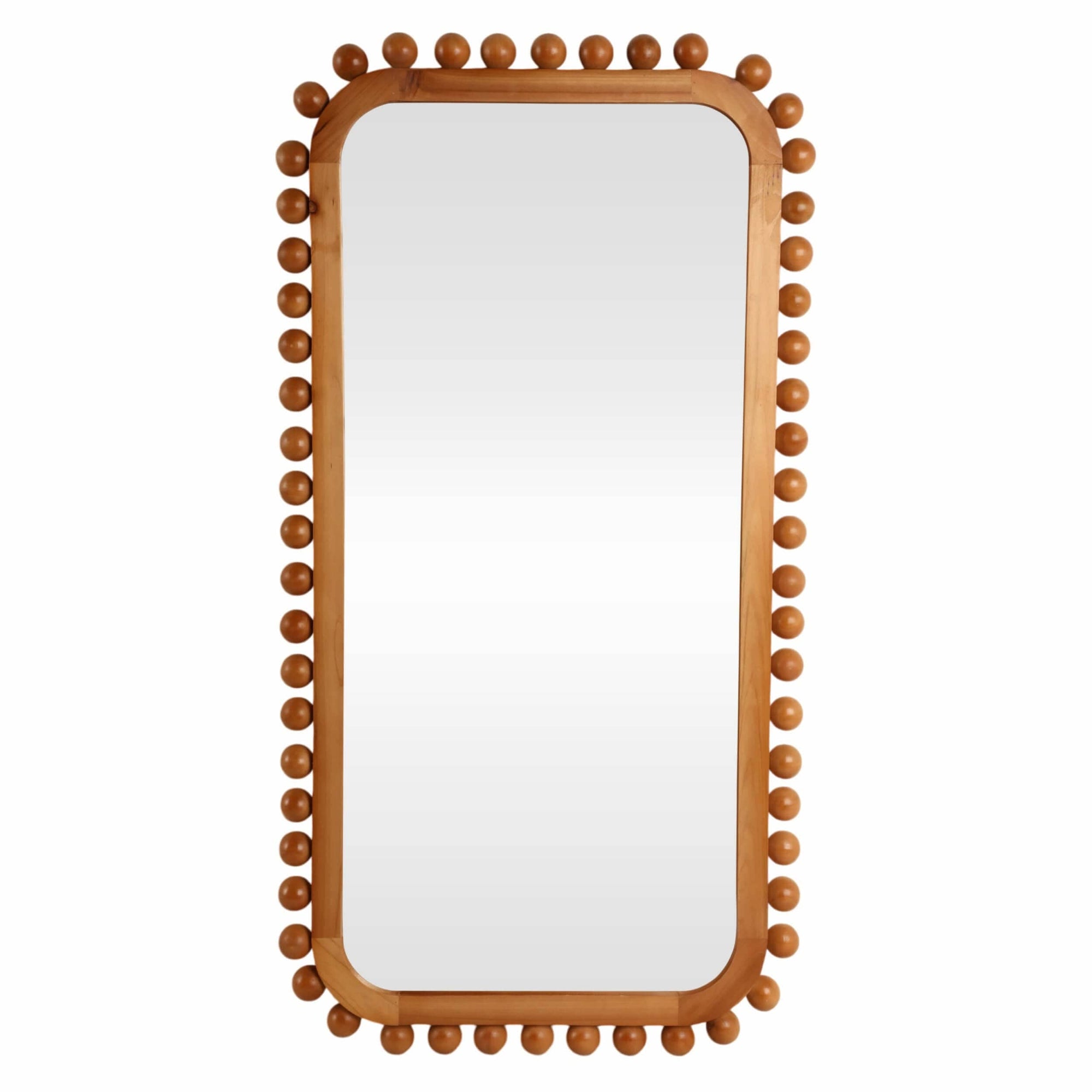 The Knobby Rectangular Mirror brings rustic charm with a modern twist. Framed in handcrafted fir wood with a rich natural brown finish, this full-length wall mirror adds warmth and character to any space. Its unique rounded edges, accented with decorative wood ball details, create a stylish focal point that stands out while blending effortlessly with farmhouse, bohemian, modern, or contemporary interiors. Perfect for bedrooms, entryways, or living areas, this mirror combines functionality with artistic design, elevating your décor with timeless appeal.
