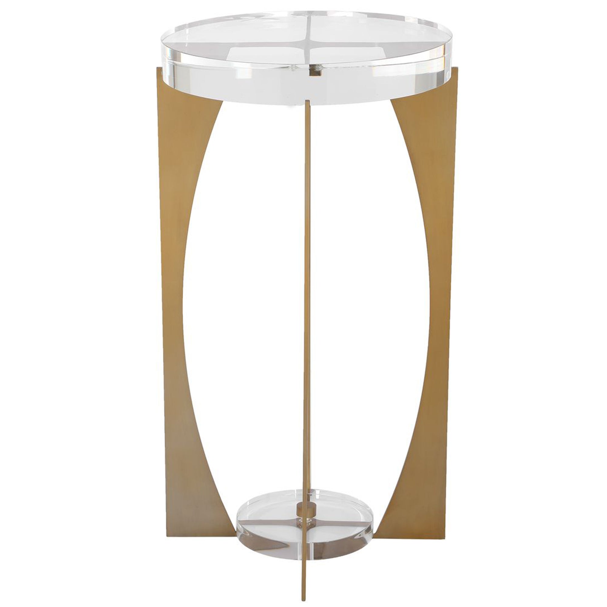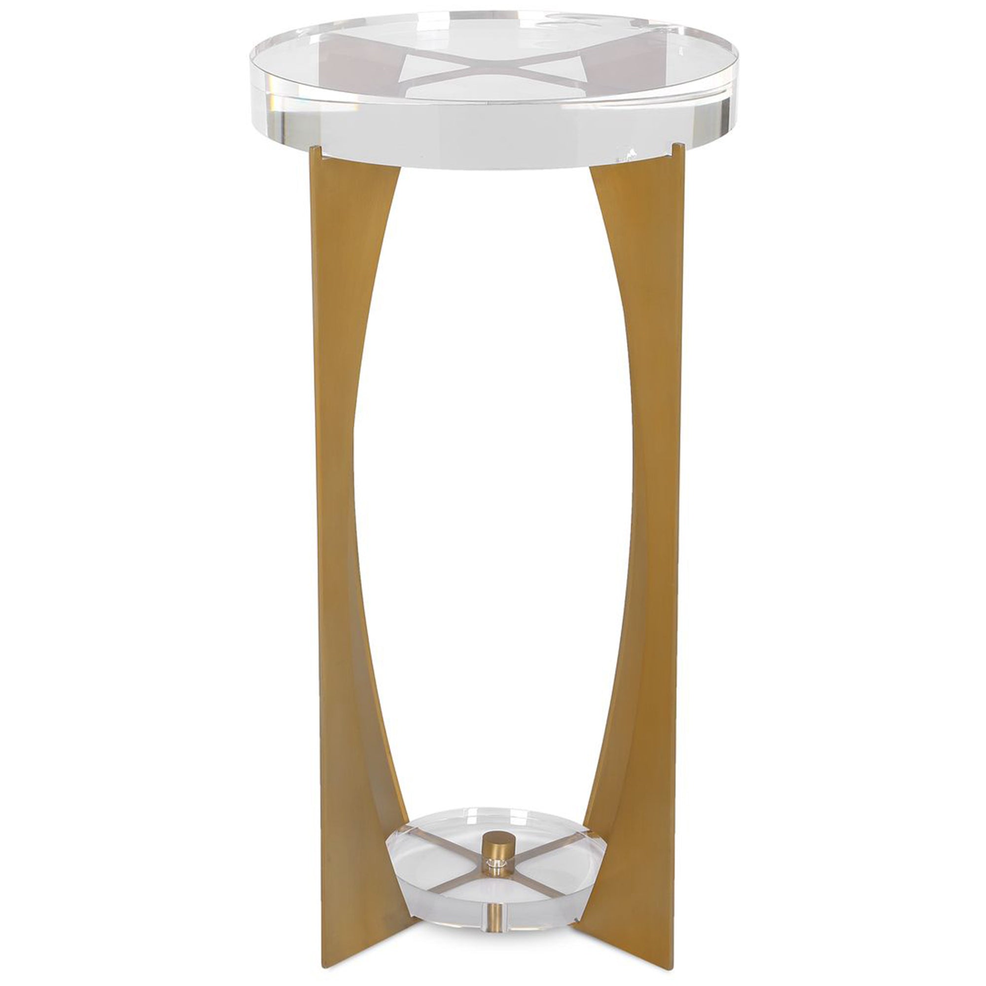 The Kolkata Accent Table is an elegant accent piece featuring a striking brass finished iron base with a unique, open-frame design. The metalwork is beautifully complemented by a crystal tabletop and a matching clear acrylic base plate. Its tall, slender profile and transparent elements allow it to blend seamlessly into modern interiors while providing a sophisticated surface for decor or beverages.