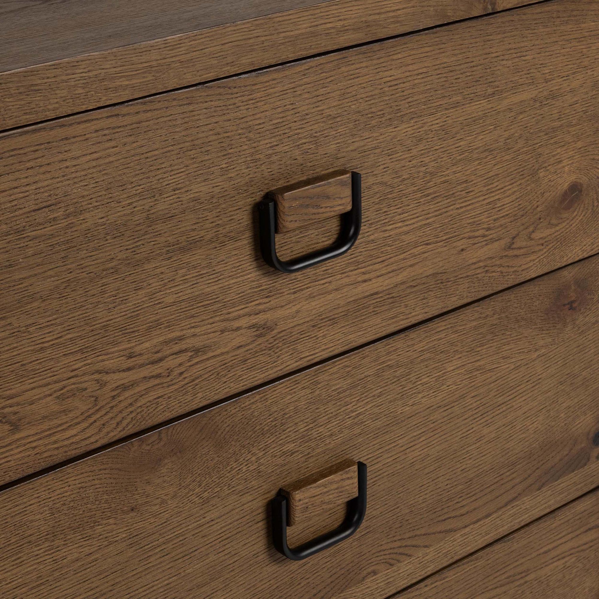 The Kyrie 6 Drawer Dresser brings timeless character and warmth to your bedroom. Handcrafted from reclaimed wood veneer, its natural grain and smooth hand finish highlight the organic beauty of wood. Spacious and stylish, it offers generous storage for clothes and linens, blending eco-conscious craftsmanship with everyday luxury.
