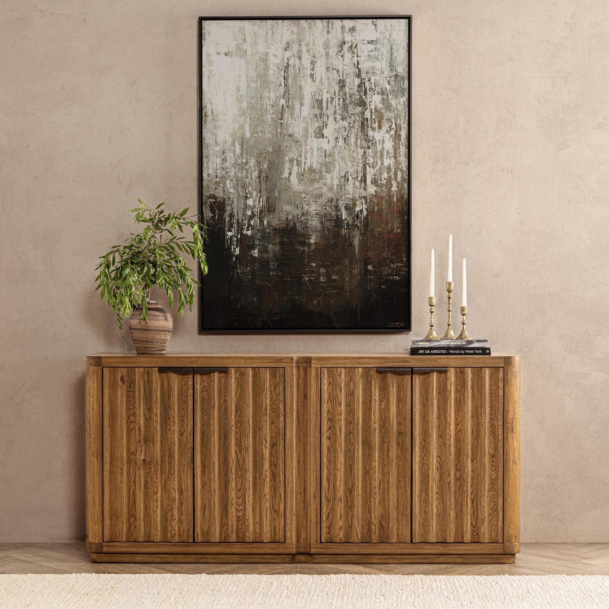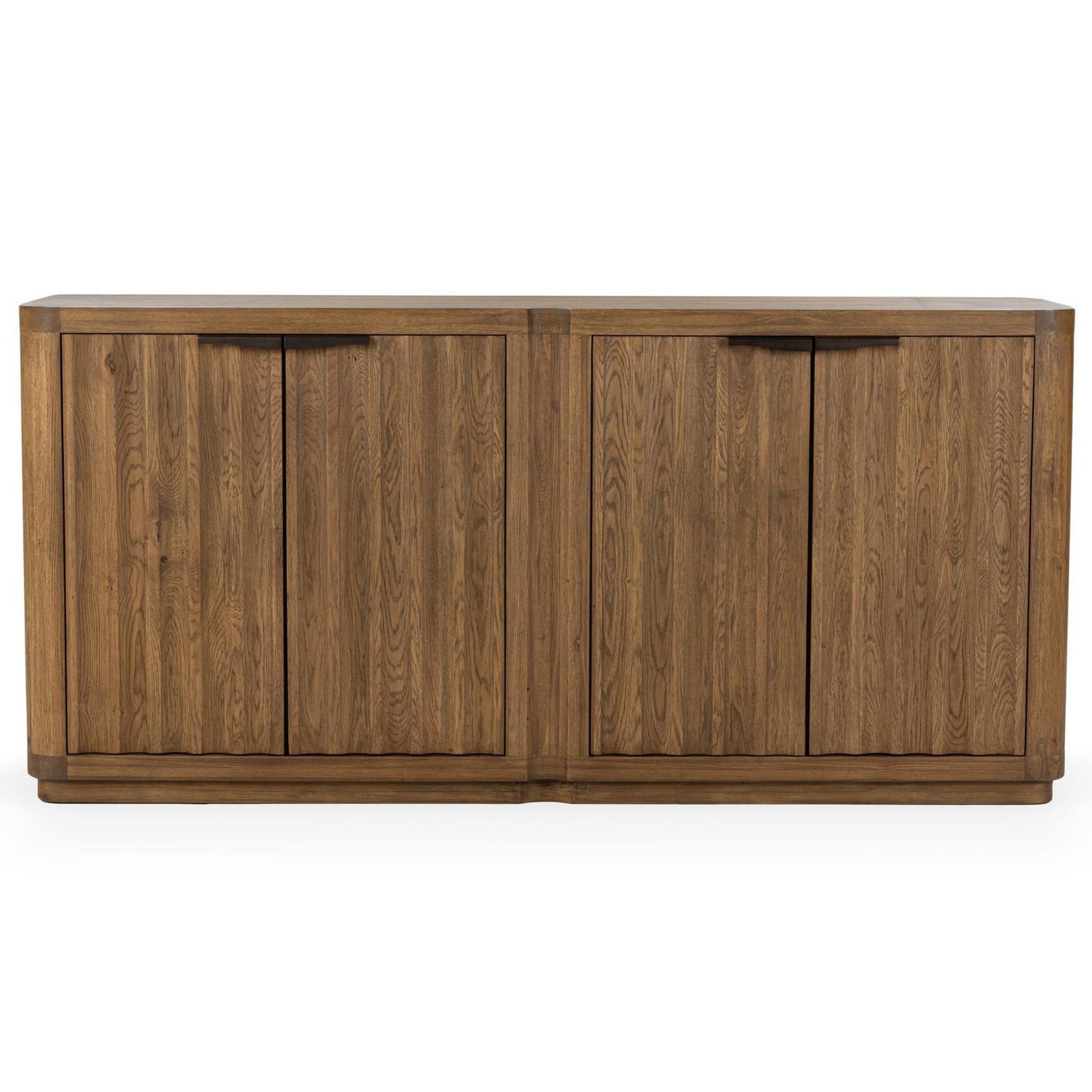 The Labelle 4 Door Buffet blends form and function in refined style. Crafted with oak veneer, this sideboard features clean lines and a vertical grain pattern that adds depth and warmth to any space. Four doors open to reveal removable shelves for flexible storage, while two discreet wire management holes support modern media setups. Perfect for dining areas, living rooms, or entryways, this buffet combines timeless design with practical versatility.