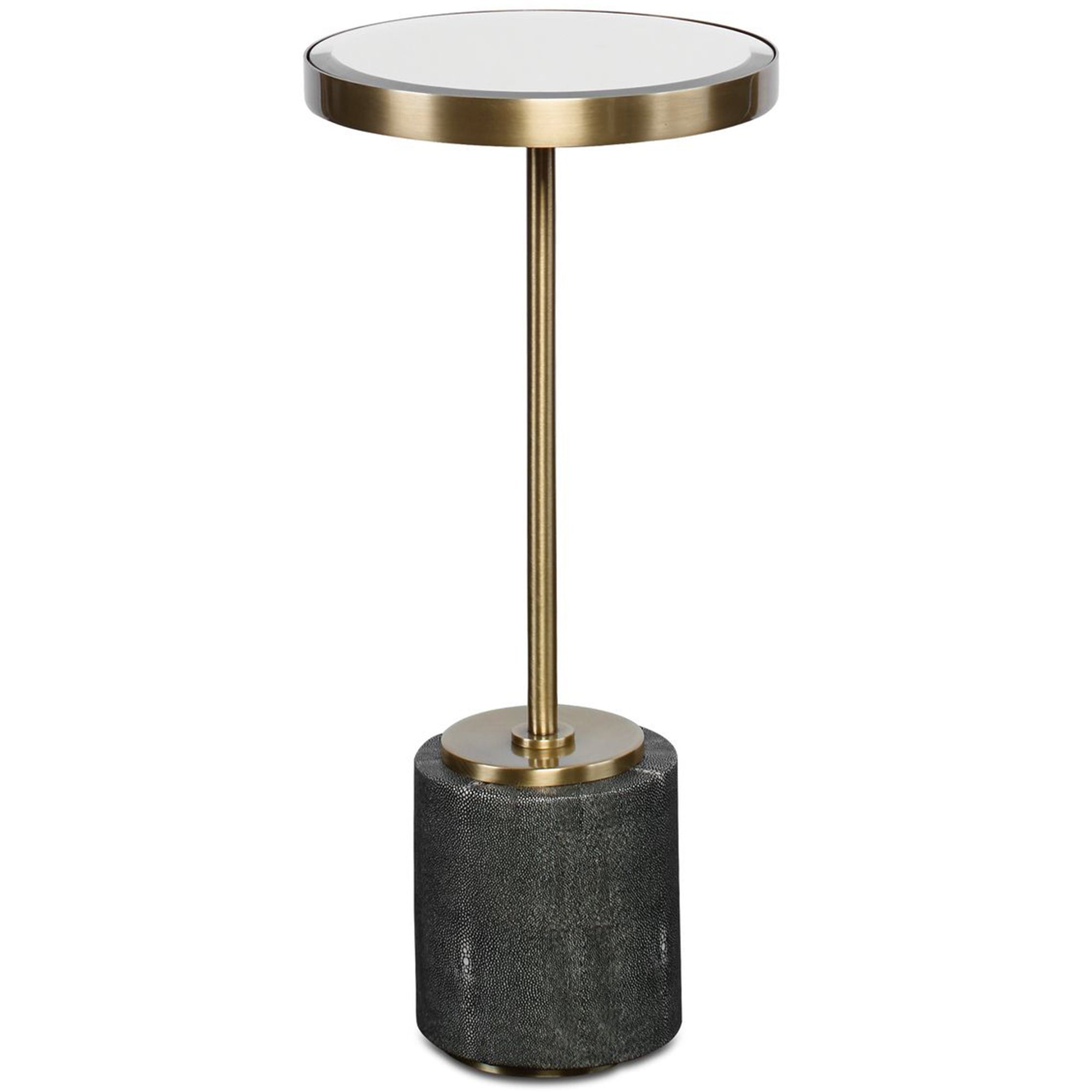 The Laurier Drink Table is a stylish and sophisticated accent piece that brings a modern touch to any room. This round table features a base covered in gray faux shagreen, providing a unique textured appearance. The base is connected to a slender iron support finished in rich brushed brass, leading up to a beveled mirror tabletop that reflects light beautifully.