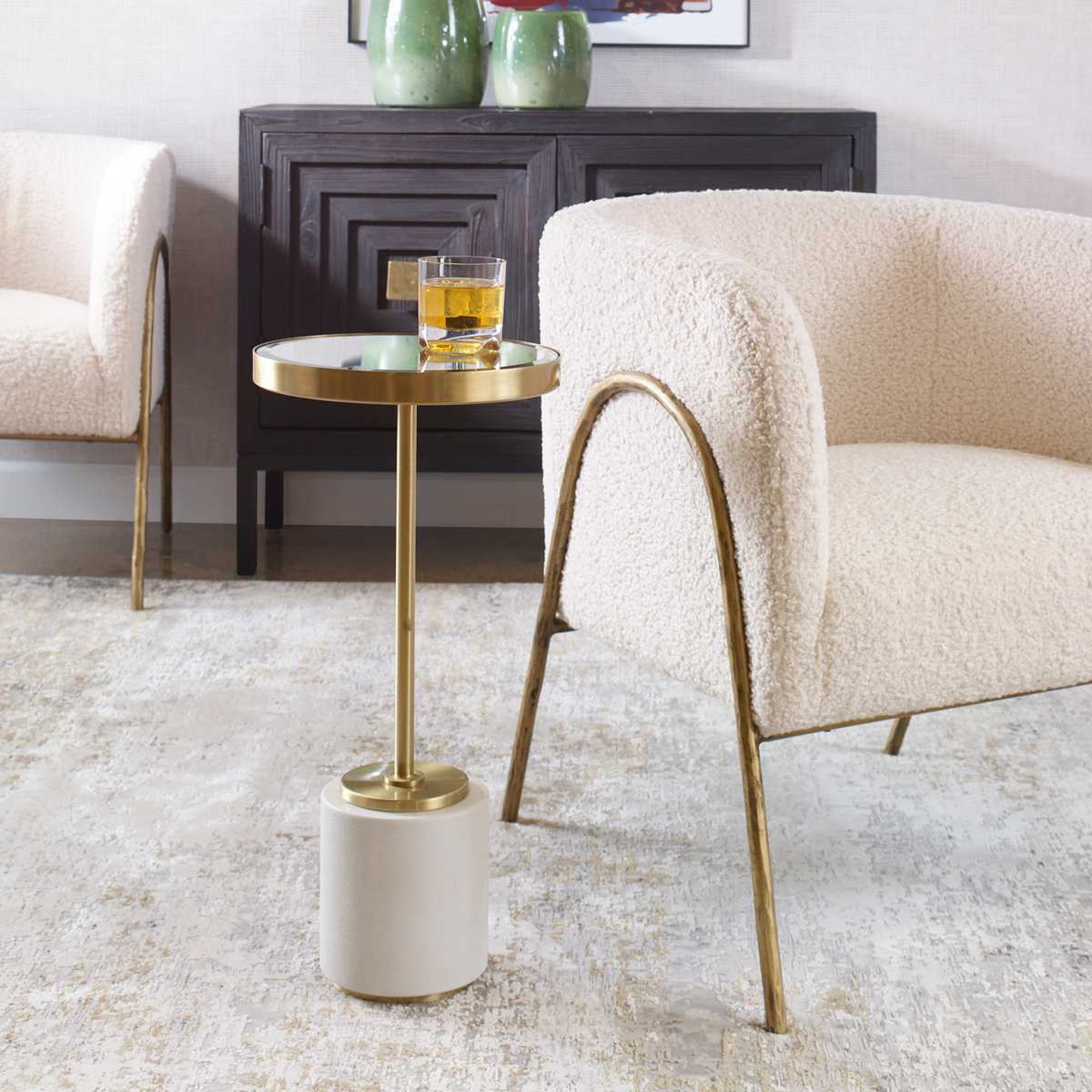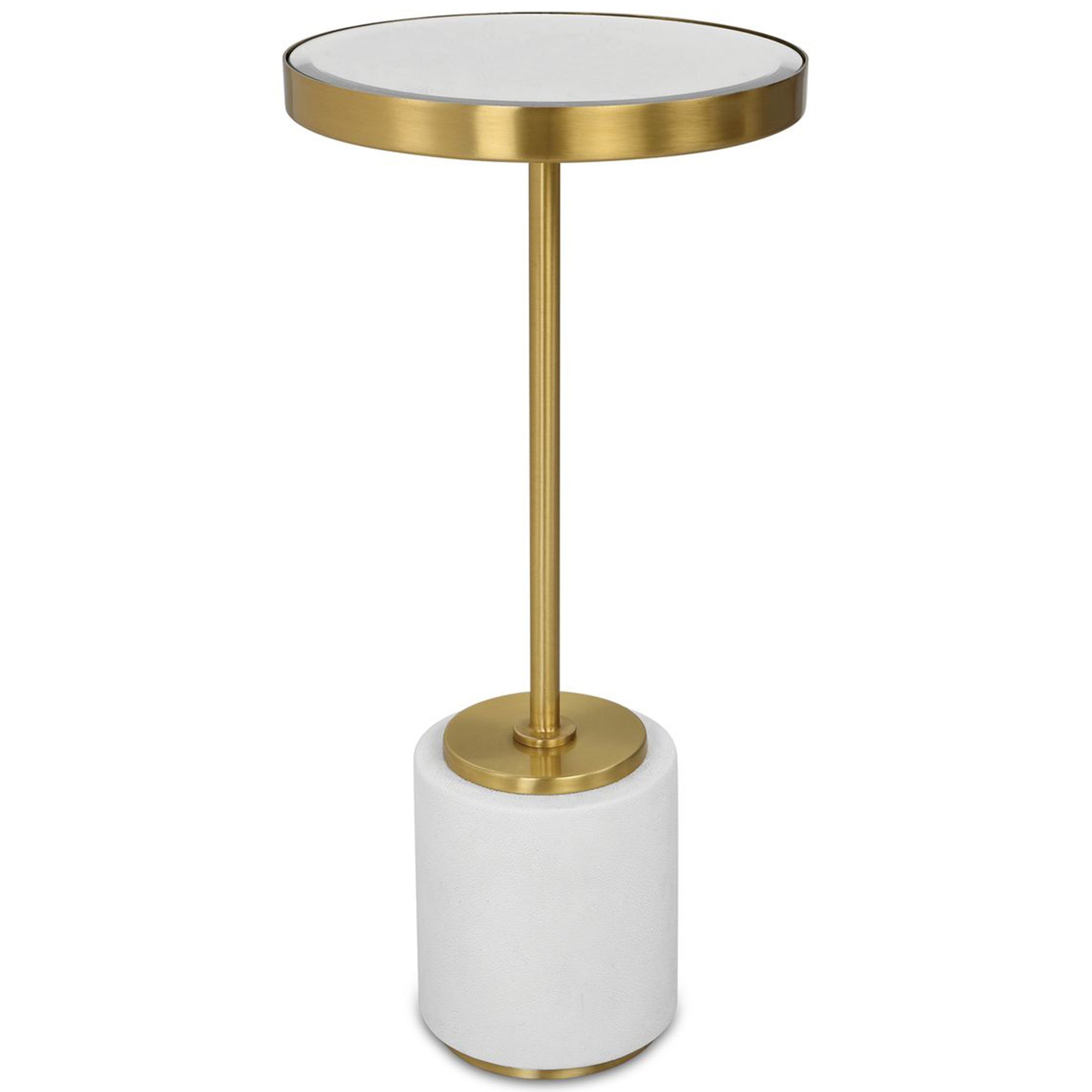 The Laurier Drink Table is a stylish and sophisticated accent piece that brings a modern touch to any room. This round table features a base covered in gray faux shagreen, providing a unique textured appearance. The base is connected to a slender iron support finished in rich brushed brass, leading up to a beveled mirror tabletop that reflects light beautifully.