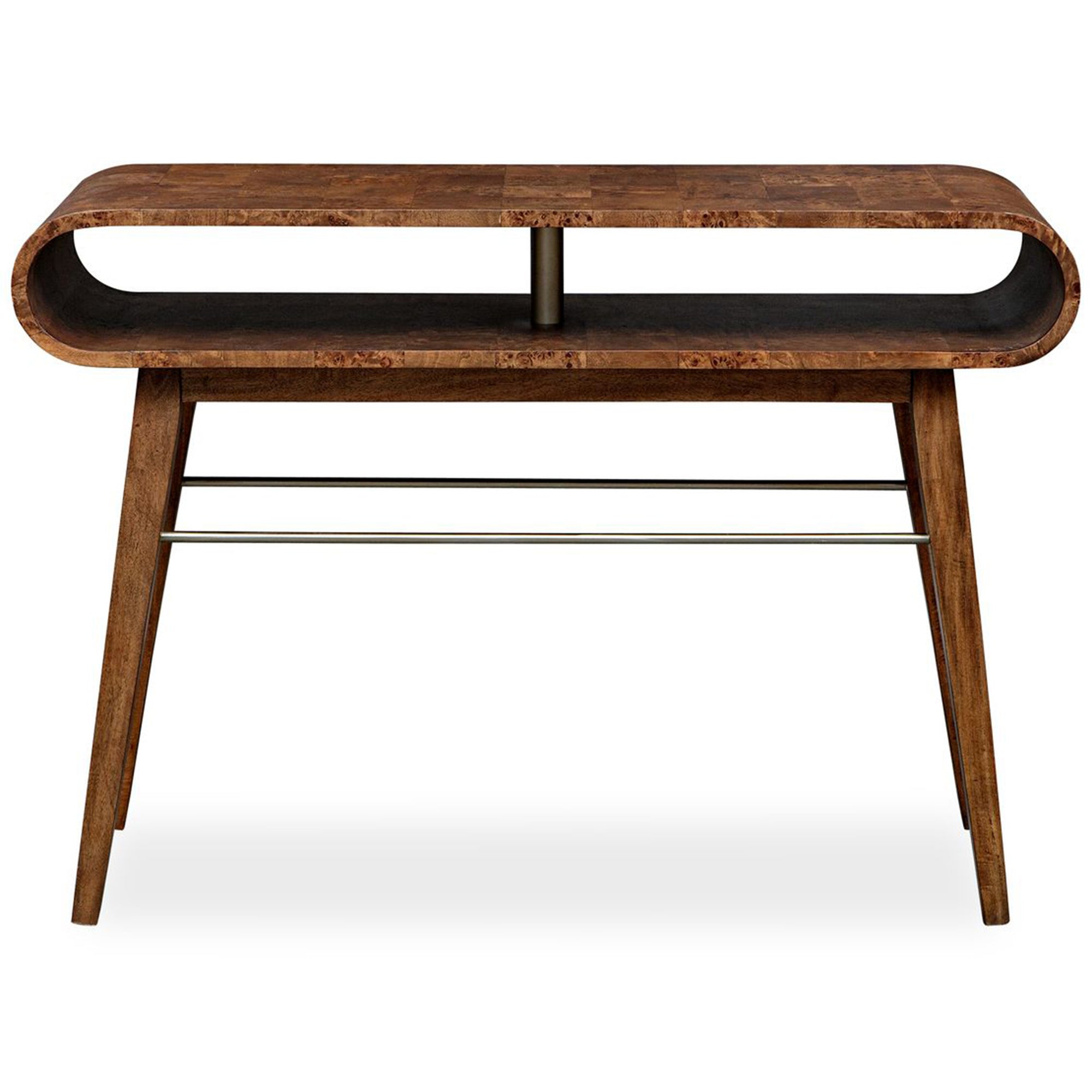 The Ledger Console Table is crafted from rich burl veneer and Java wood, effortlessly bringing a mid-century modern charm to your space. Its hollow interior offers practical storage while maintaining clean lines and organic curves. Accented with brass finished hardware, this distinctive piece features a curved oval-like profile supported by tapered wood legs and slender metallic cross-brace supports for a sophisticated, architectural look.