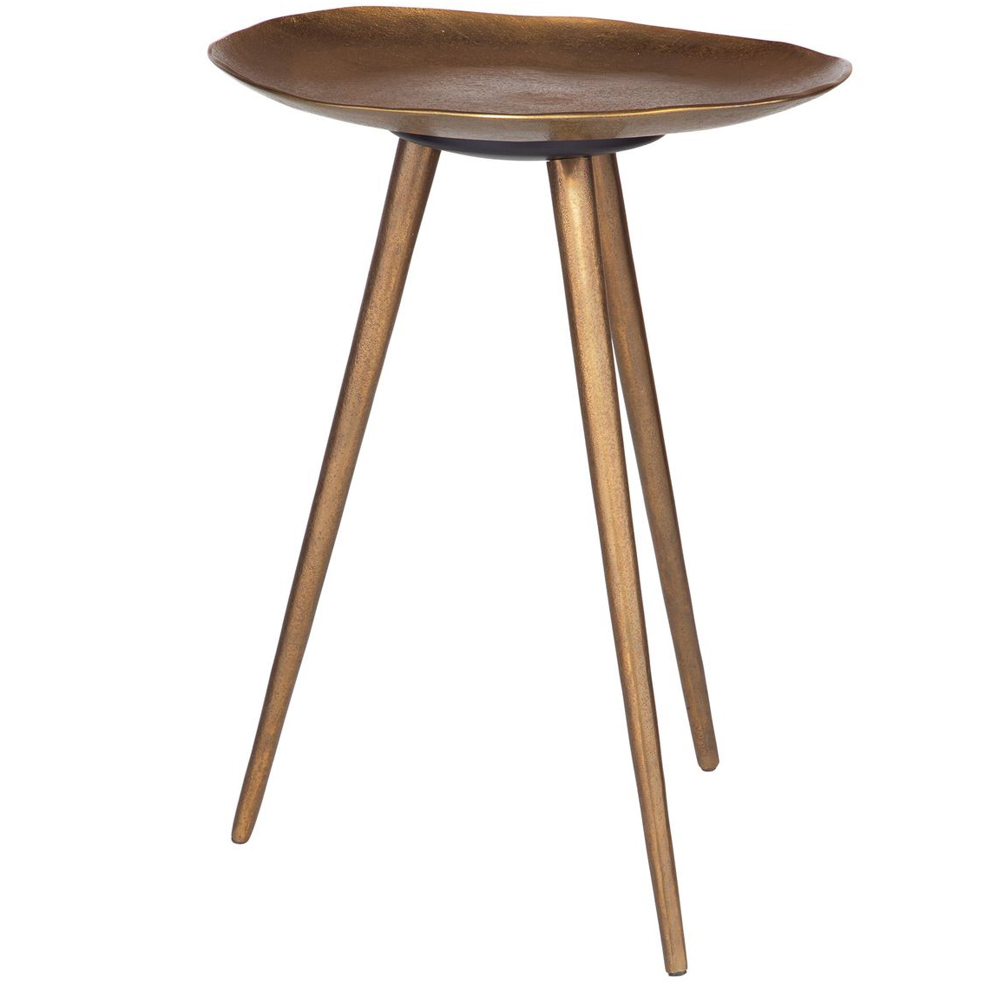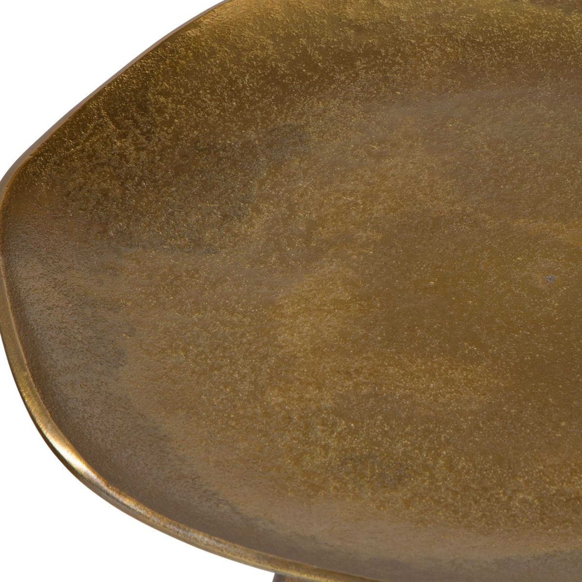 The Lily Pad Accent Table is a unique piece made from cast aluminum in an antique brass finish. The design features three slender legs extending outward to provide a sturdy tripod base supporting the lily pad shape top. This organic, nature-inspired table offers a slim profile that fits easily into tight spaces while adding a touch of sophisticated metallic warmth to your decor.