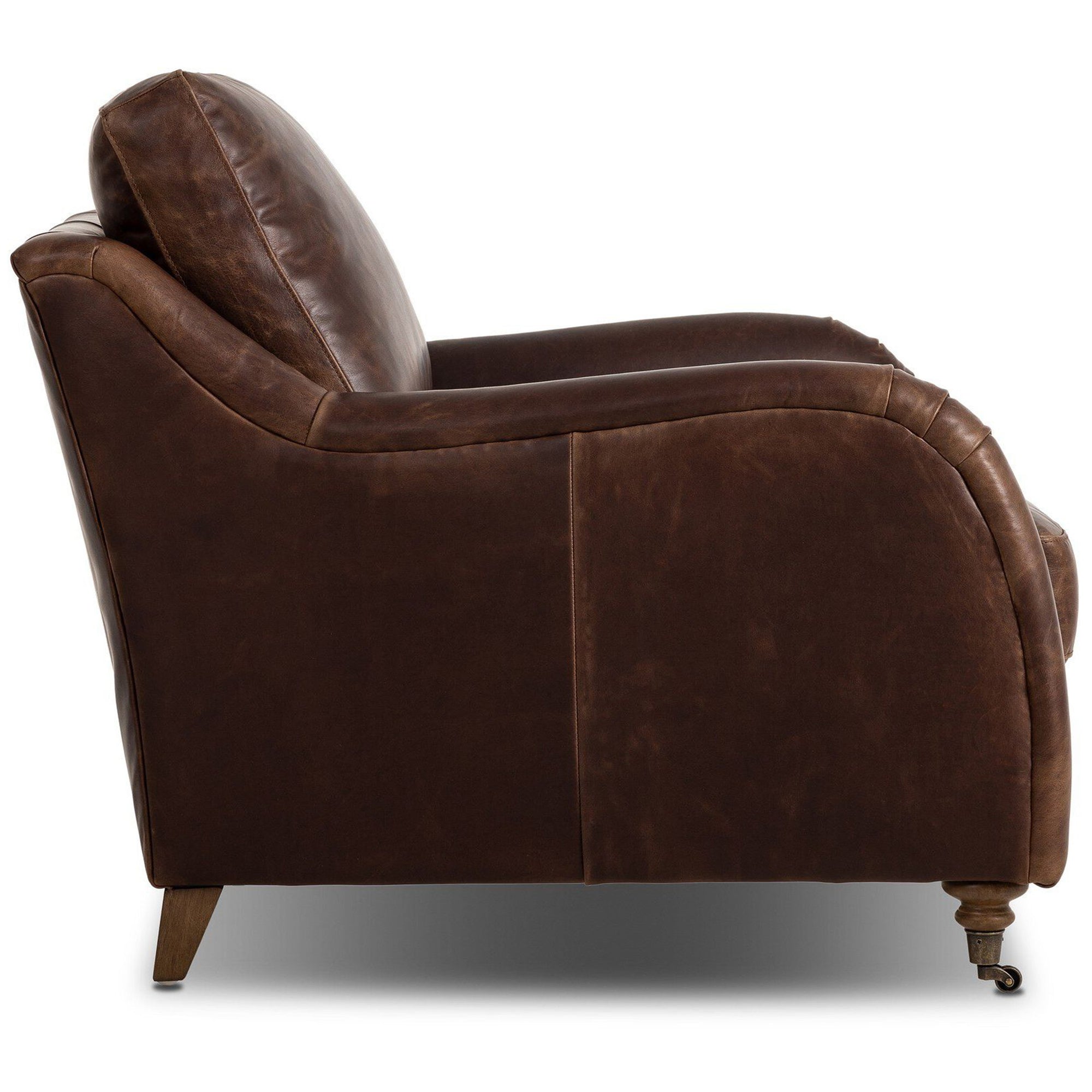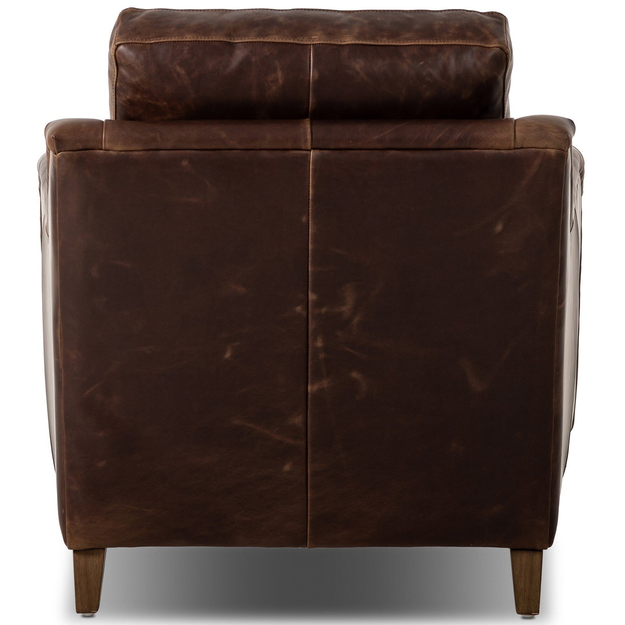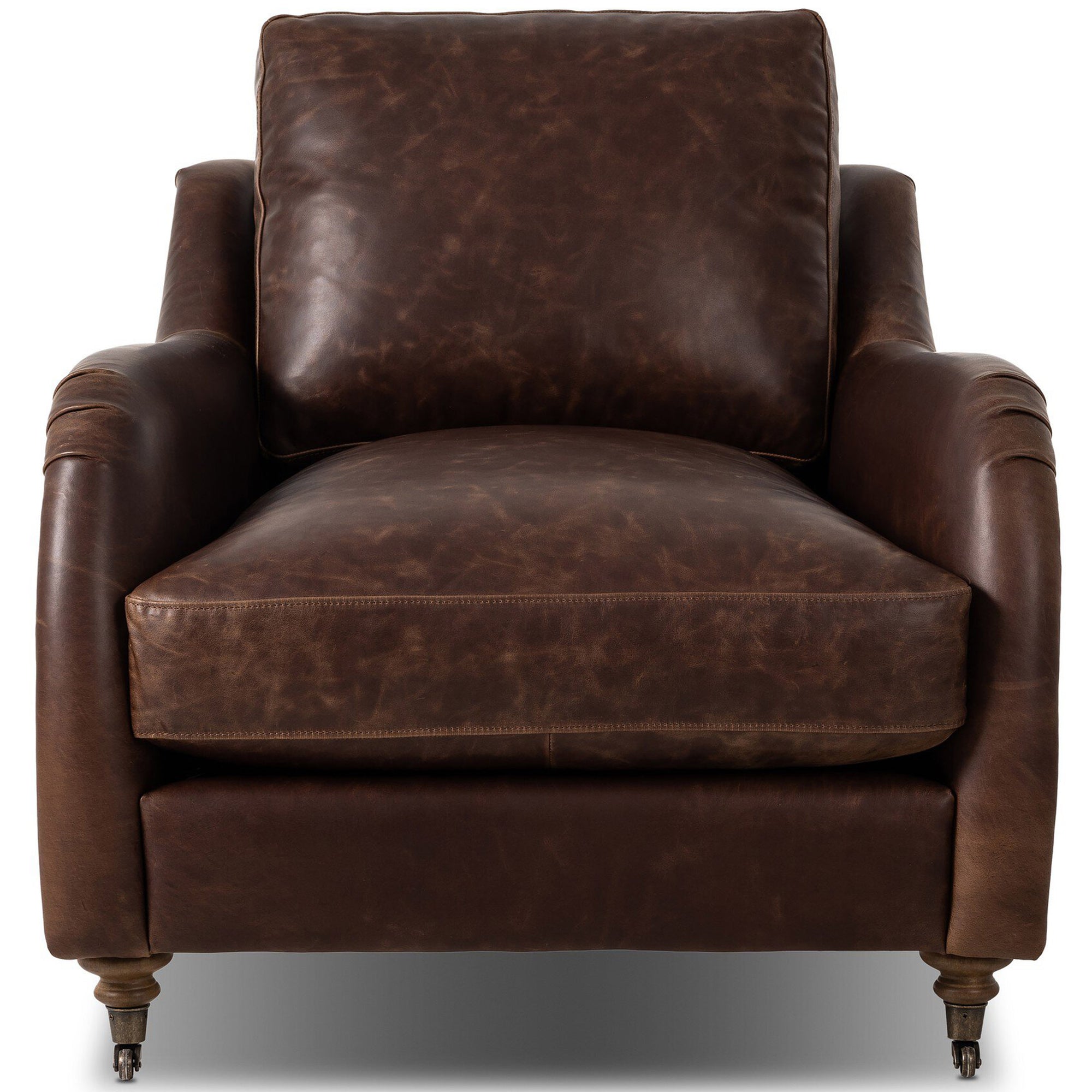 The Lynn Leather Chair draws on traditional English inspiration with its rolled arms, turned legs, and caster details. Sink-in cushions and soft, pleated details create an inviting, lived-in feel. It is upholstered in classic Italian leather, which is finished with a specialized formula that creates intentional cracking and distressing for a naturally aged look. This chair is a design collaboration by Amber Lewis and Four Hands.