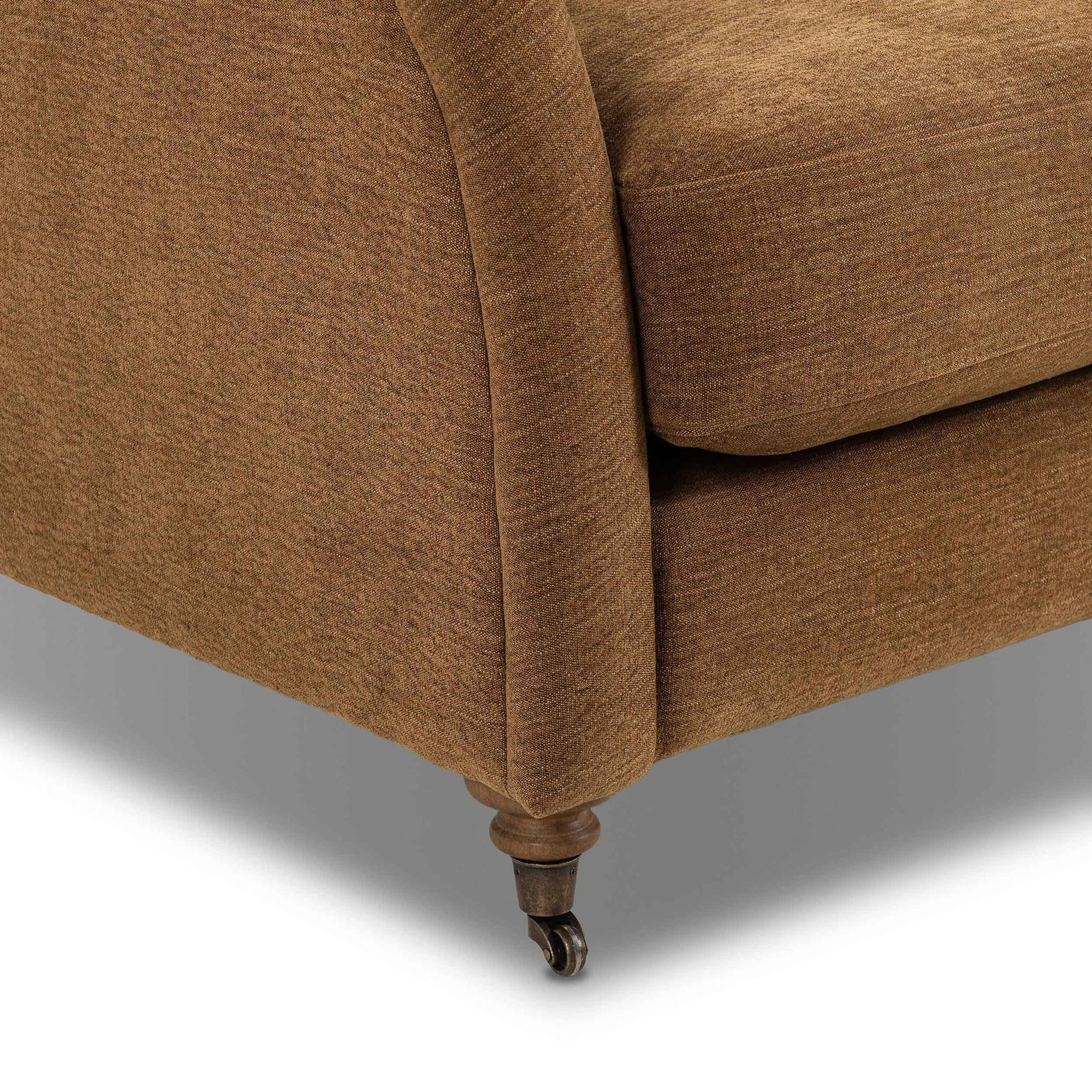 The Lynne Sofa draws on traditional English inspiration with its rolled arms, turned legs, and caster details. Sink-in cushions and soft, pleated details invite a lived-in feel. It is upholstered in a soft linen/cotton poly blend with a slightly slubbed texture for total comfort. Performance fabrics are specially created to withstand spills, stains, high traffic, and wear, ensuring long-term durability. This sofa is a design collaboration by Amber Lewis and Four Hands.
