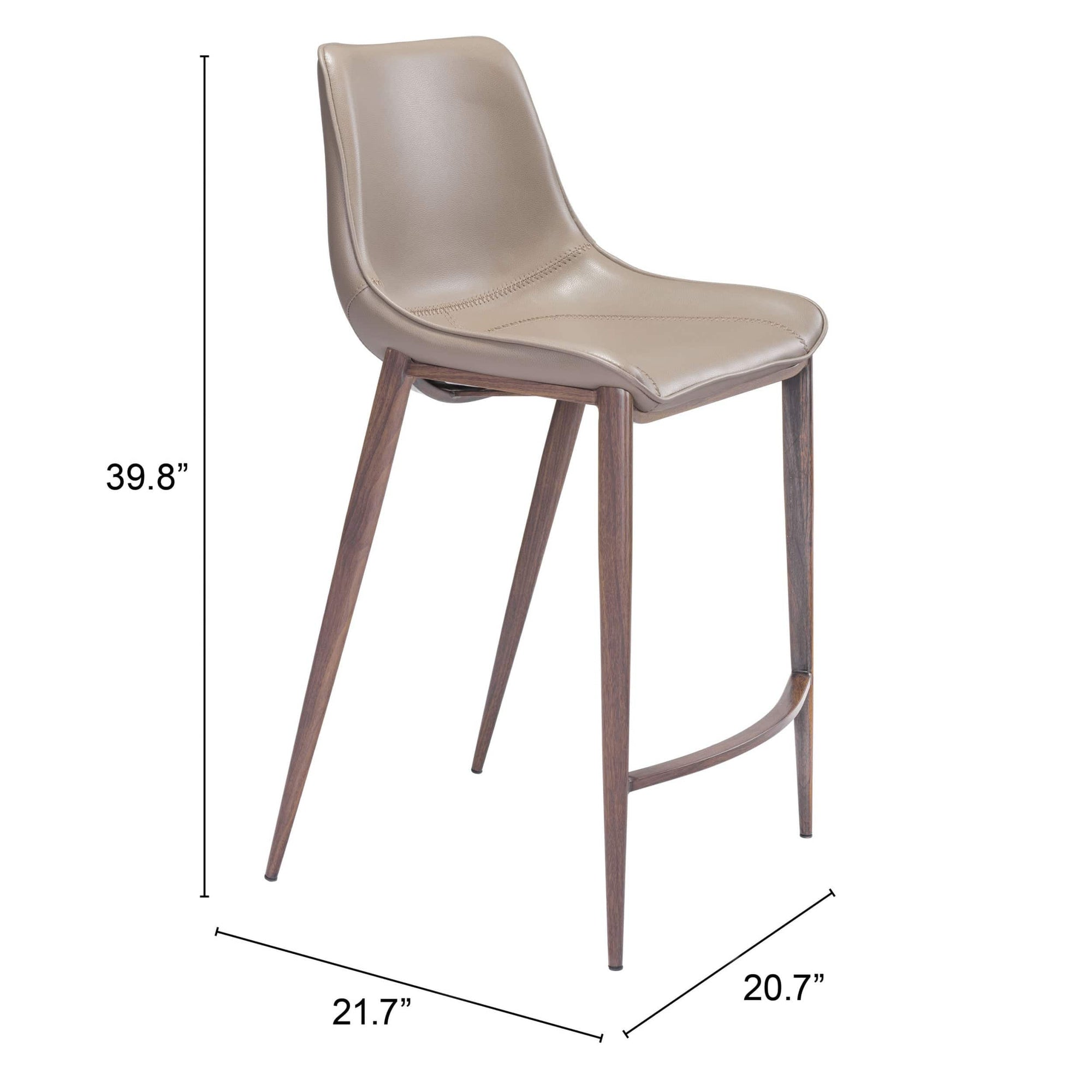 High design meets everyday casual. This handsome counter stool with its slim profile pulls up perfectly to the bar. Its super comfortable curved seat is covered in brown faux leather with dramatic stitching. Matte brown Faux Wood legs are complete with protective plastic feet to keep your floors scratch-free.