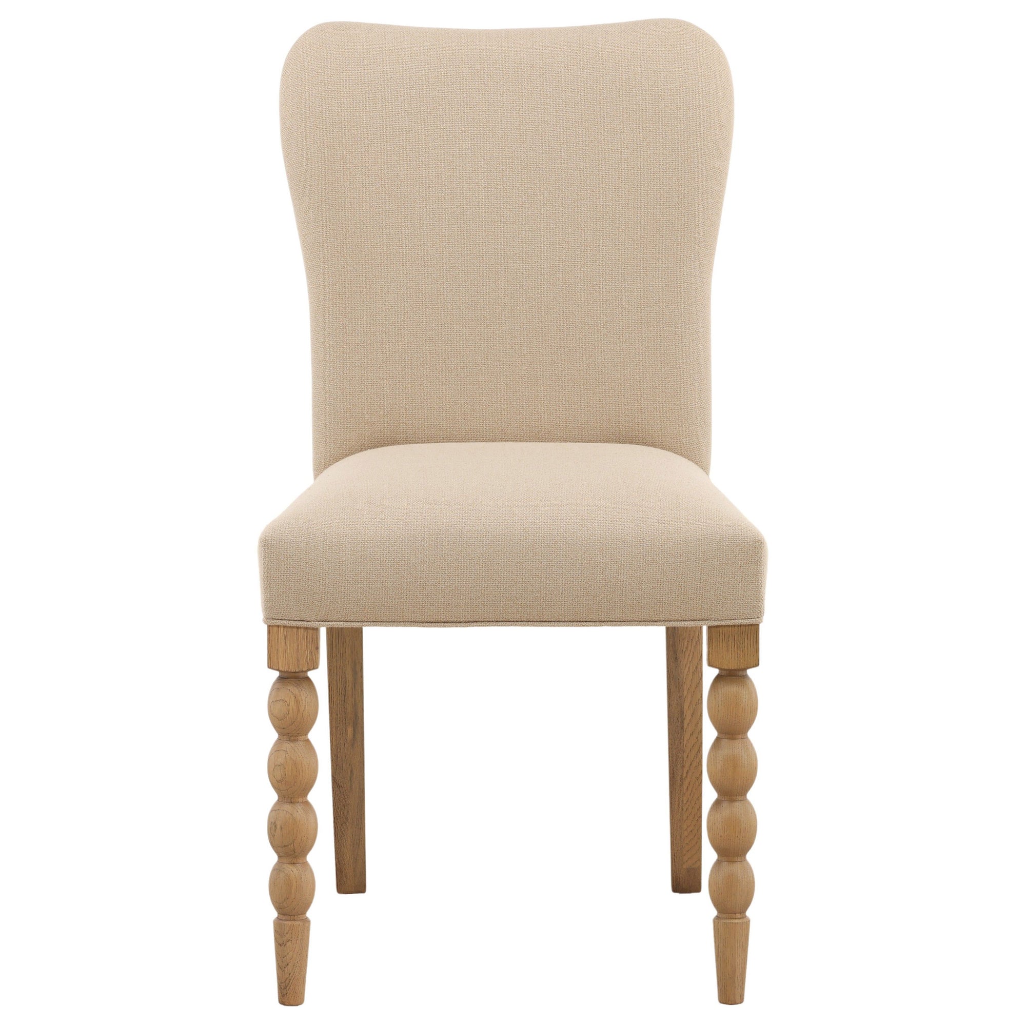 The Marcellina Dining Chair is an elegant piece combining the comfort of full upholstery with charming, traditional accents. It features a tall, gently curved back and a generously cushioned seat, all wrapped in a subtle basketweave fabric. The chair is supported by unique bobbin-turned front legs, adding a touch of artisanal style. Sold as a Set of 2, the Marcellina Dining Chair is a sophisticated addition to any dining setting.