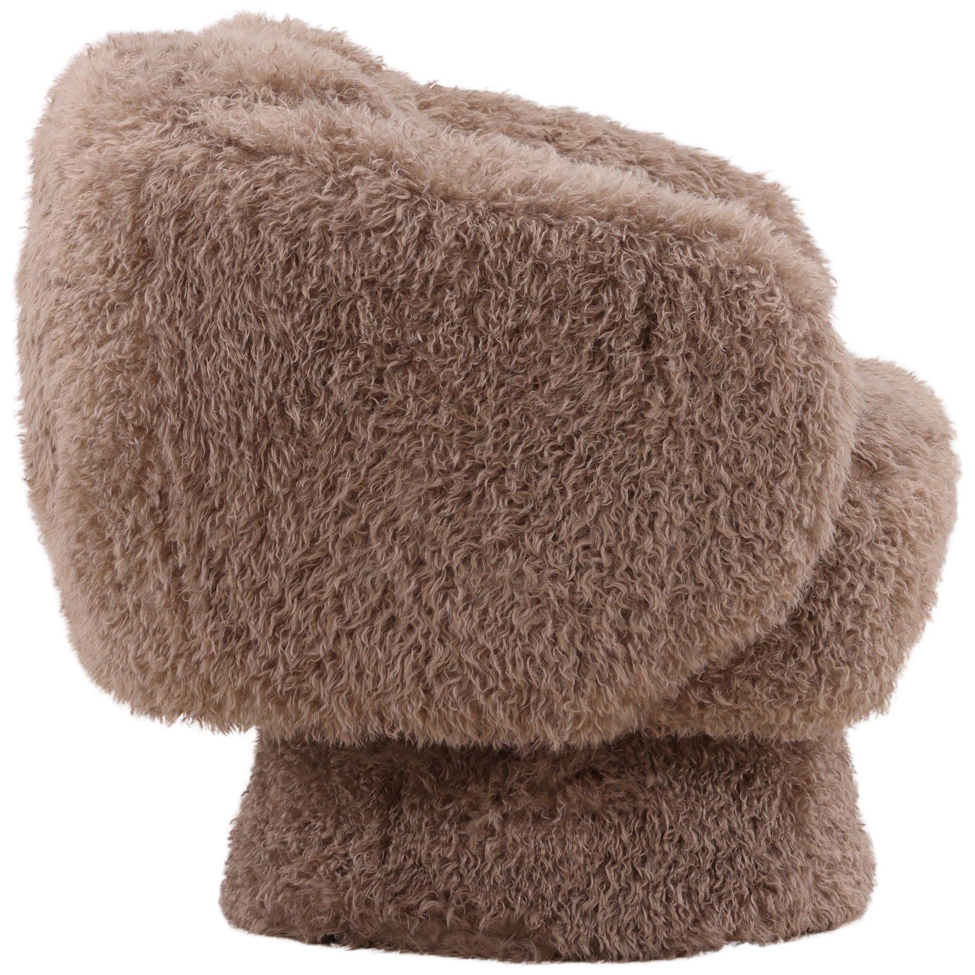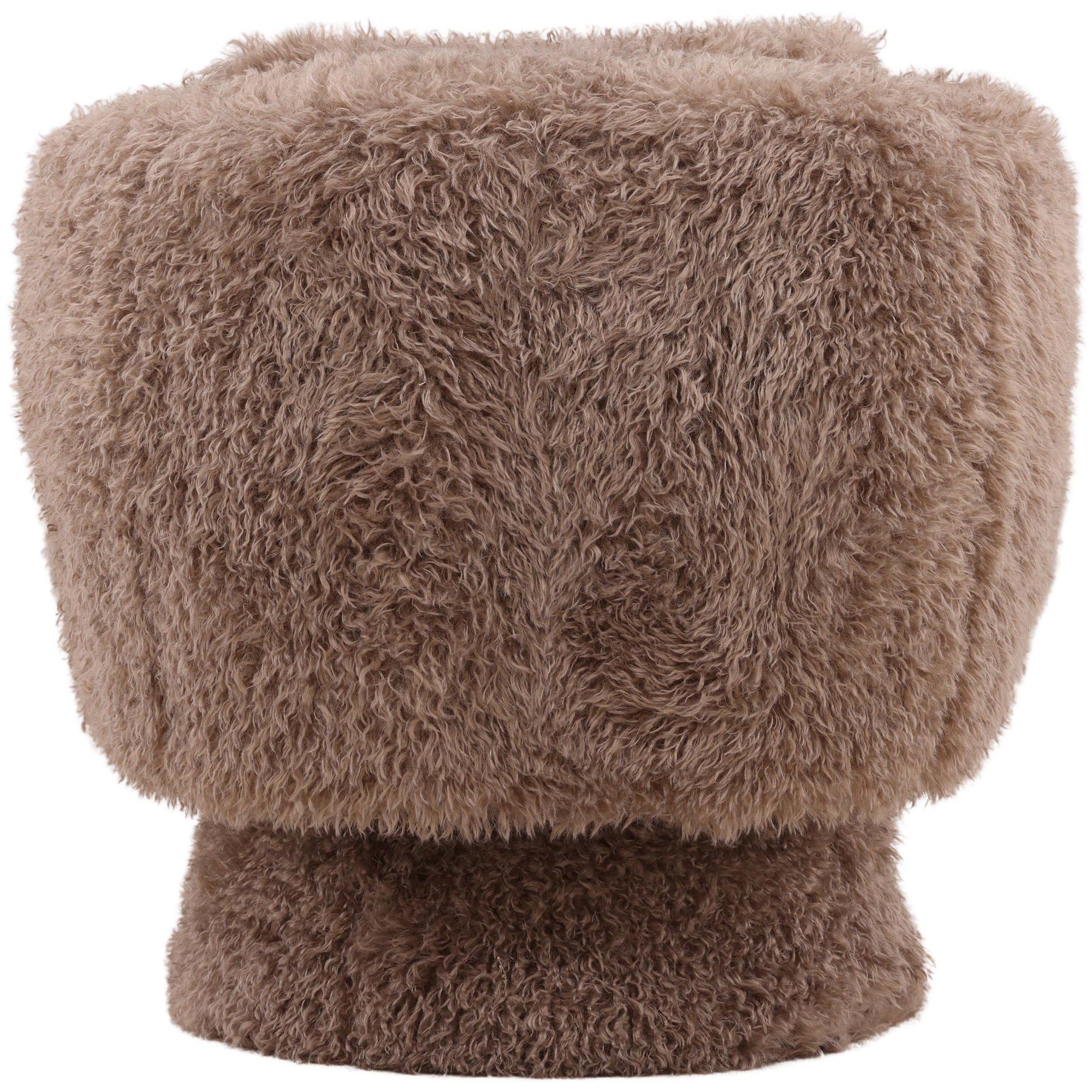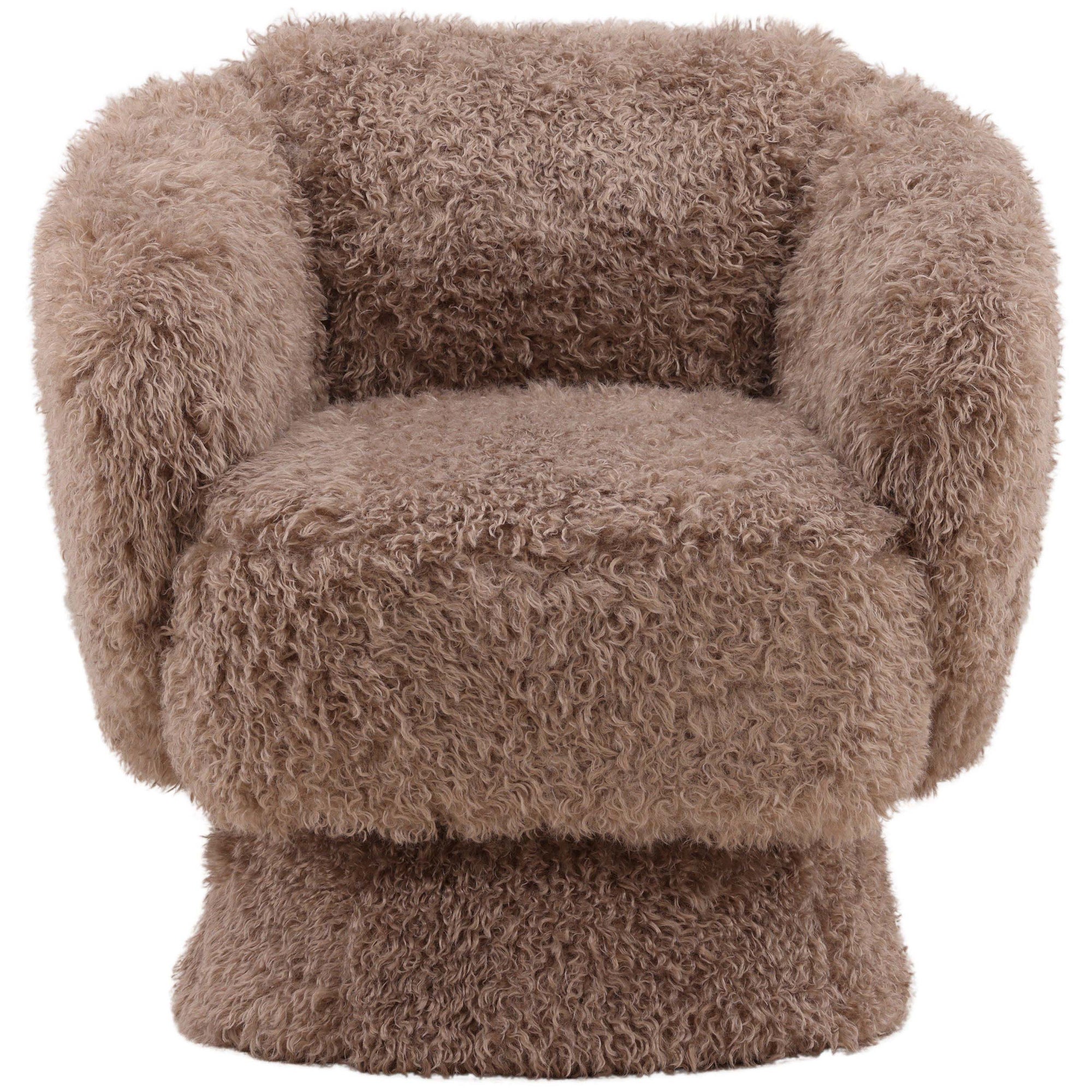 The Mariam Swivel Chair is a statement accent piece offering unmatched comfort with its deeply padded, rounded profile. Upholstered in a soft, plush faux fur fabric, this chair features fully wrapped arms and back, giving it a cozy, cocoon-like feel. The smooth, integrated swivel base allows for easy movement, making the Mariam Swivel Chair an inviting and stylish focal point in any contemporary space.