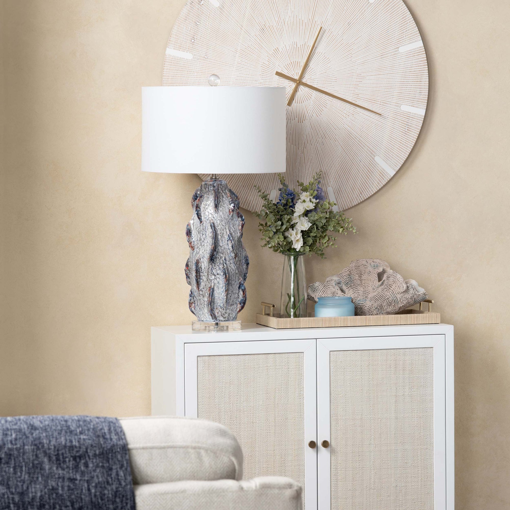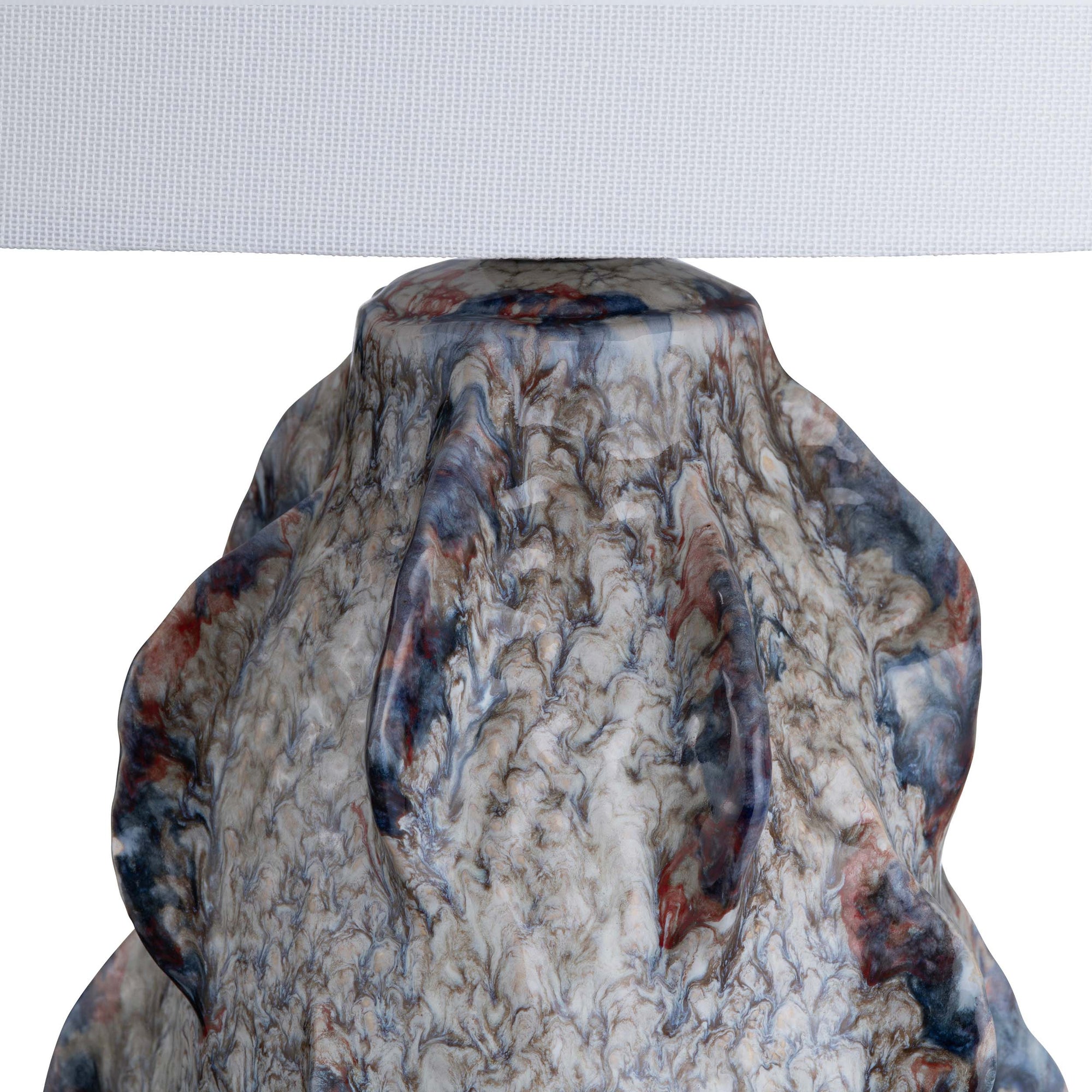 The Mercer Table Lamp features hand-molded undulating waves that create a striking dimensional design. Subtle varying shades of blue enhance its elegant form, making it a sophisticated focal point for any tabletop, shelf, or console in transitional interiors.