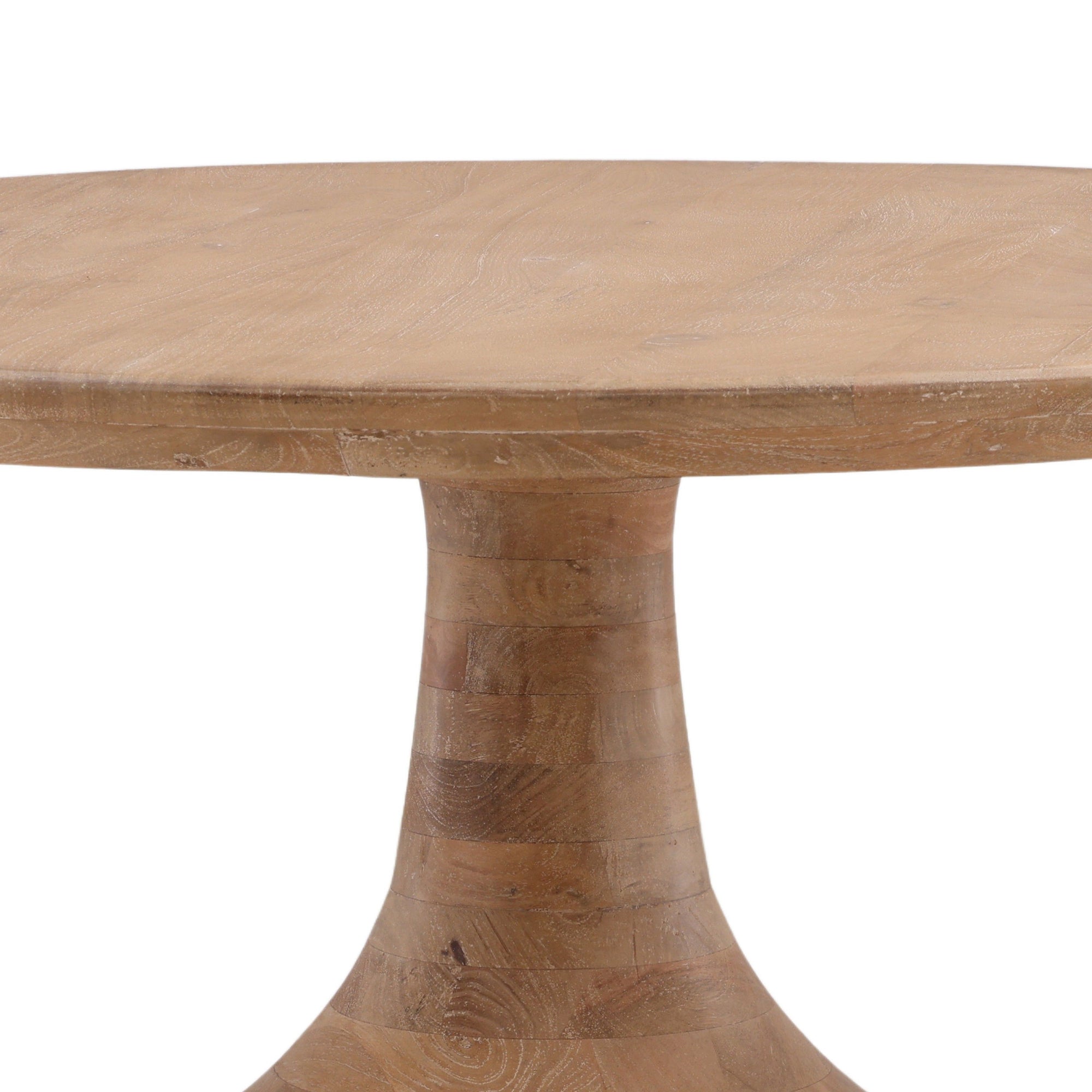 The Meylin Dining Table is a bold, sculptural centerpiece defined by its striking, architectural base. It features a simple, spacious round top with soft edges, ideal for intimate gatherings. The top is supported by a single, dramatic pedestal base that flares out at the center and bottom, creating a stacked bobbin-like shape with subtle ring details. The Meylin Dining Table offers a commanding and functional surface for dining with a unique, artistic touch.