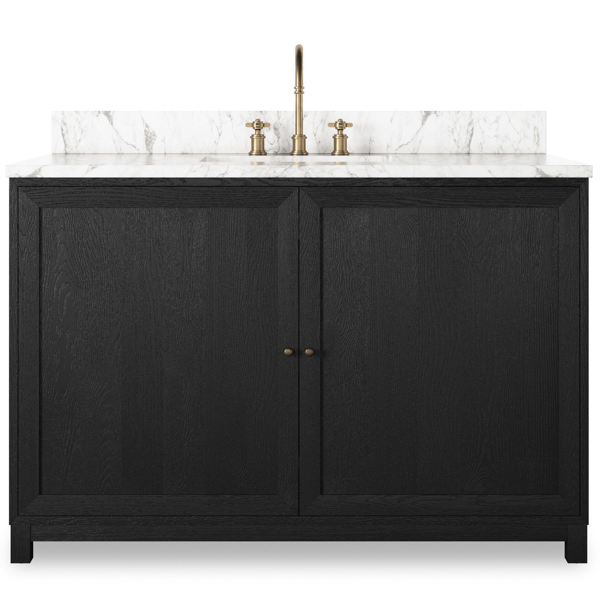 The Millie Single Wide Vanity combines sleek design with generous storage. Crafted with a thick oak veneer base, a Carrara marble top, and antique bronze iron hardware, it features spacious cabinets with removable shelves.