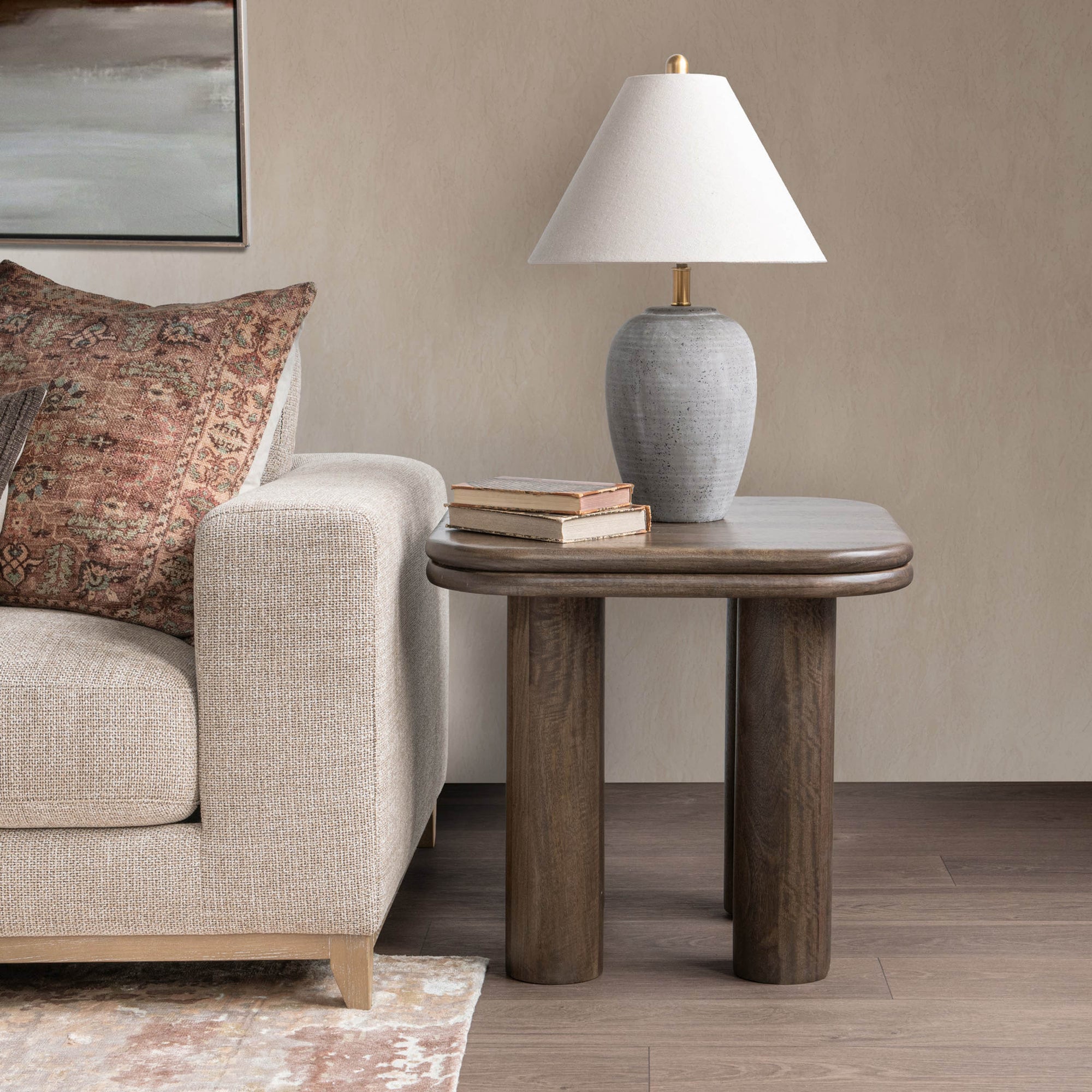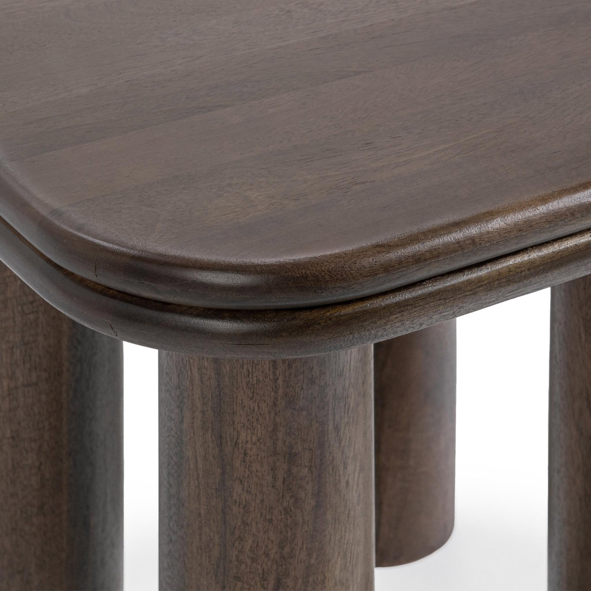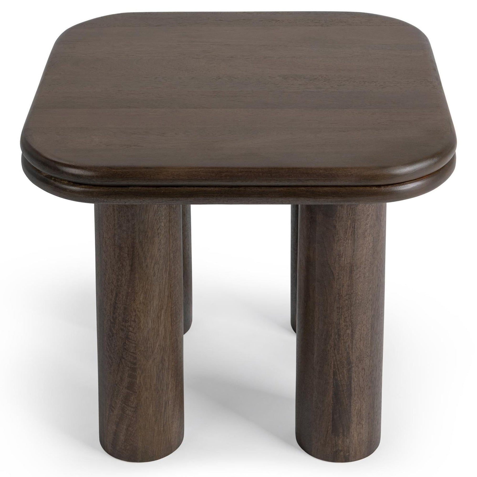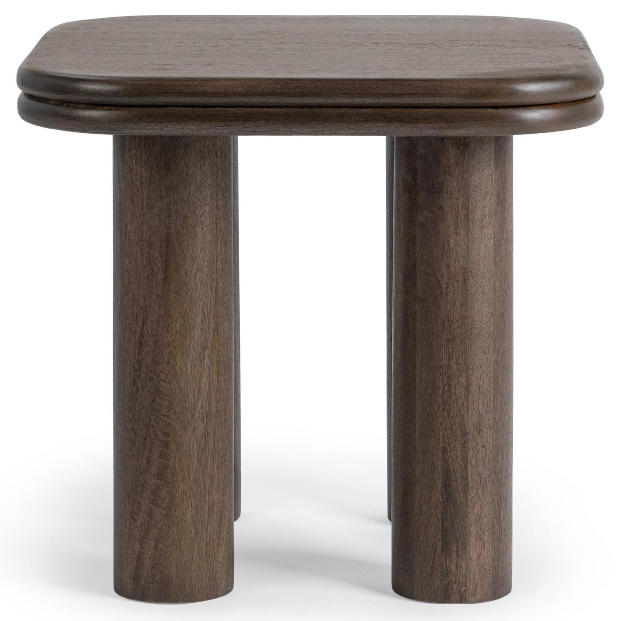 The Miranda End Table enhances your space with modern design and natural charm. Featuring a smooth square top with rounded edges, it highlights the rich grain and character of solid wood. Supported by bold cylindrical legs, this piece combines durability with contemporary style, serving as a functional accent.