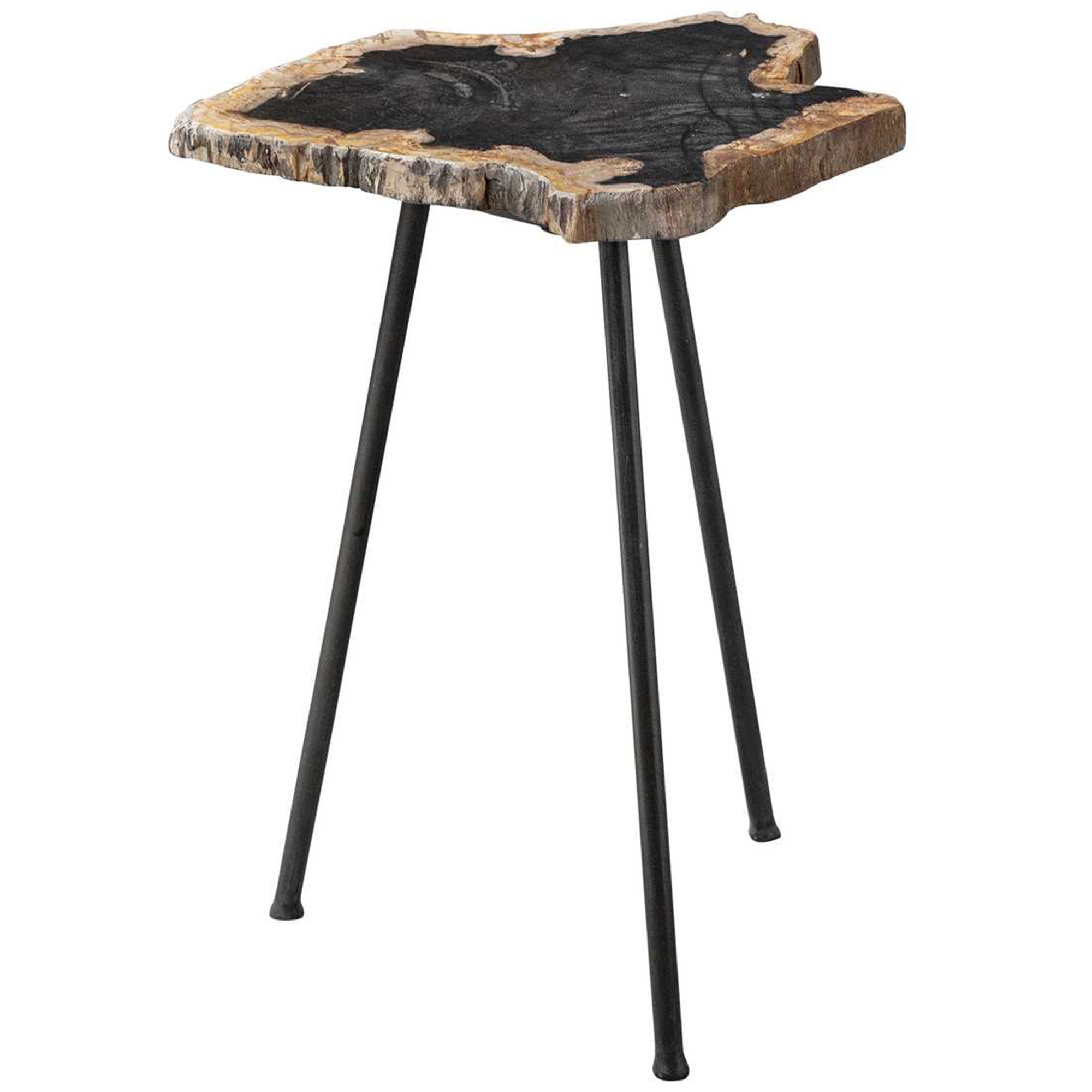 The Mircea Accent Table brings a striking, organic element to any room with its authentic petrified wood top. This piece features a unique cross-section of natural petrified wood, showcasing intricate graining details that make each table one-of-a-kind. The top is supported by slender, aged black finished iron legs in a minimalist tripod design.