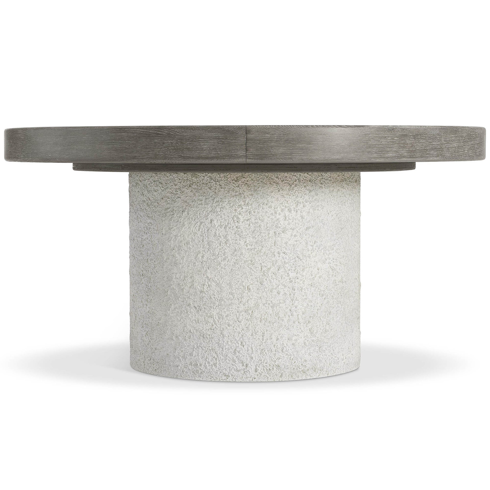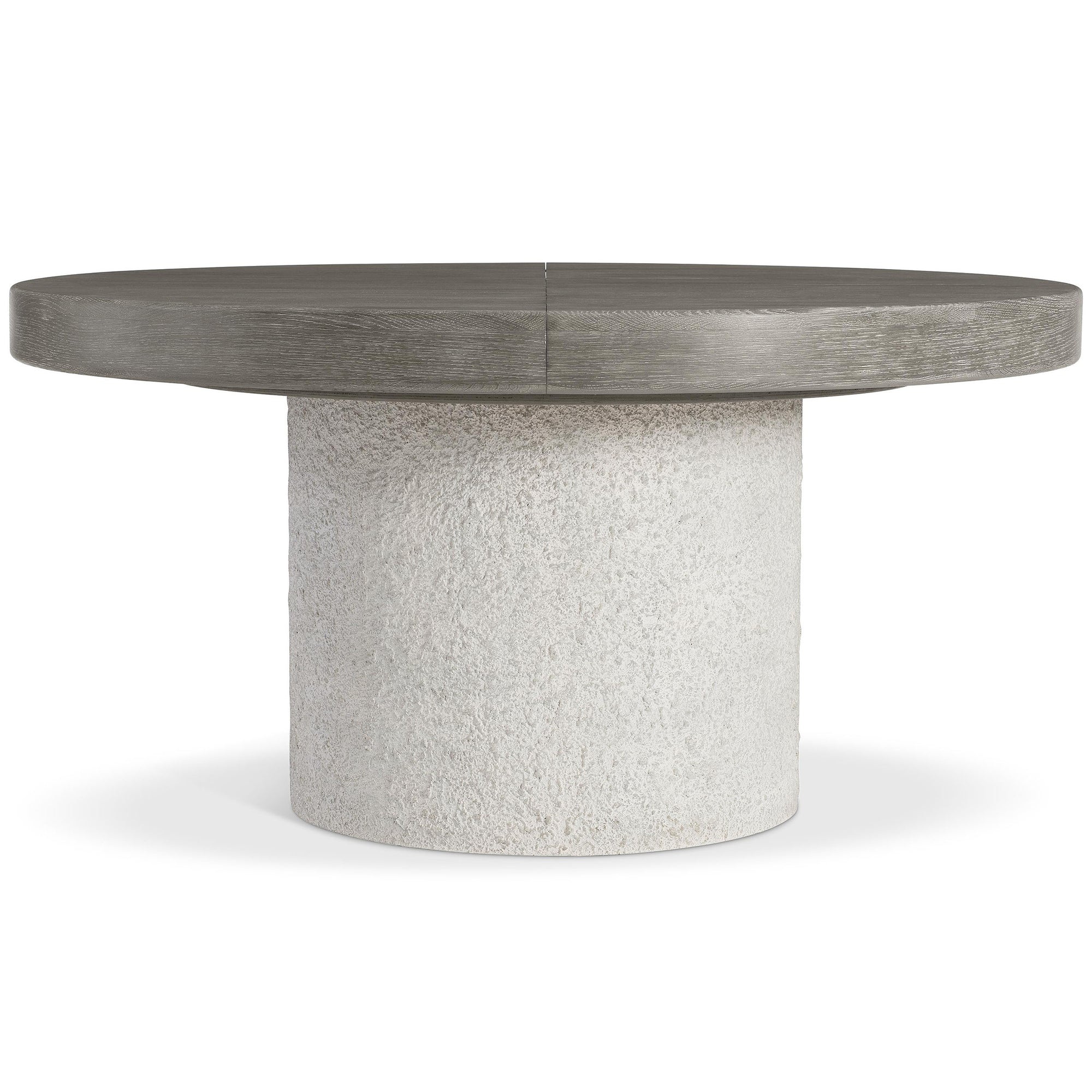 The Monolith Round Dining Table redefines simplicity with bold texture and striking form. A sculptural faux stone pedestal in Millstone finish anchors the round wirebrushed oak top in Puma finish. Designed for versatility, a 20-inch leaf transforms the round surface into an elegant oval, ideal for both intimate meals and larger gatherings.