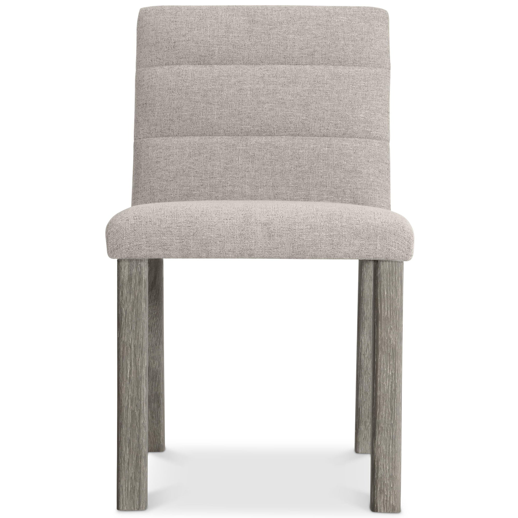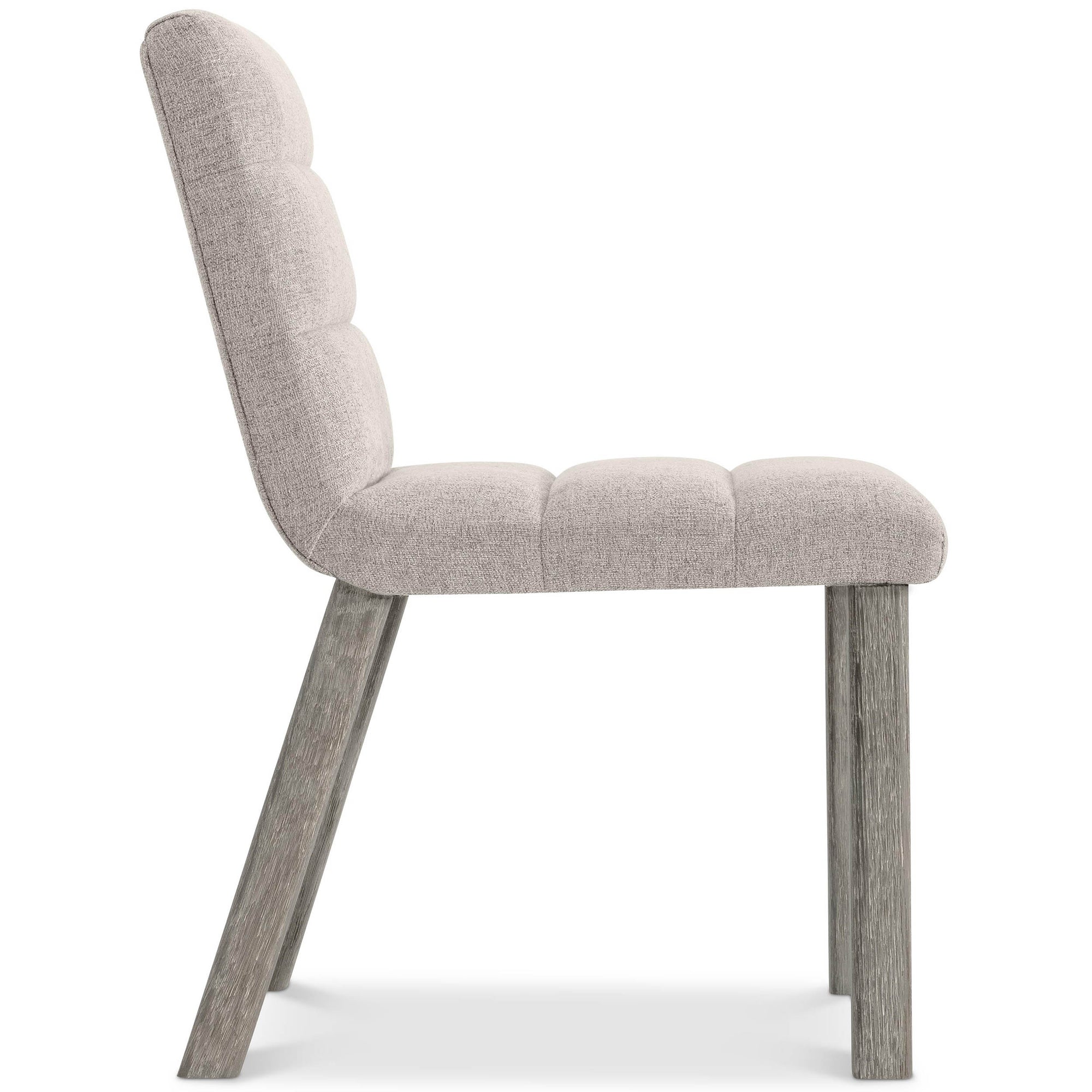 The Monolith Side Chair (Set of 2) blends modern organic design with refined comfort. Upholstered in performance fabric with horizontal channeling across the seat and back, this chair rests on a wirebrushed oak base in Puma finish. The angular rear legs add a sculptural edge, making this piece ideal for both casual and formal dining spaces.