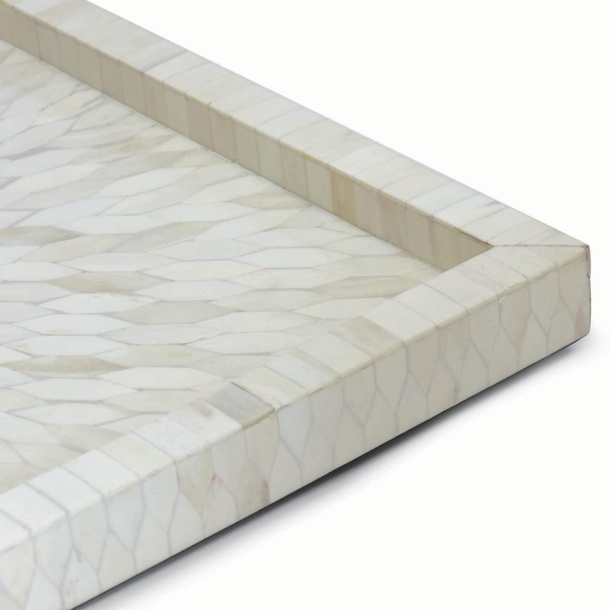 Handcrafted in India, the Montara Bone Tray showcases a creamy white mosaic bone veneer in an intricate floral pattern, combining artistry with functionality. Its versatile design makes it perfect for serving wine and cheese, displaying cherished trinkets, or arranging candles to create ambiance. Elegant and eye-catching, this decorative tray brings timeless charm and style to any tabletop or entertaining space.