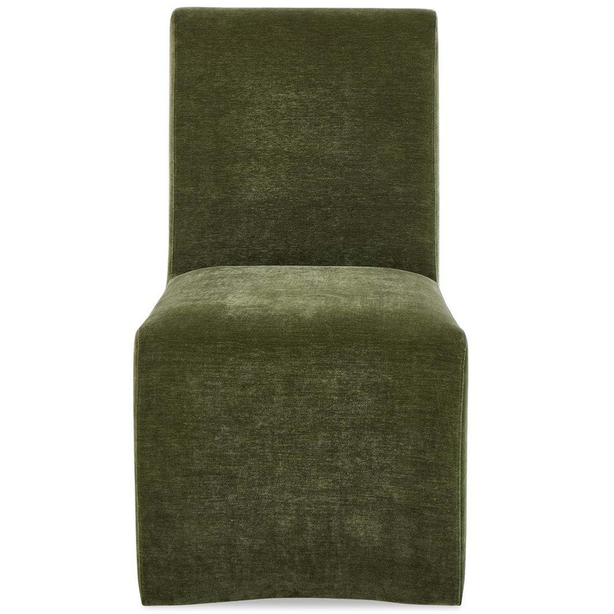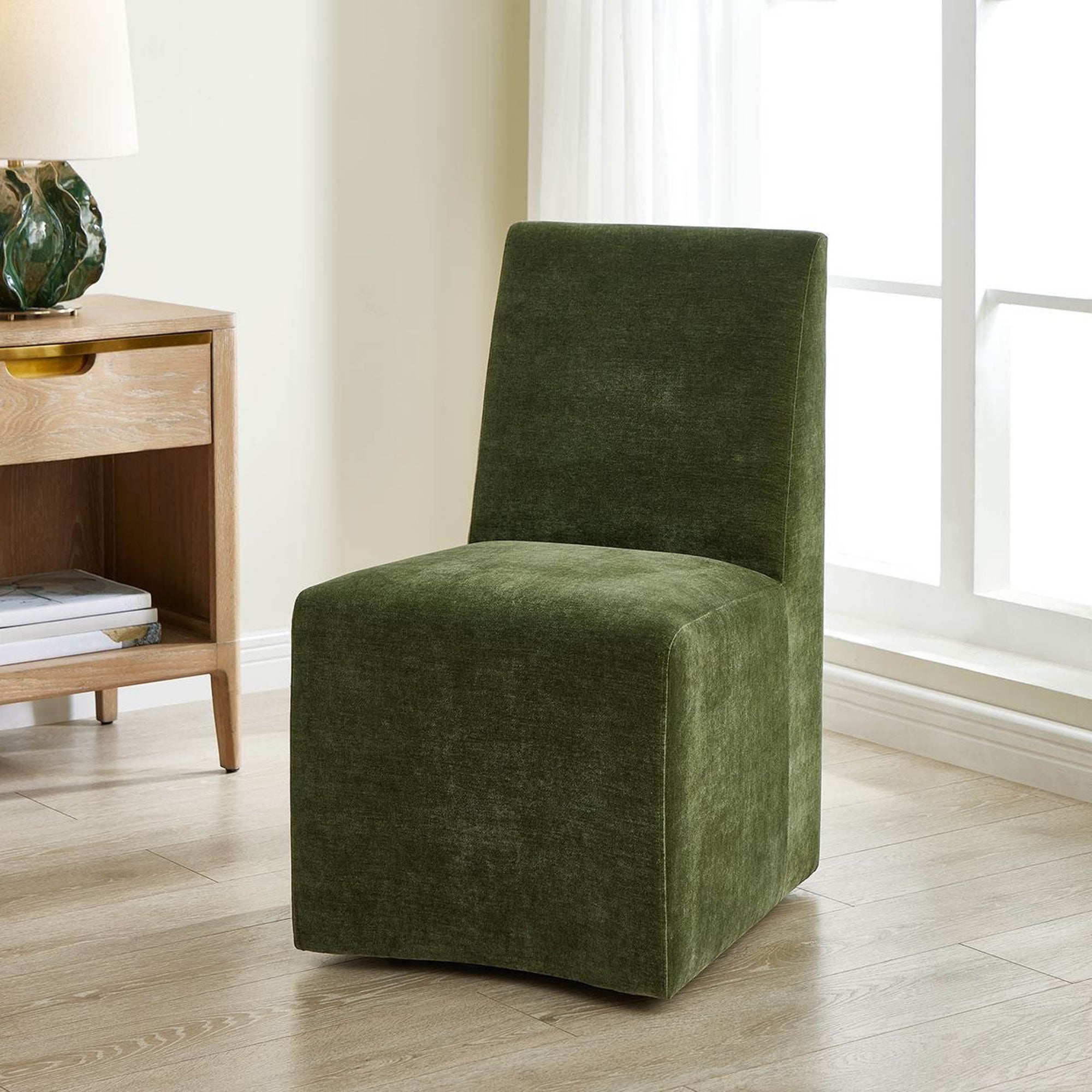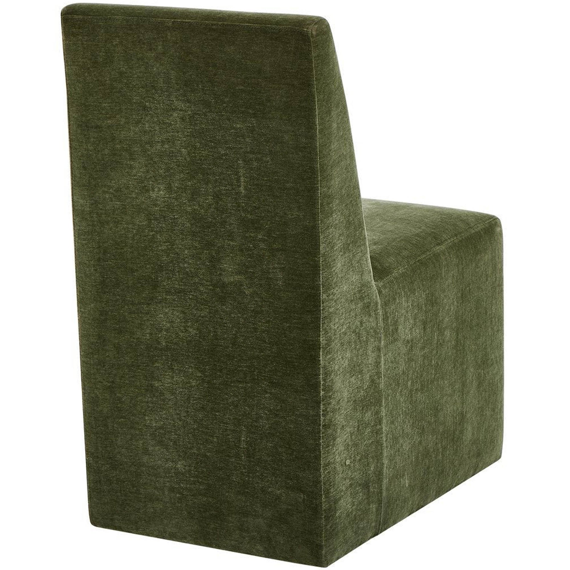 The Moro Dining Chair is a study in modern simplicity, featuring an armless slipper-style silhouette fully upholstered in plush distressed velvet for a soft, inviting look. Designed for both comfort and functionality, this chair is equipped with smooth-rolling casters for easy mobility, making it a practical and elegant addition to any dining space.