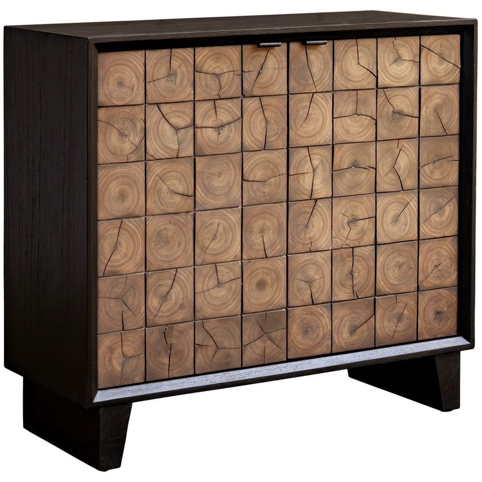 The Muestra 2 Door Cabinet features a clean rectangular silhouette that brings a bold architectural presence to any living space or hallway. It showcases a broad flat top surface, providing a secure and functional area for displaying decorative accents. The facade is characterized by two large cabinet doors adorned with a distinctive grid pattern of inset circular sections. This intricate mosaic texture provides a striking contrast against the smooth minimalist frame. The structure is supported by four short tapered legs that ensure stability while maintaining a refined profile. This well proportioned design effortlessly merges organic textures with practical storage utility to anchor a contemporary interior.