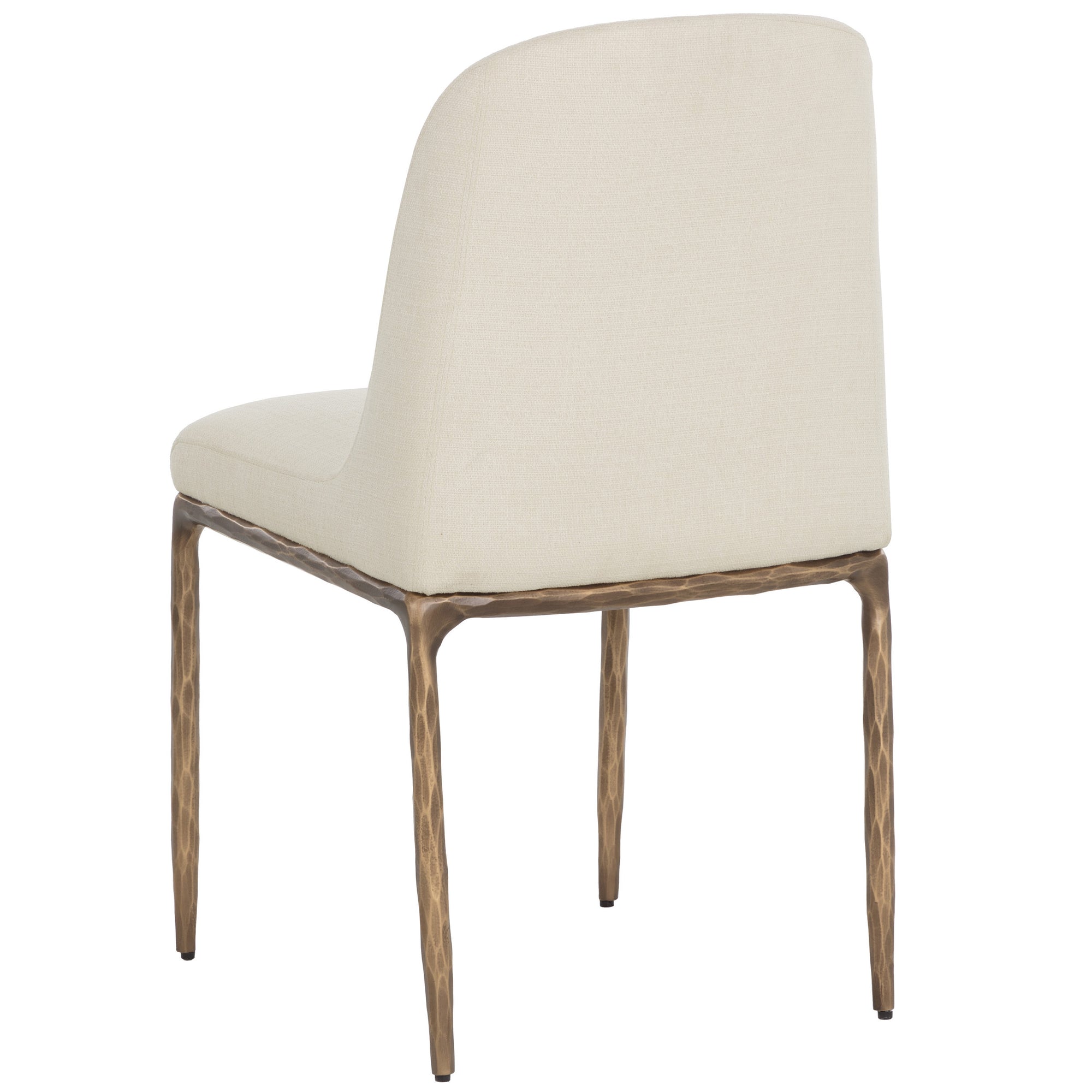 The Nestor Dining Chair offers a refined balance of comfort and modern style. With a softly curved back and plush seat upholstered in performance fabric, it provides a clean yet welcoming profile. Slender steel legs with hammered detailing and an antique brass finish lend an artisanal touch while ensuring durability. Designed for everyday dining, the Nestor Dining Chair combines resilience, comfort, and timeless appeal.