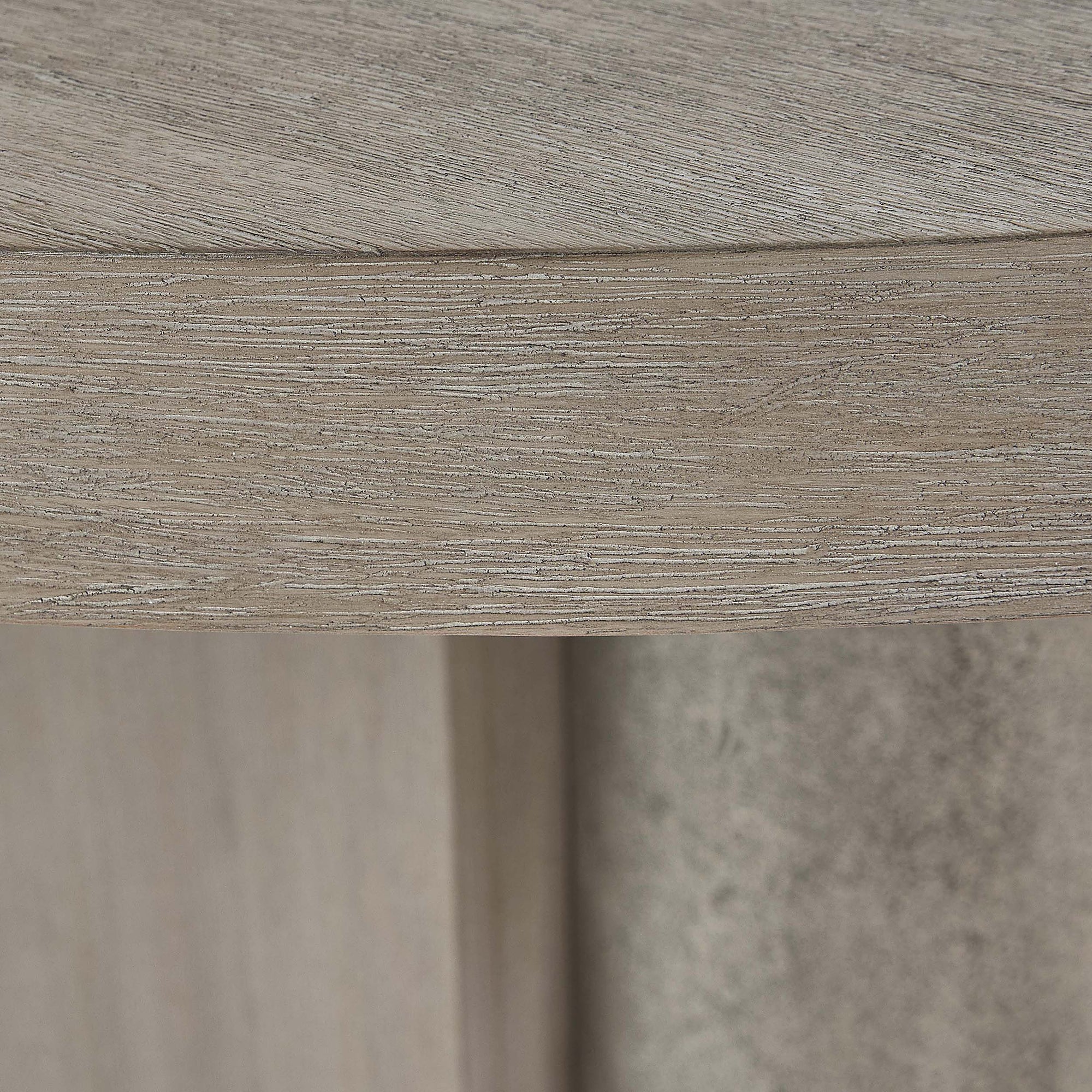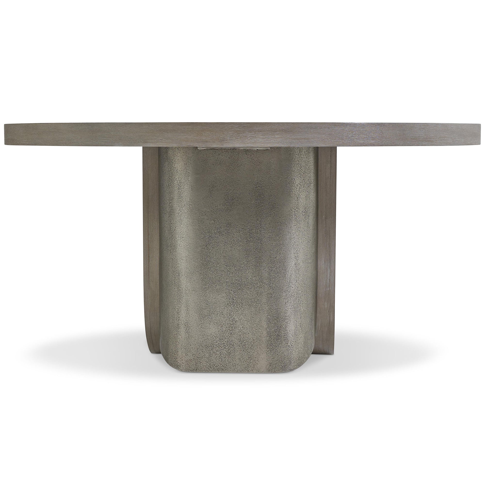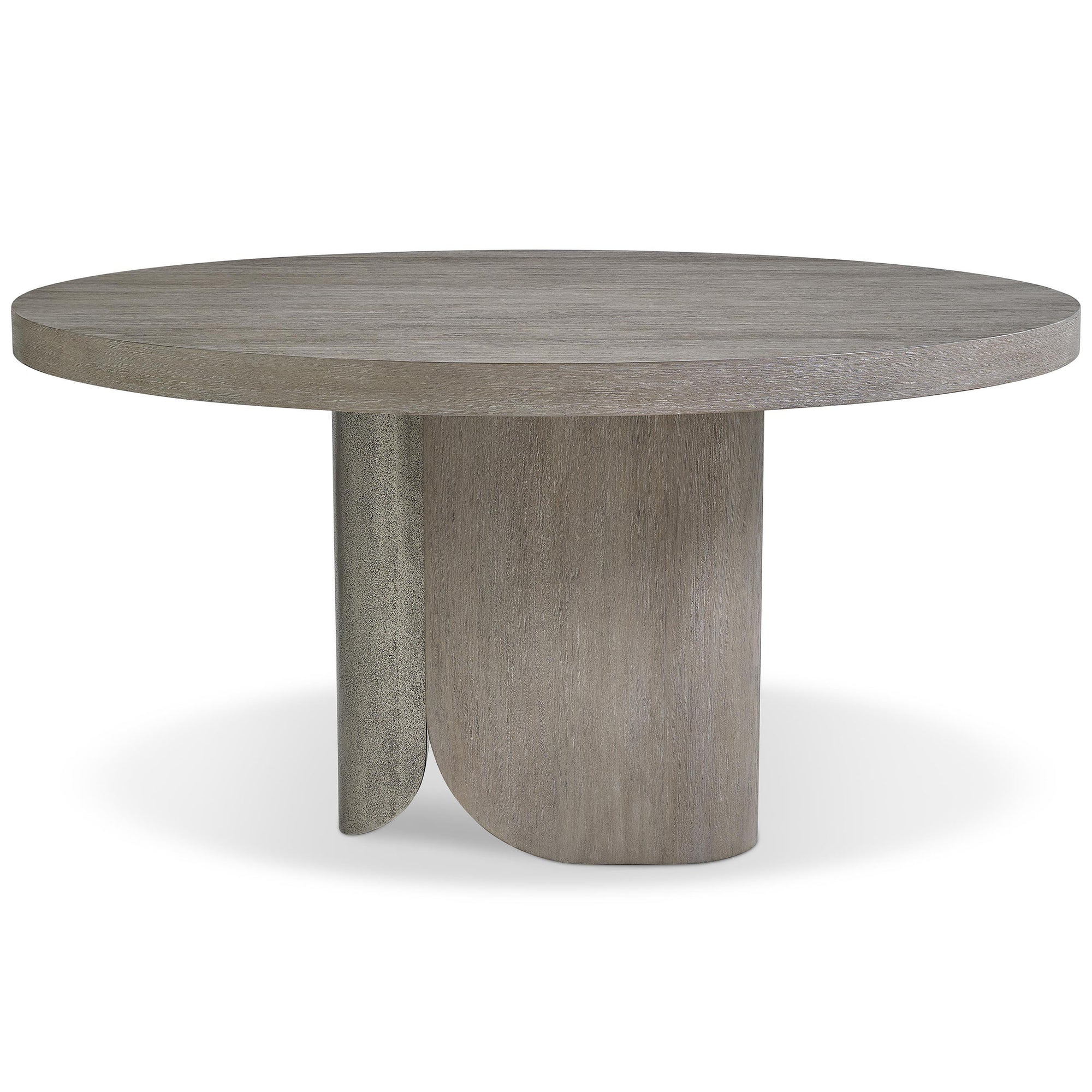The Nexus Round Dining Table delivers bold architectural presence with an artful blend of materials. A round mahogany top in a rich Forry finish rests on a striking asymmetrical base-one side sculpted from wood, the other a sleek cast aluminum column in Graphite. Its balanced contrast adds a refined modern edge to any dining setting.