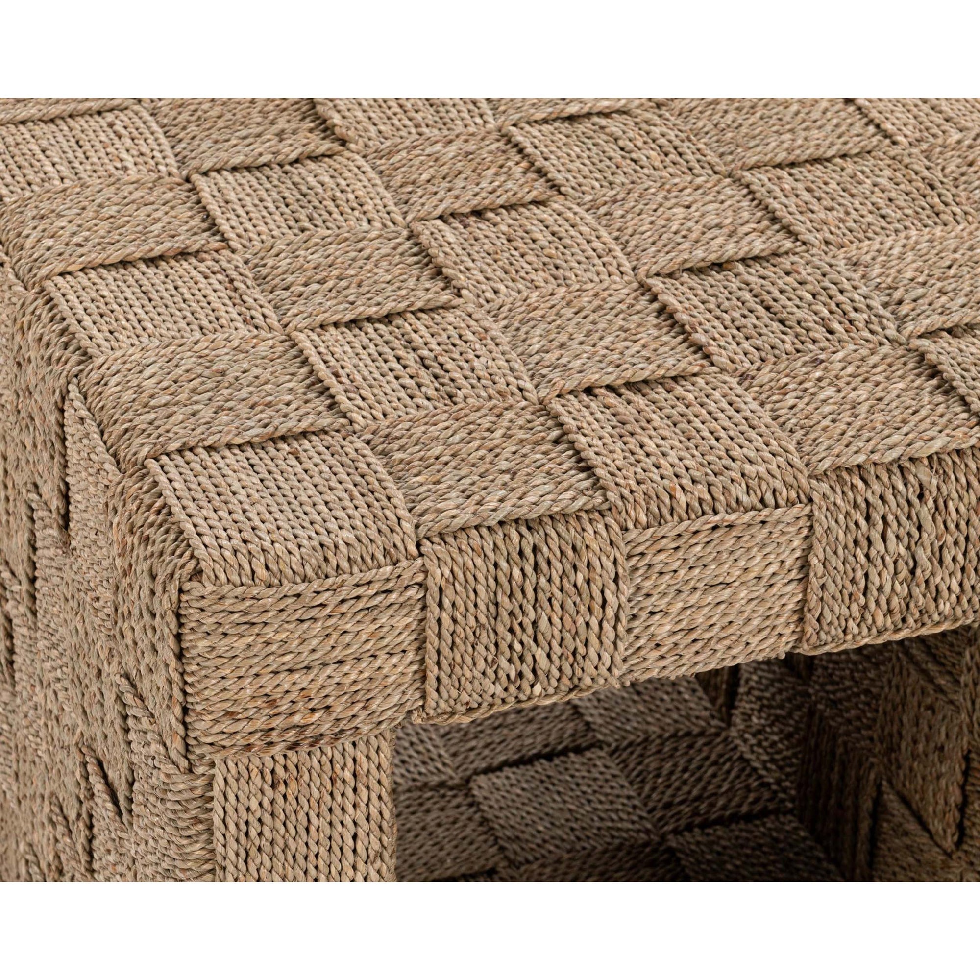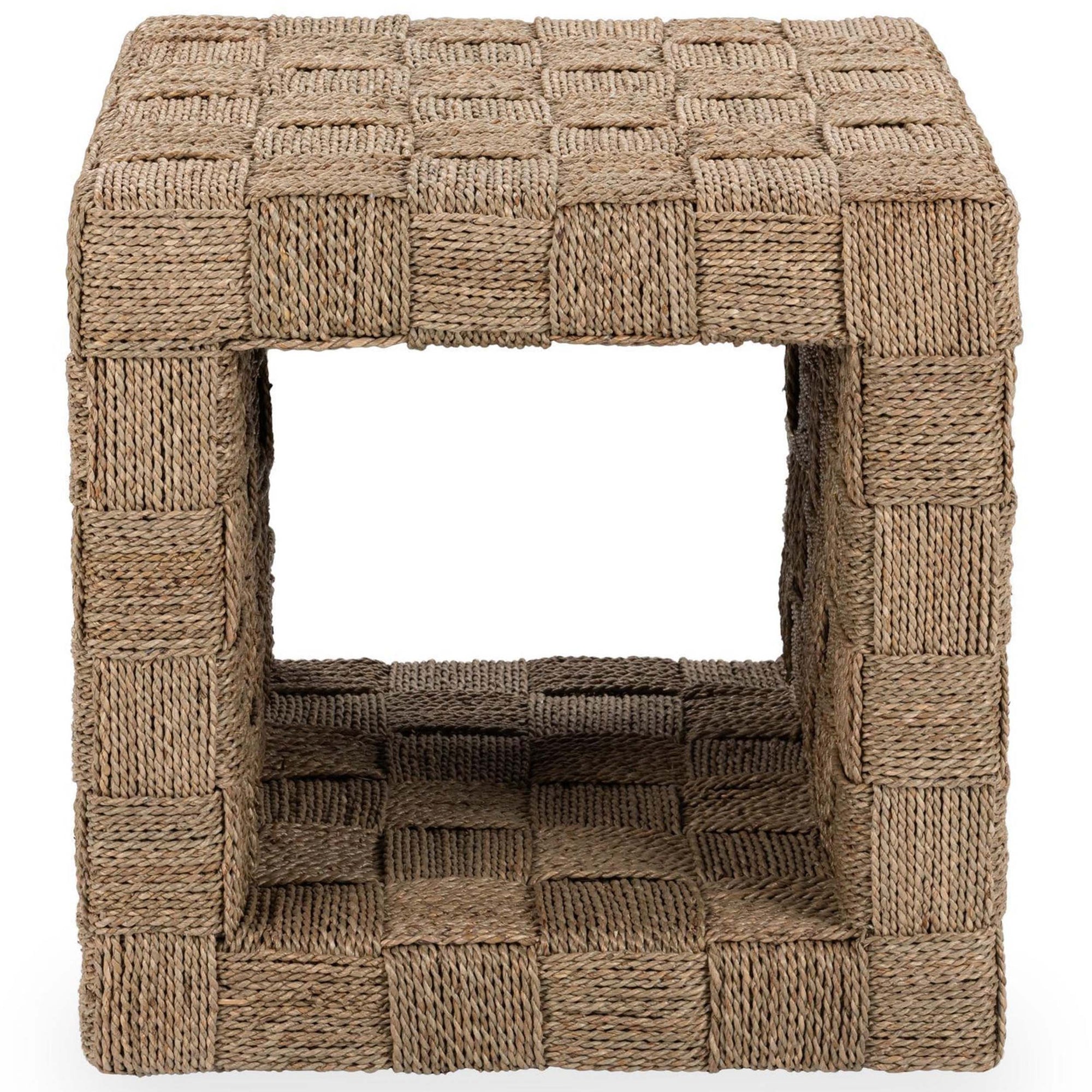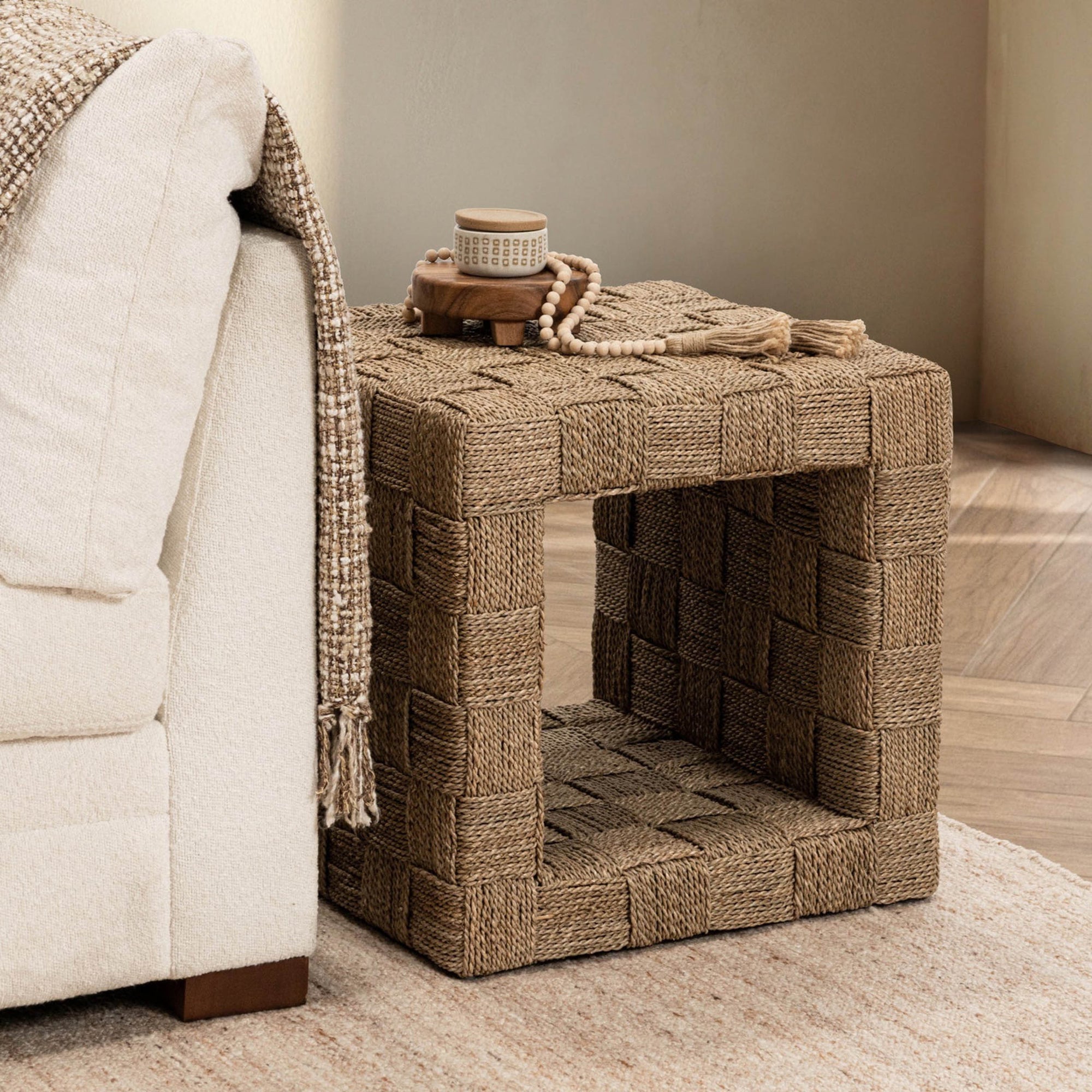The Neyla Square End Table brings nature indoors with artisan craftsmanship and organic texture. Handwoven seagrass wraps a sturdy mahogany and plywood frame, forming a geometric cube that exudes warmth and balance. Its basket-weave design and open structure lend an airy sophistication, perfect as a side table, nightstand, or accent piece in living rooms, bedrooms, or coastal-inspired spaces.