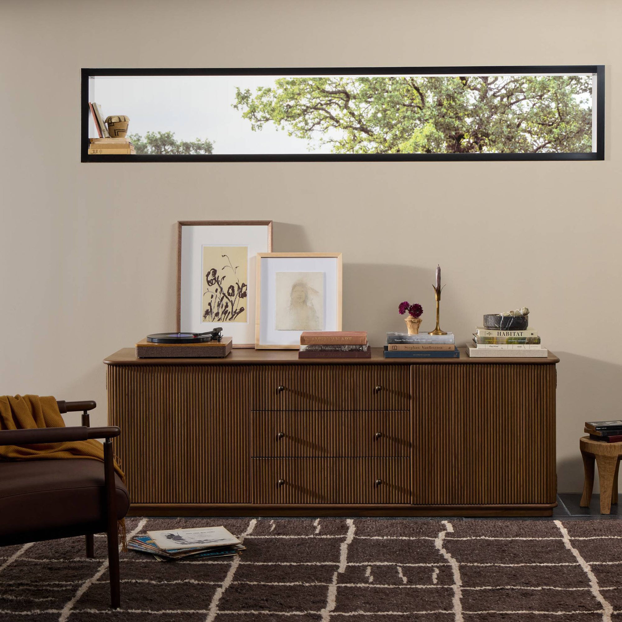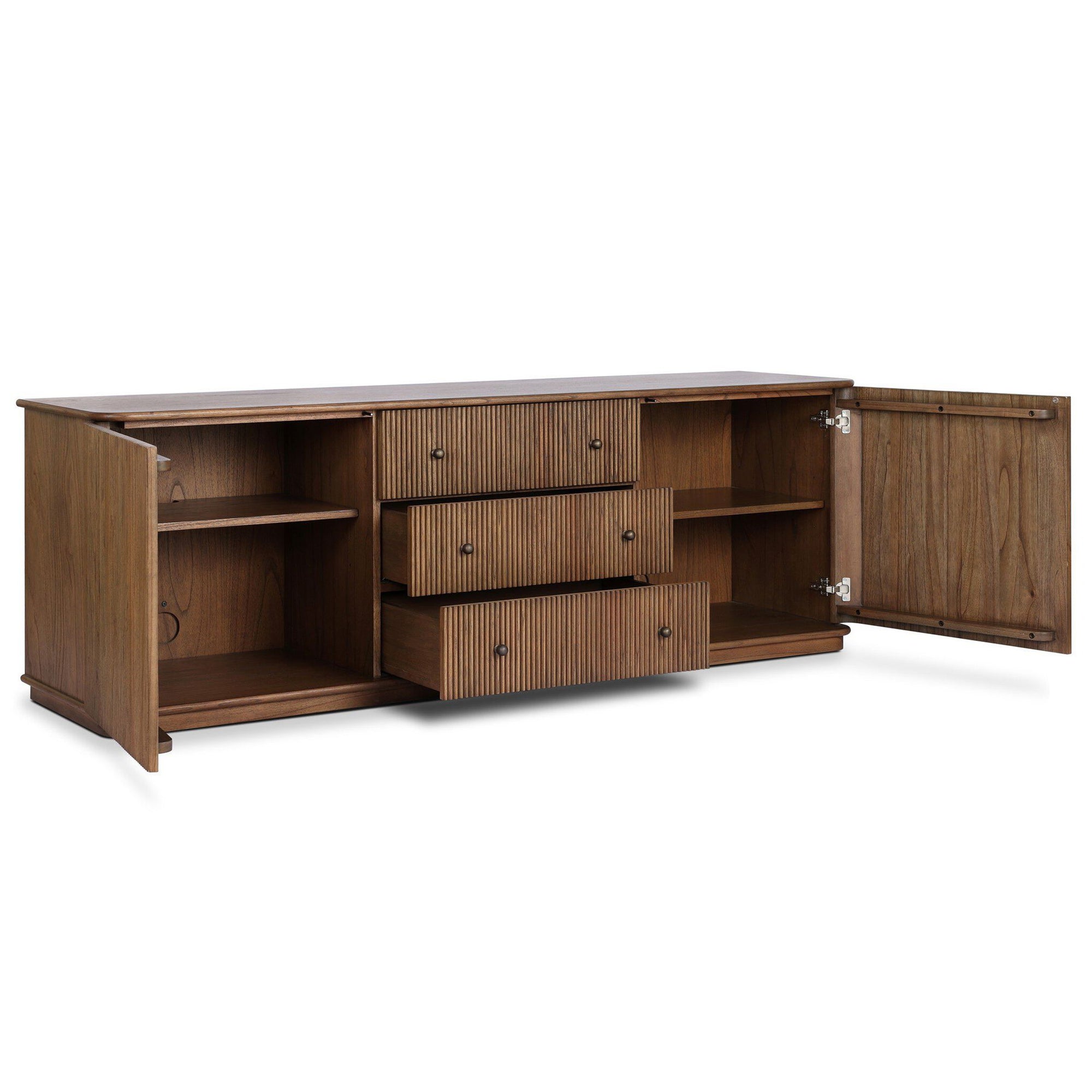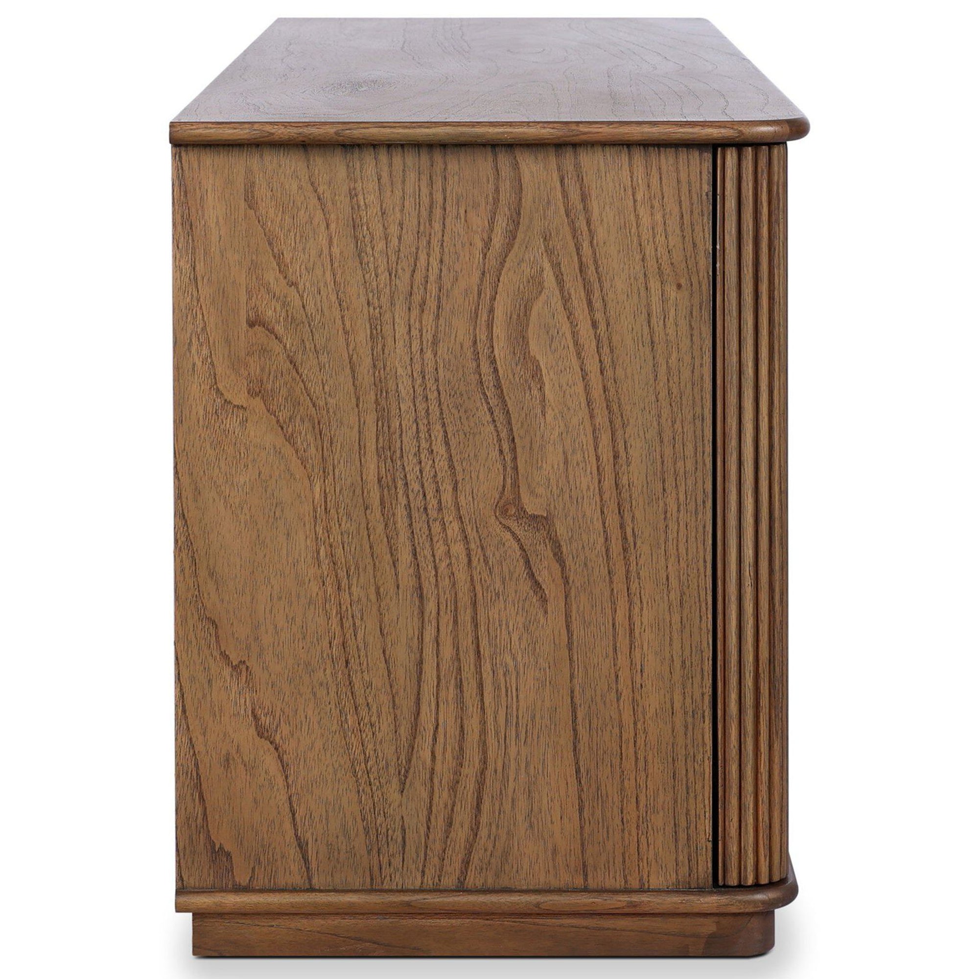 The Ona Media Console showcases refined craftsmanship and texture. Constructed from mindi wood with a plinth-style base, a stunning reeding pattern is carved into the surface, giving this media piece a fresh and approachable look. A spacious interior and an amber oak finish complete the sculptural form, providing ample storage for your media needs.