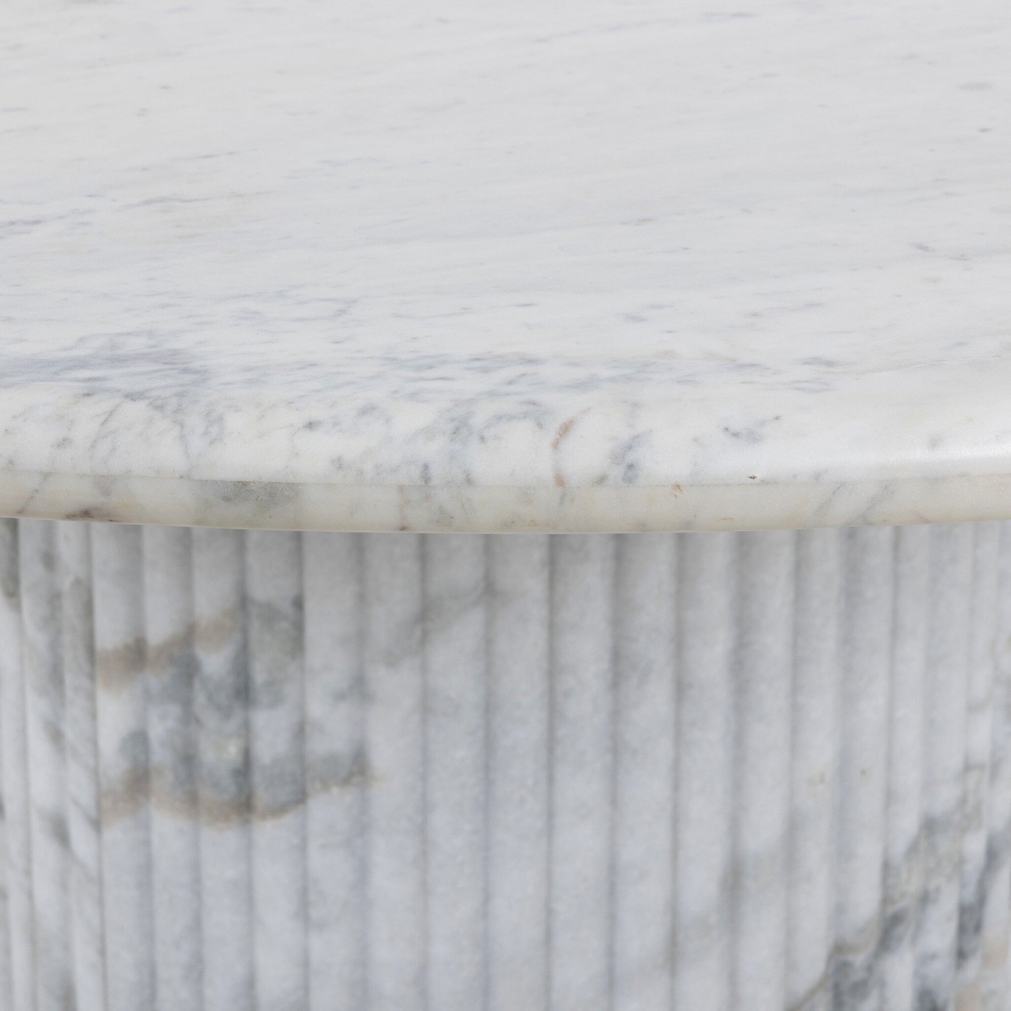 The Oranda 60" Round Dining Table is inspired by classic Italian design. It features a swirling marble base that is beautifully scalloped, creating a linear look with heavy texture. The base is topped with a large, rounded tabletop of polished white marble, offering a sophisticated and dramatic centerpiece for your dining room.