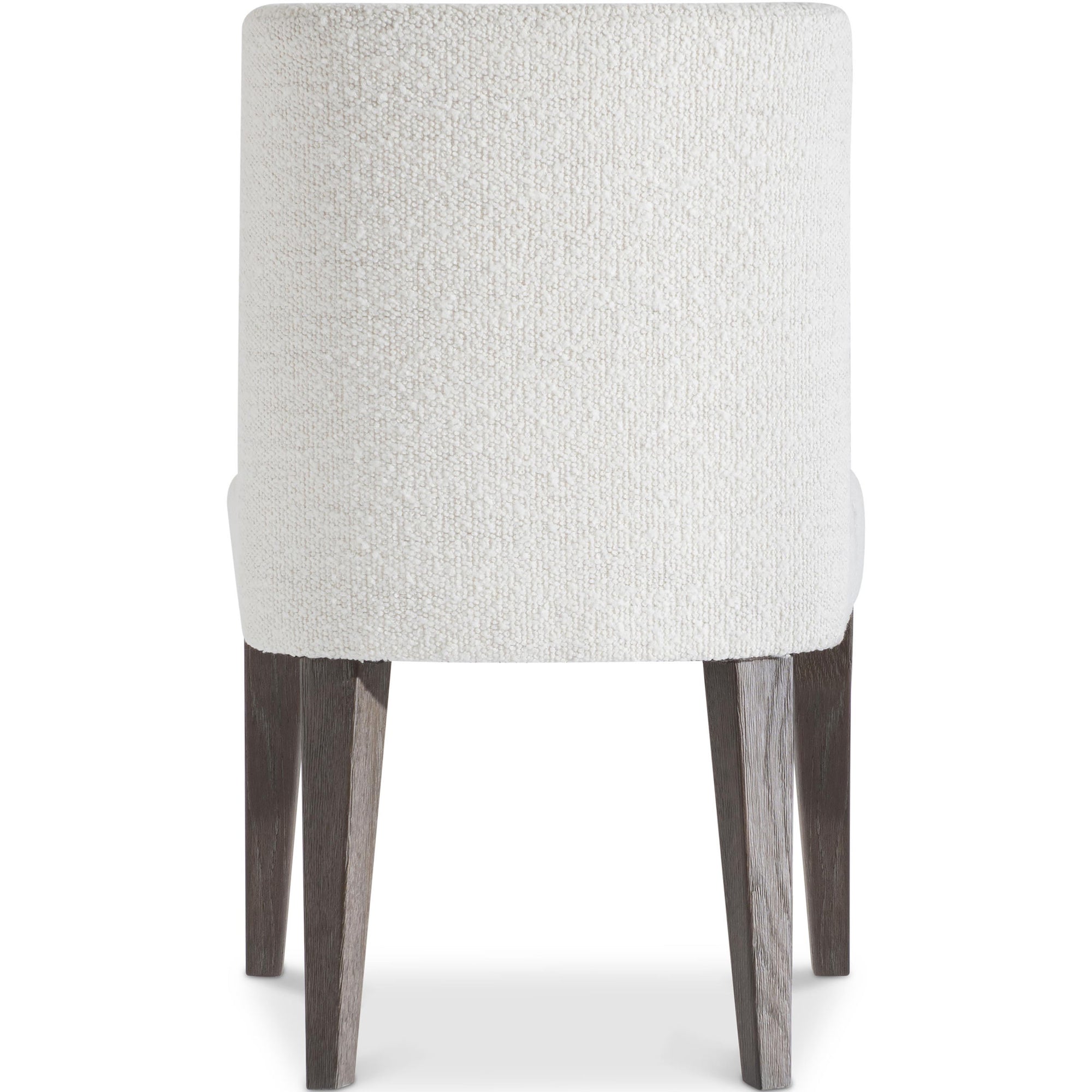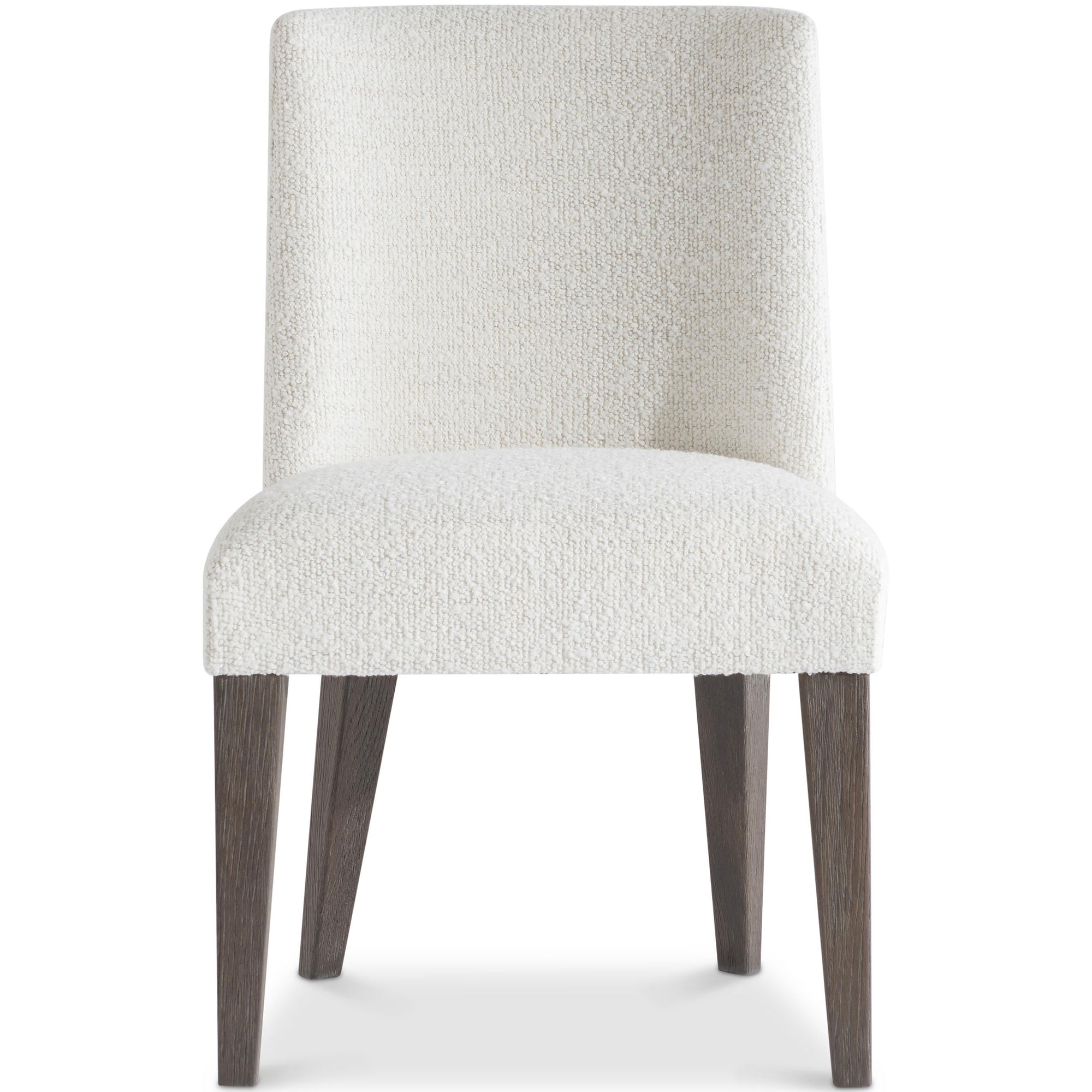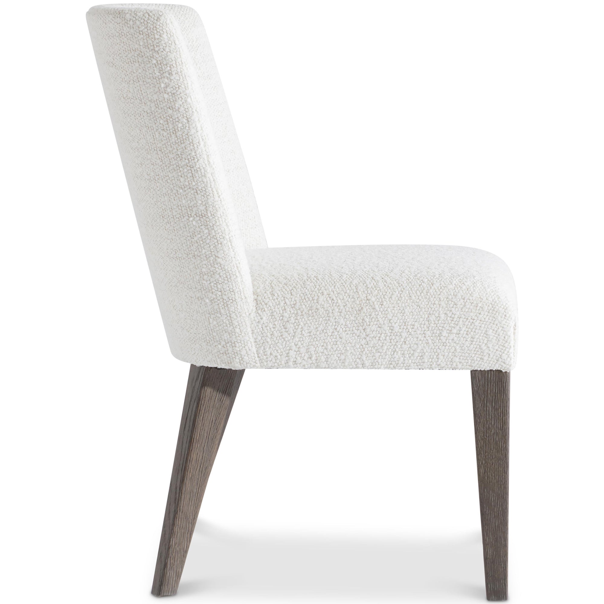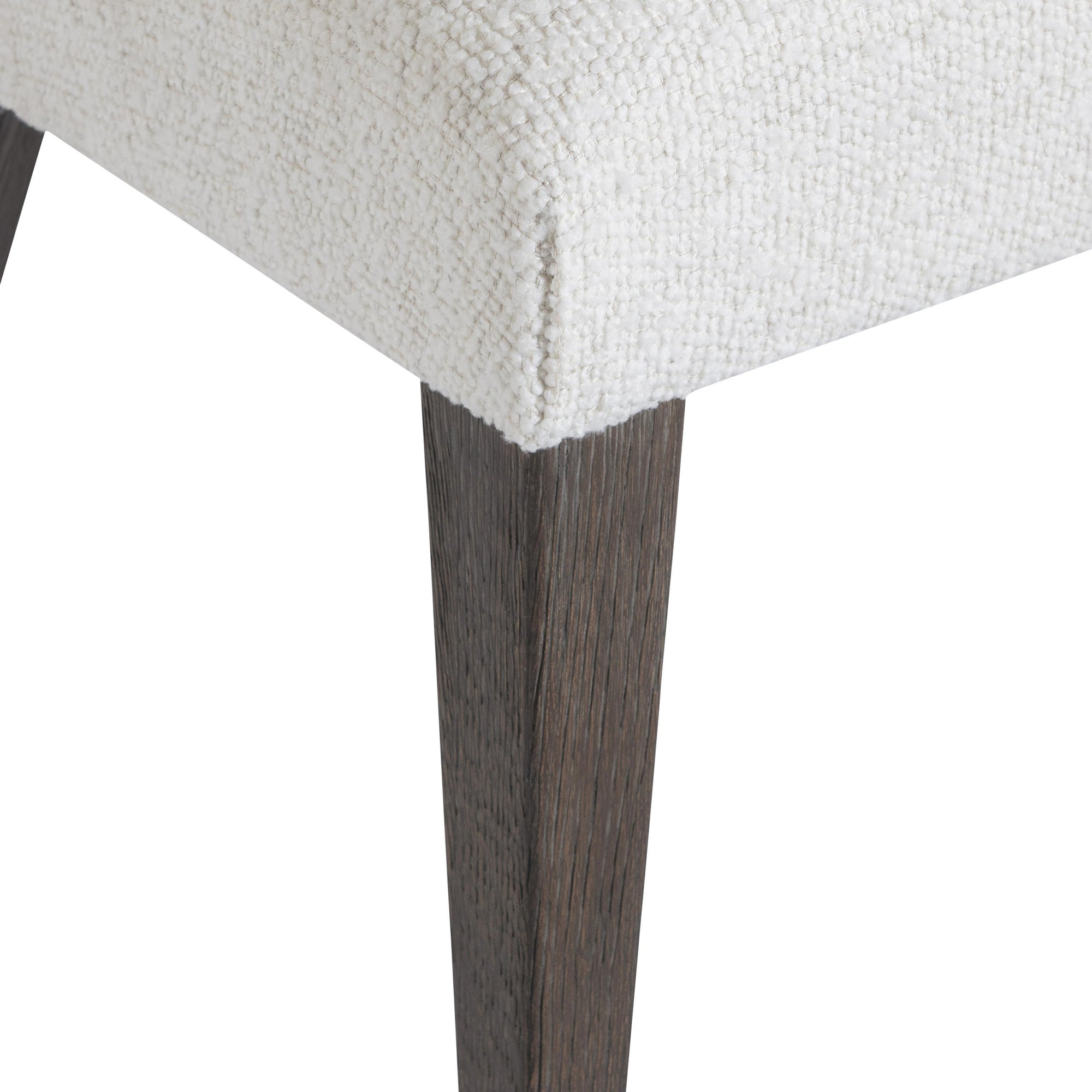 The Outline Upholstered Side Chair presents a perfectly streamlined modern style. Its sleek silhouette appears simple yet sophisticated, featuring tight upholstery and beautifully softened lines for a clean, tailored look. The design is completed by exposed, wire-brushed oak legs in a rich Cassel finish, adding a warm, organic contrast.