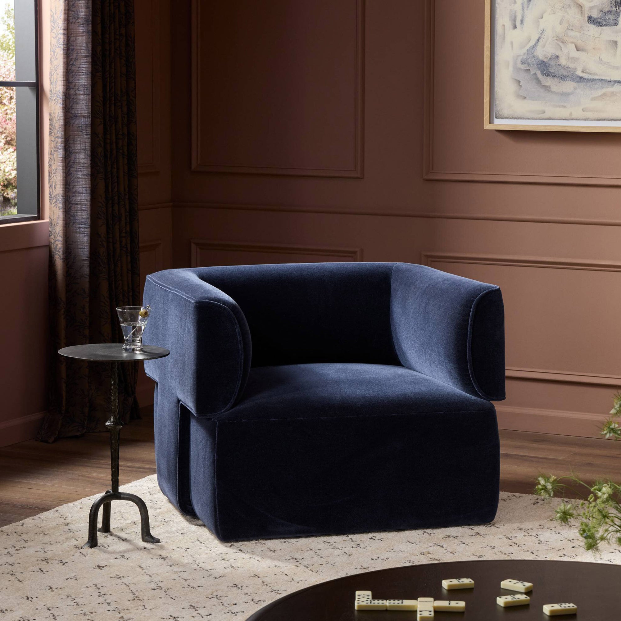 The Pacey Swivel Chair combines soft volume and bold shaping to create a statement-making accent chair. Featuring rounded arms and lush velvet upholstery, this silhouette gains character from T-shaped frame detailing and a functional 360-degree swivel base. This piece is a comfortable and stylish addition to any contemporary space.