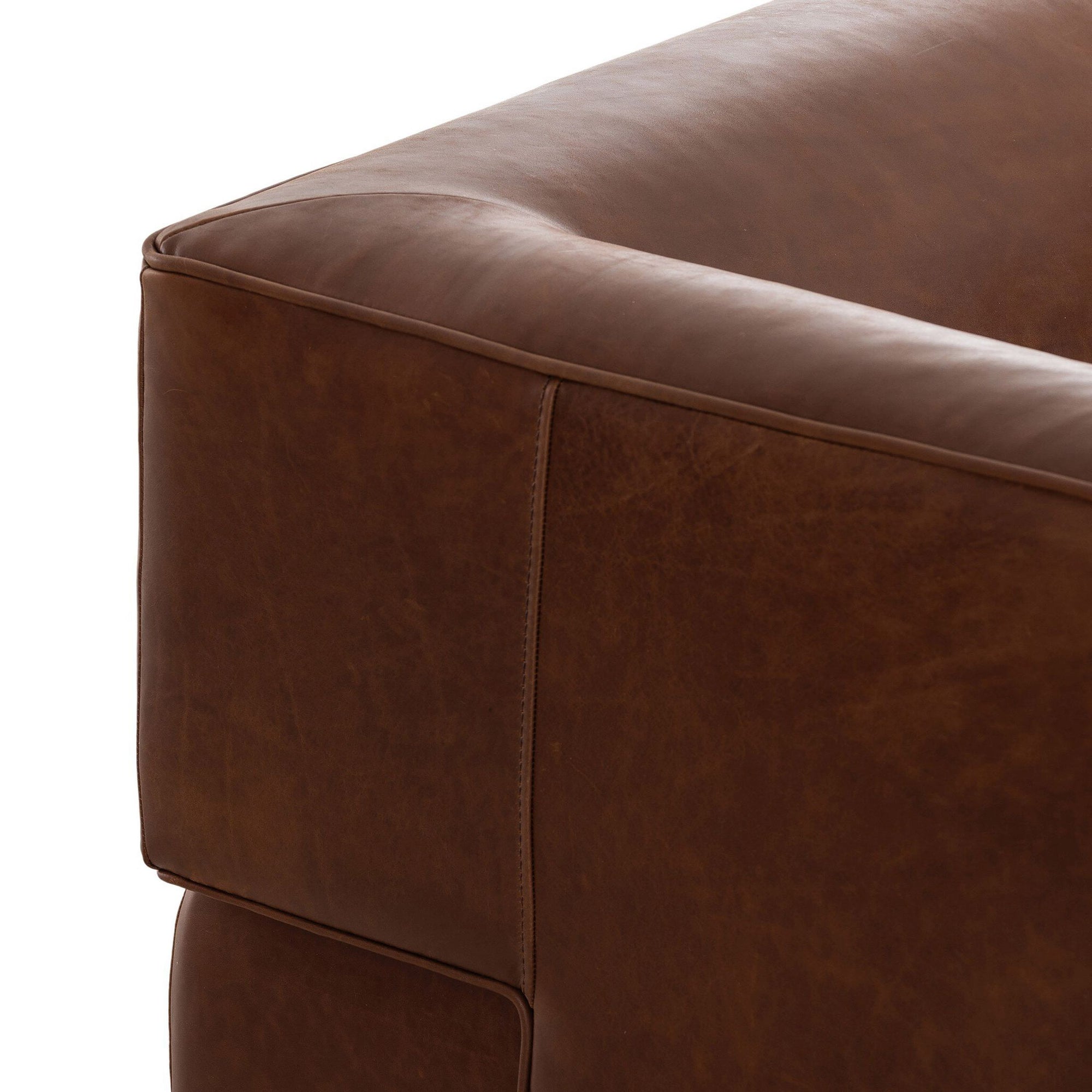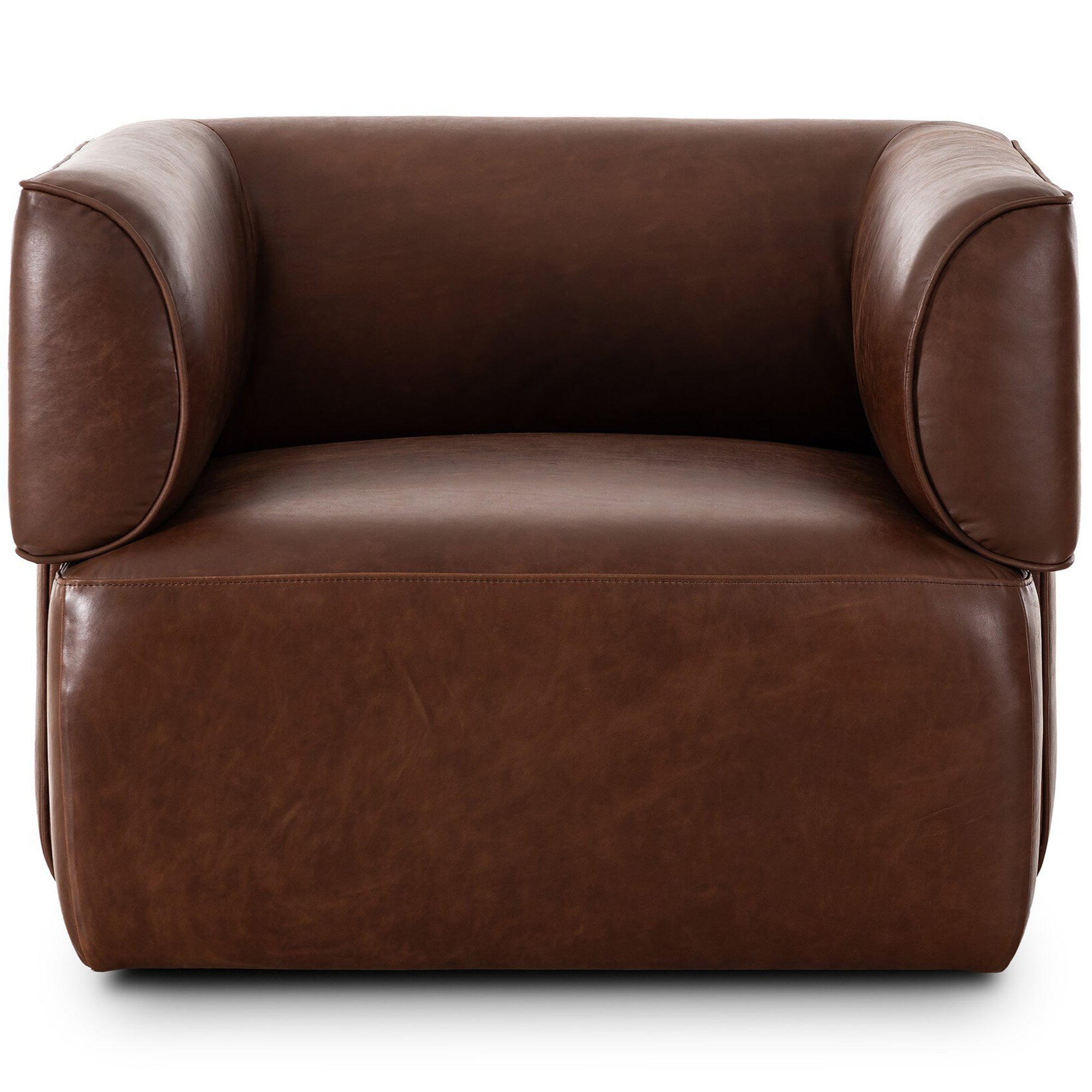 The Pacey Leather Swivel Chair combines soft volume and bold shaping to create a statement-making accent chair. Featuring rounded arms and top-grain leather upholstery, this sophisticated silhouette includes T-shaped frame detailing and a functional 360-degree swivel base. This chair provides exceptional comfort and style, making it a perfect addition to any contemporary space.