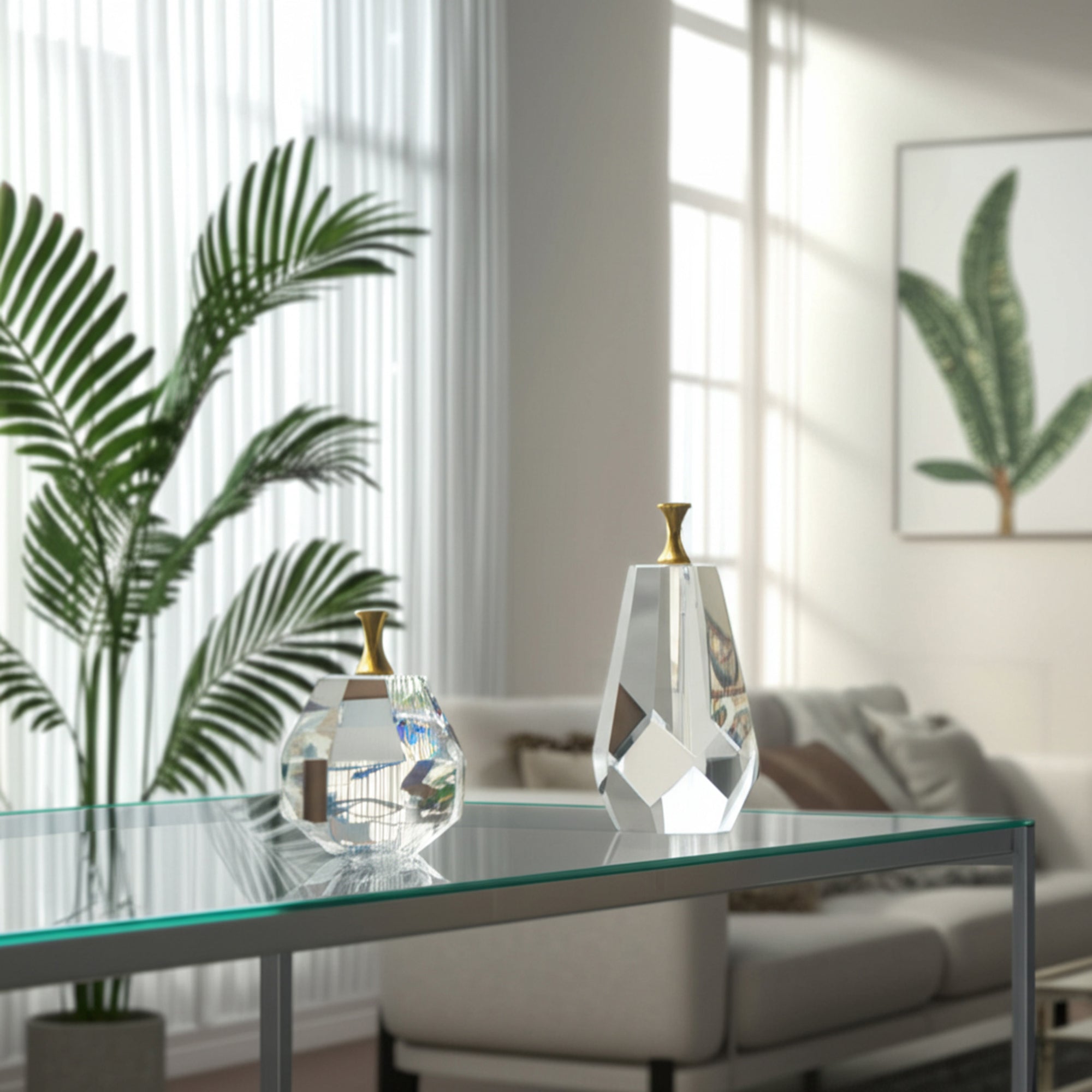 The Pima Crystal Pear and Apple add a brilliant and elegant sparkle to any surface. This decorative set features two complementary objects, perfect for adding a touch of classic charm to a bookshelf, coffee table, or windowsill. Their radiant presence introduces a refined layer of sophistication and lightness to any room's décor, serving as charming focal points.