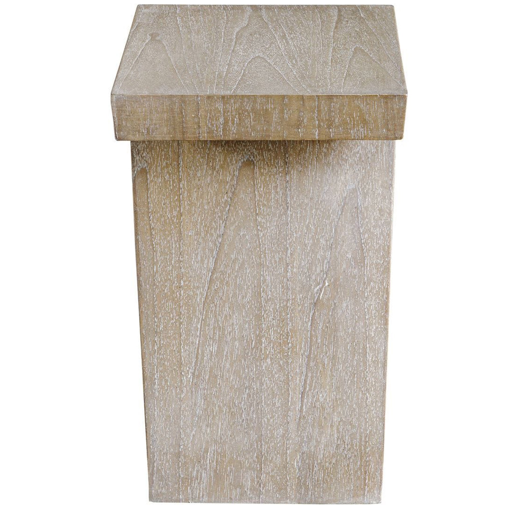 The Pruitt Accent Table features a clean rectangular silhouette that brings a bold architectural presence to any seating arrangement. It showcases a thick flat top surface, providing a secure and functional area for resting a beverage or decorative accents. This upper section is uniquely supported by a substantial A line pedestal base characterized by wide angled slab legs that converge at a central point beneath the tabletop. The continuous linear structure creates a grounded and stable footprint while maintaining a highly sculptured geometric profile. This well proportioned design effortlessly merges minimalist geometry with practical utility to anchor a modern interior.