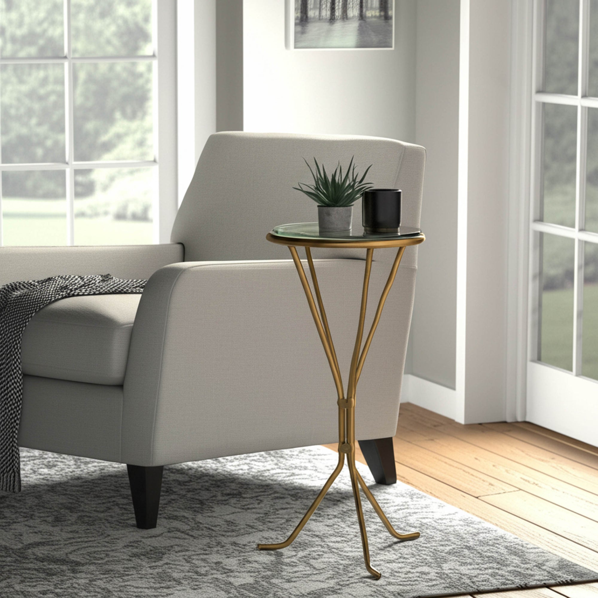 Elevate your home decor with the Recycled Glass Top Drink Table. Whether placed beside your bed as a chic nightstand, in a living room to hold drinks and decor, or in an office corner to display a plant or artwork, its slender frame makes it easy to position anywhere.