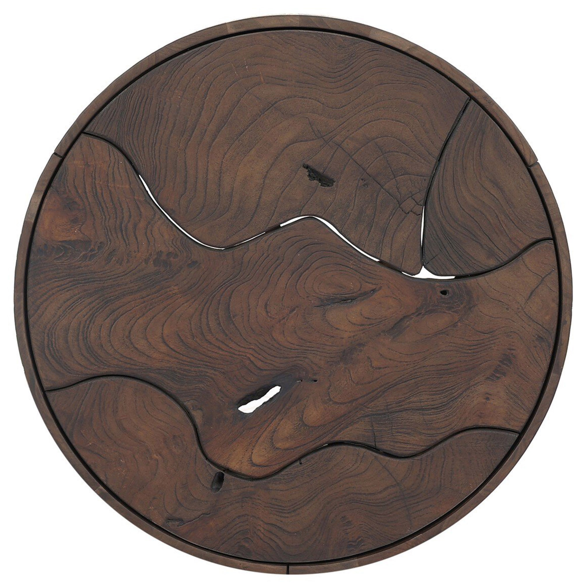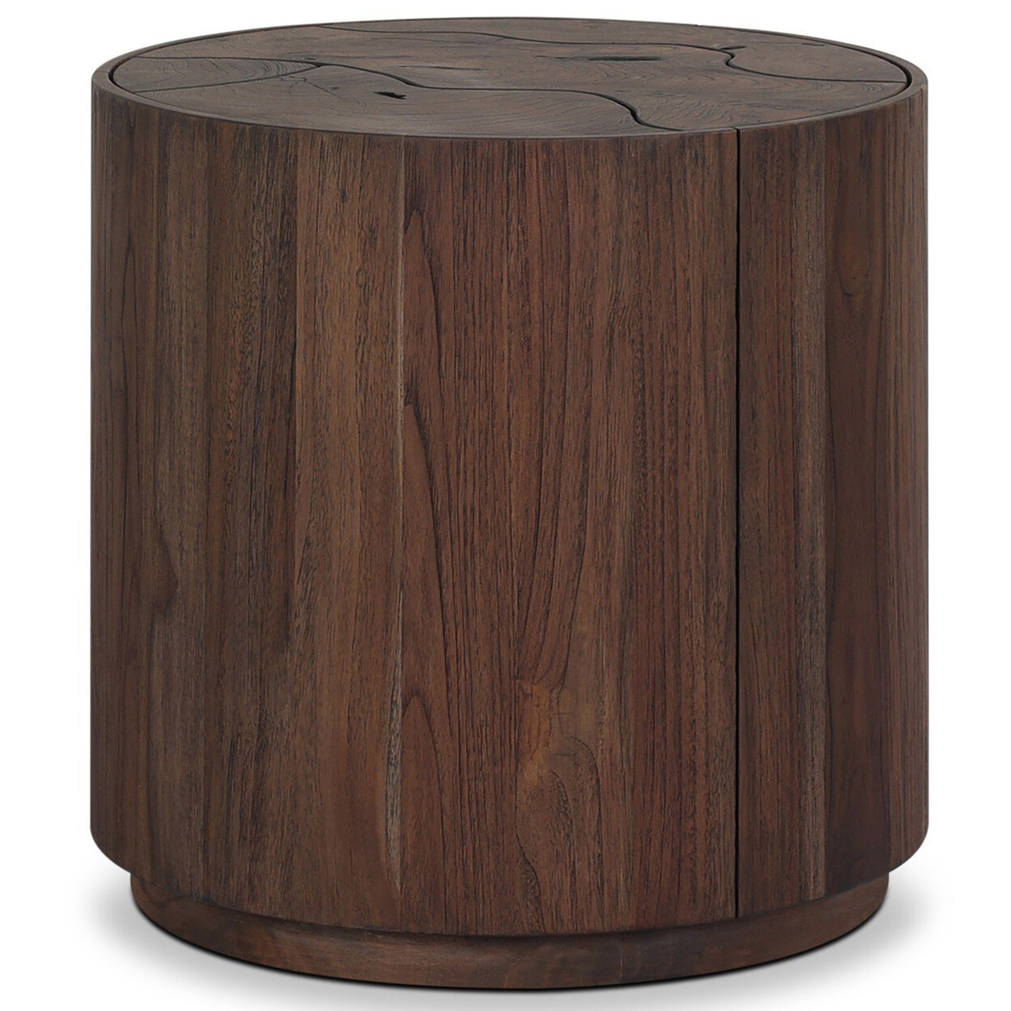 The Ridge Outdoor End Table features a round pedestal design crafted from laminated solid teak root panels, creating a mosaic-inspired surface with natural graining. Its durable construction and timeless silhouette make it an ideal addition to any outdoor setting. Cover or store indoors during inclement weather to maintain longevity.