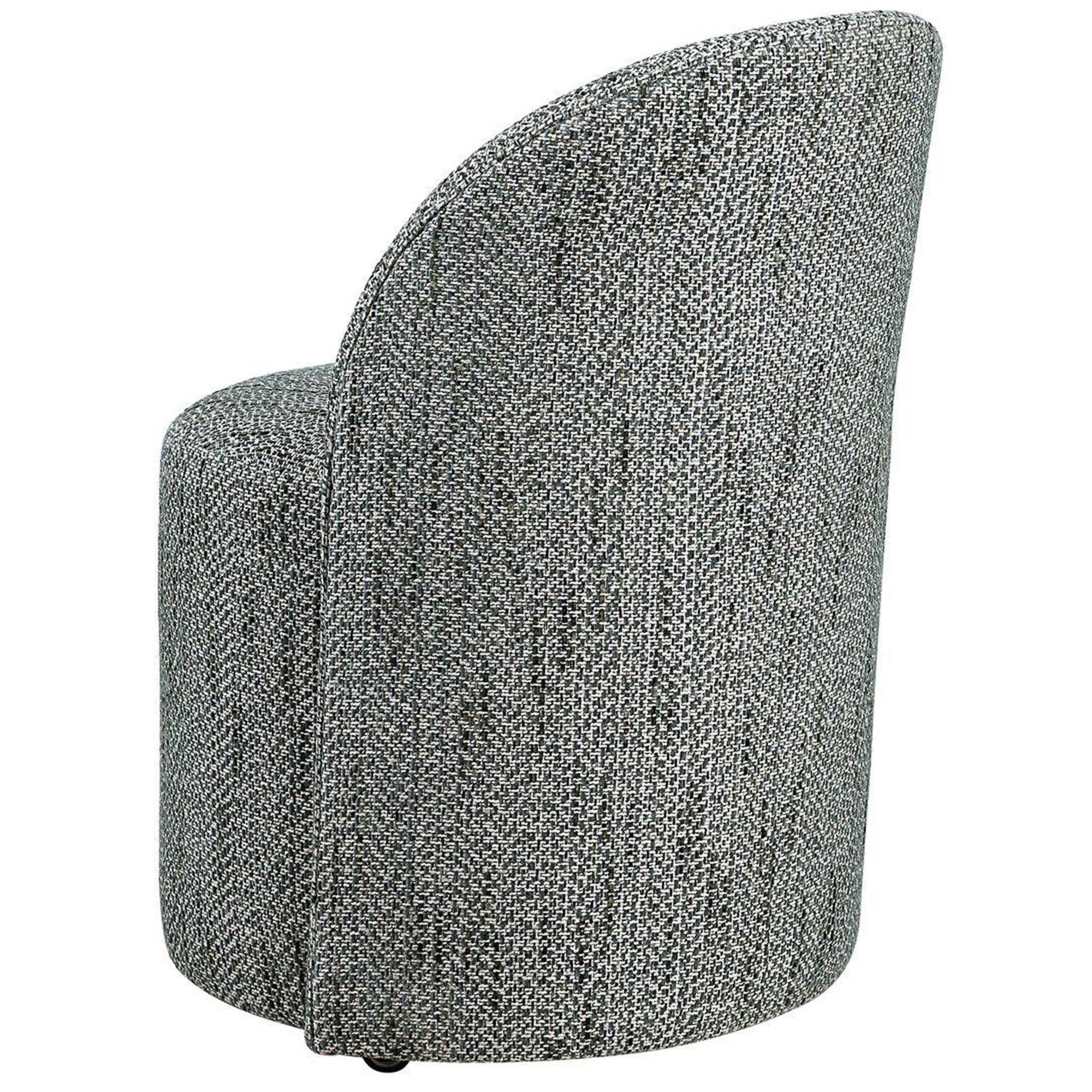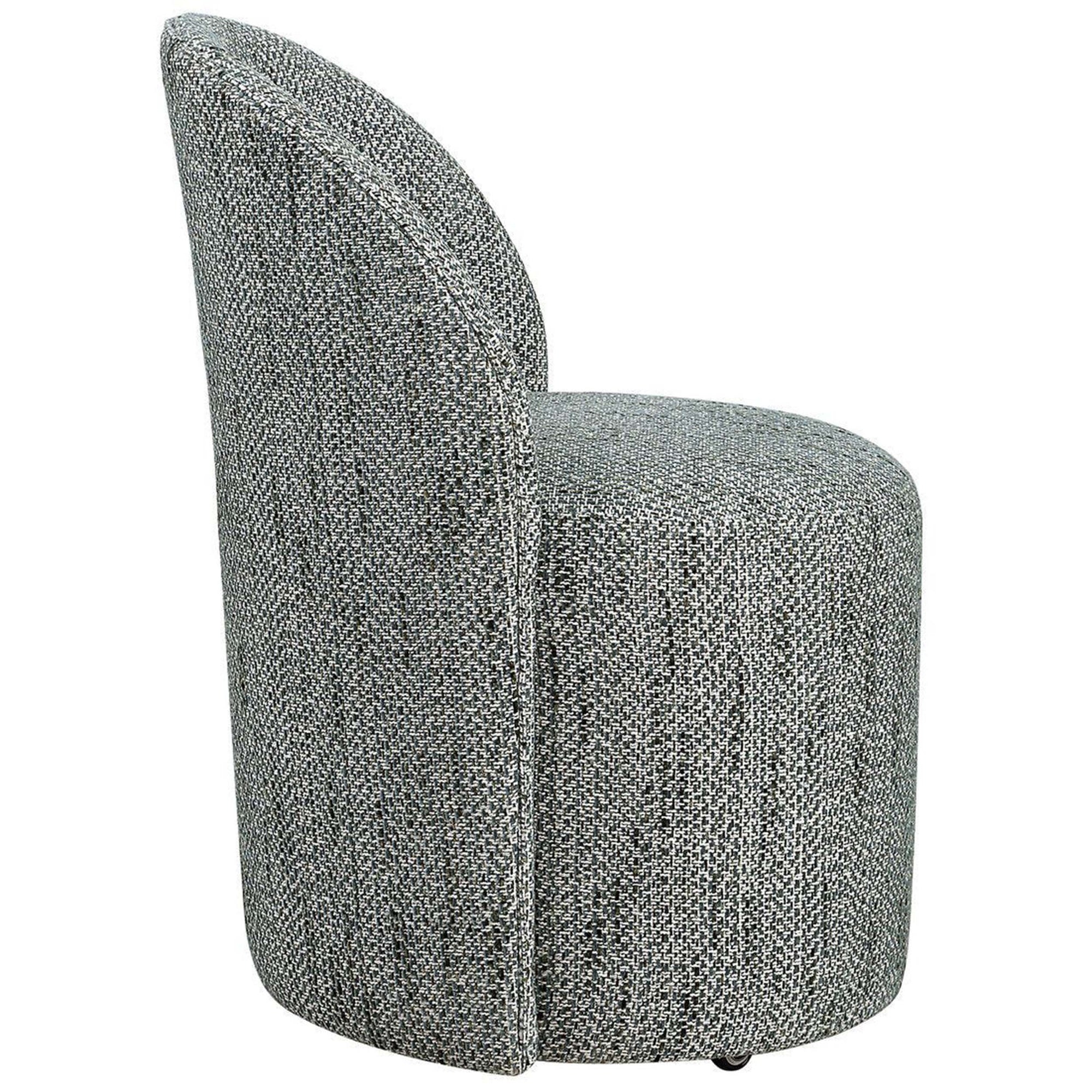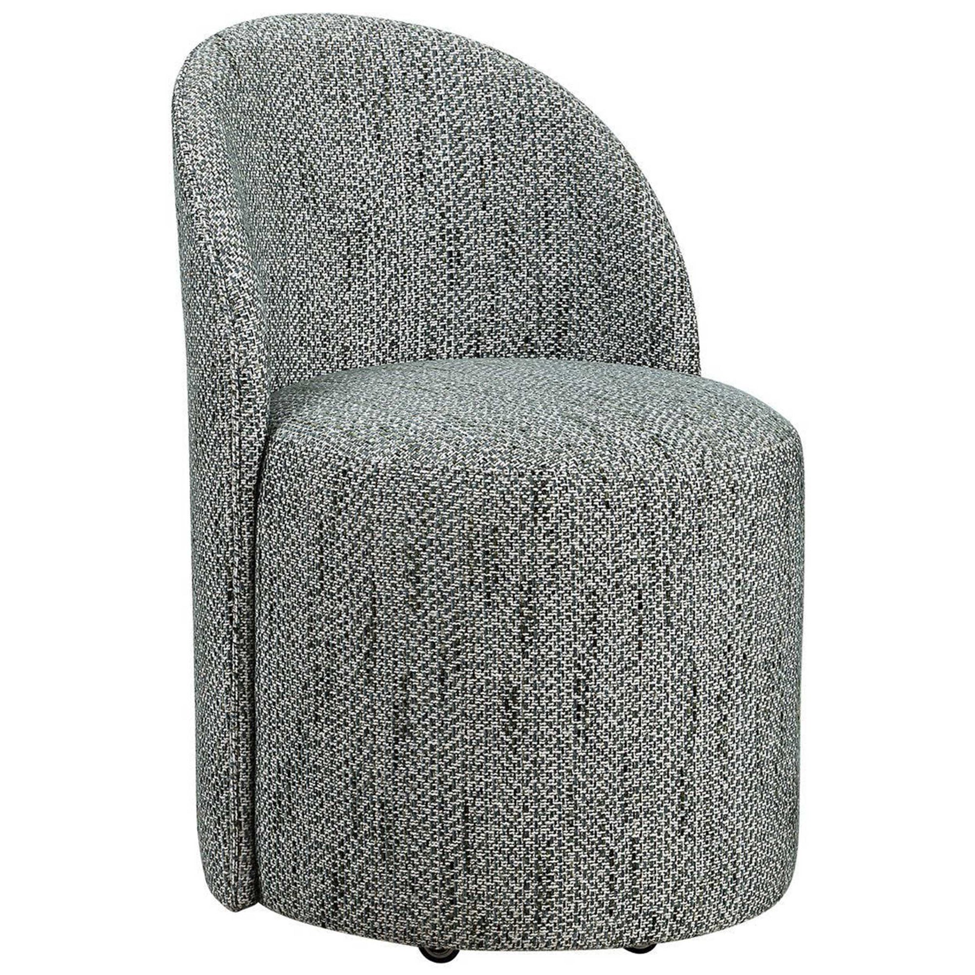 The Roll With It Dining Chair is inspired by classic vanity seating but proportioned perfectly for the dining table. Fully upholstered in a textural woven fabric, this chair features smooth lines that complement a variety of interiors. Finished with rolling casters for ease of use, it combines style with practical mobility.