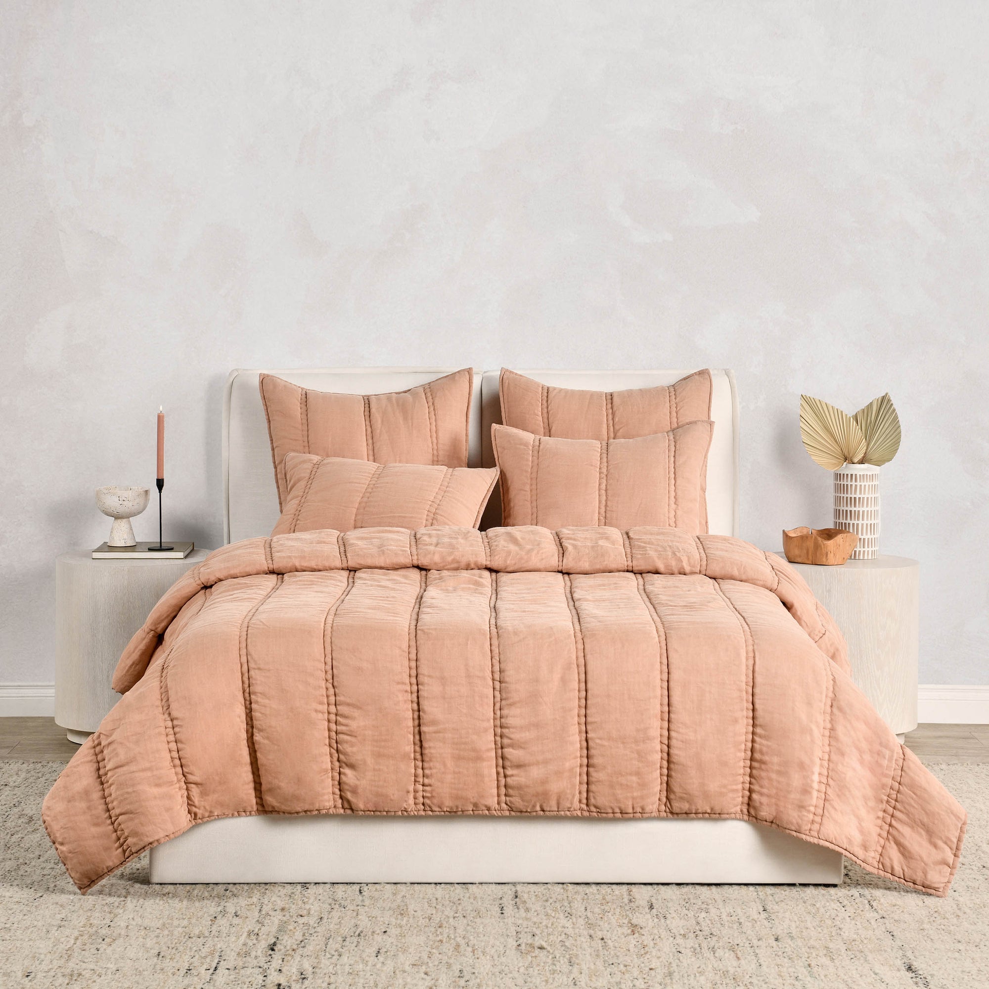 The Rowen Quilt offers a crisp, airy feel with its hand-quilted, channel-stitched design. Made from 100% ramie, it provides soft breathability and premium strength, while stonewashed finishing creates subtle variations in color and texture for unique character. Prewashed for lasting softness, this quilt layers beautifully or can be displayed on its own.