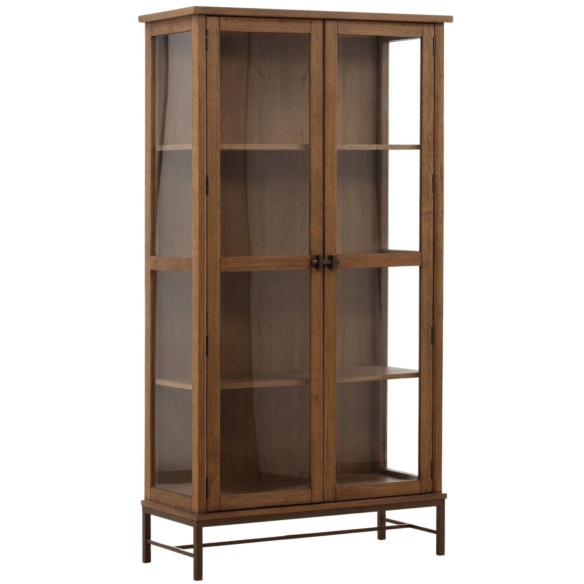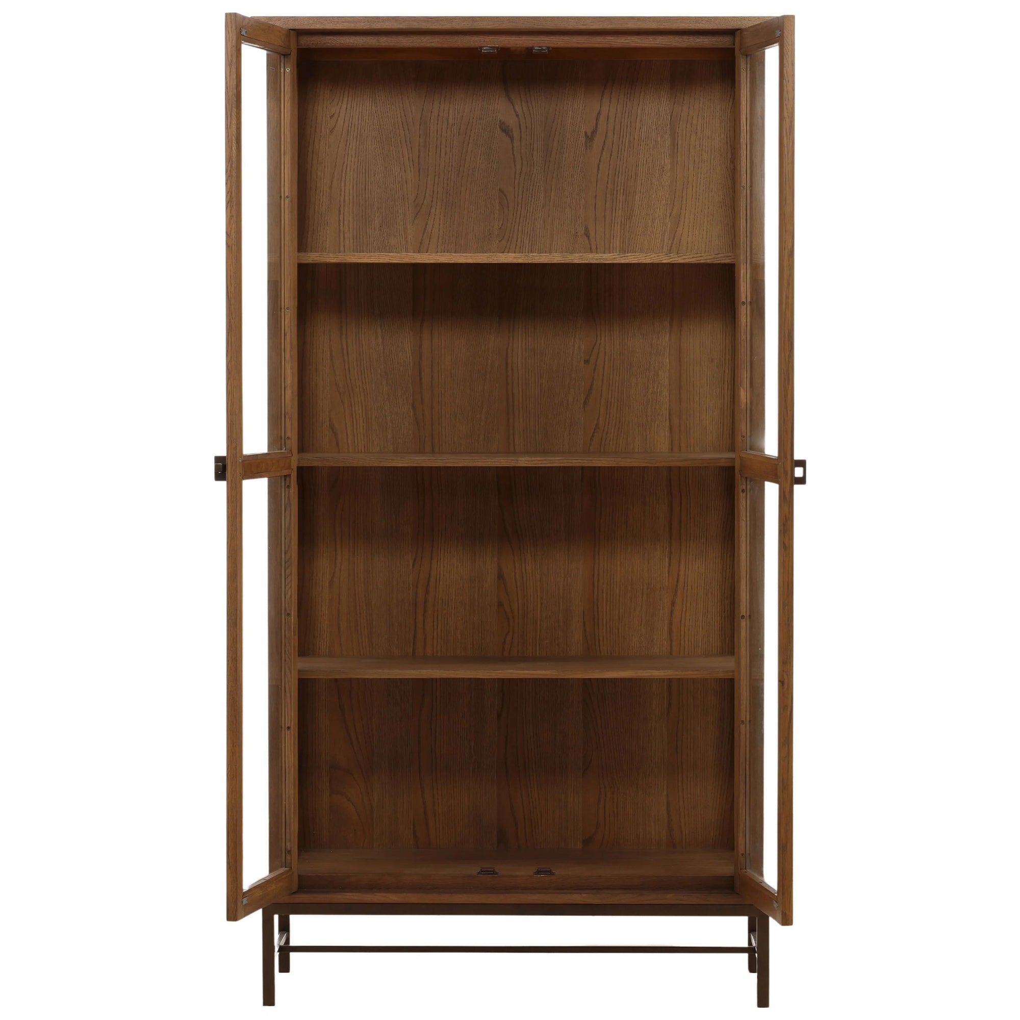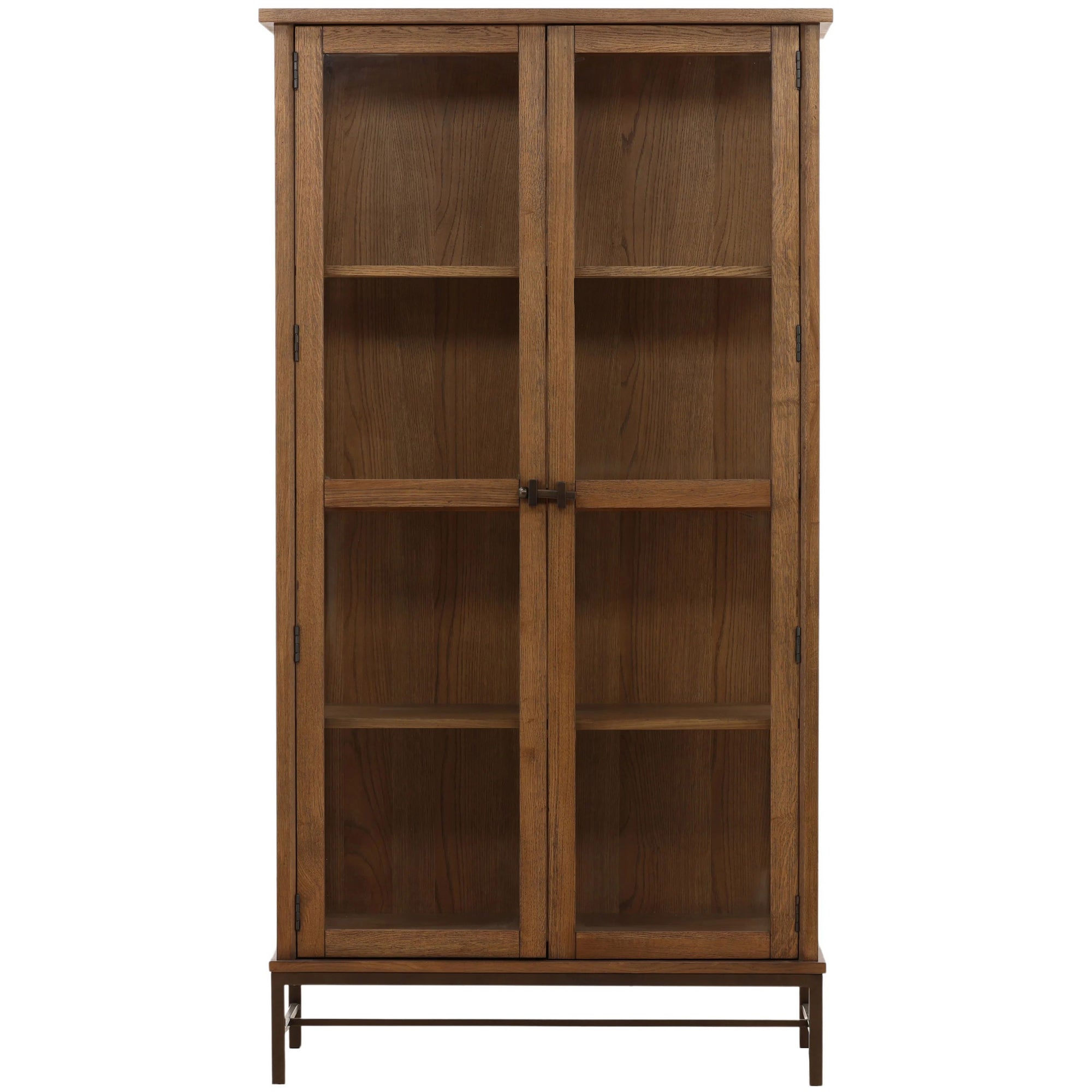 The Royden Cabinet combines rich oak wood craftsmanship with modern metal accents. Featuring a tall silhouette framed in iron with bronze tones, this cabinet provides generous storage behind beautifully grained oak veneer doors. A sophisticated addition to dining rooms, offices, or living spaces.
