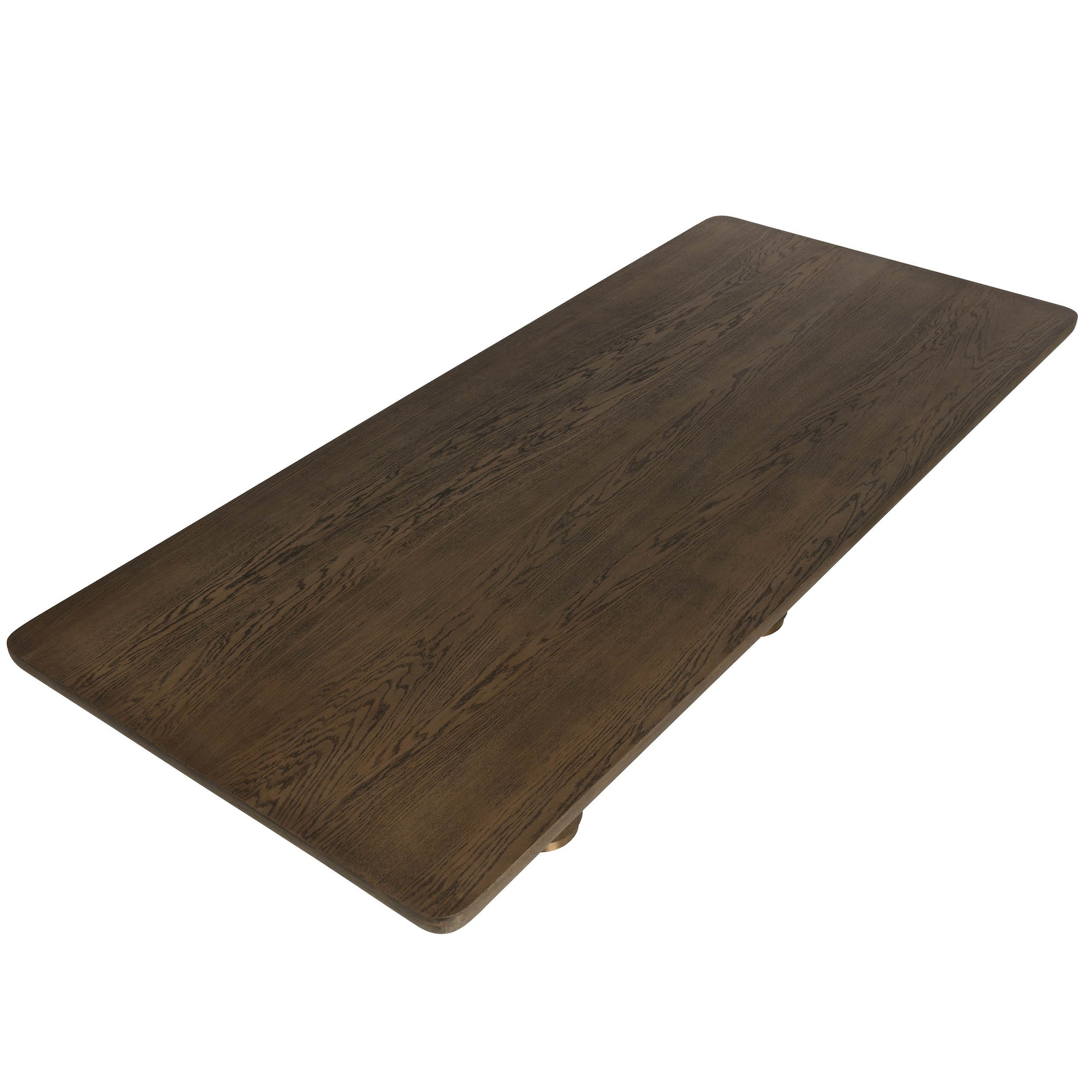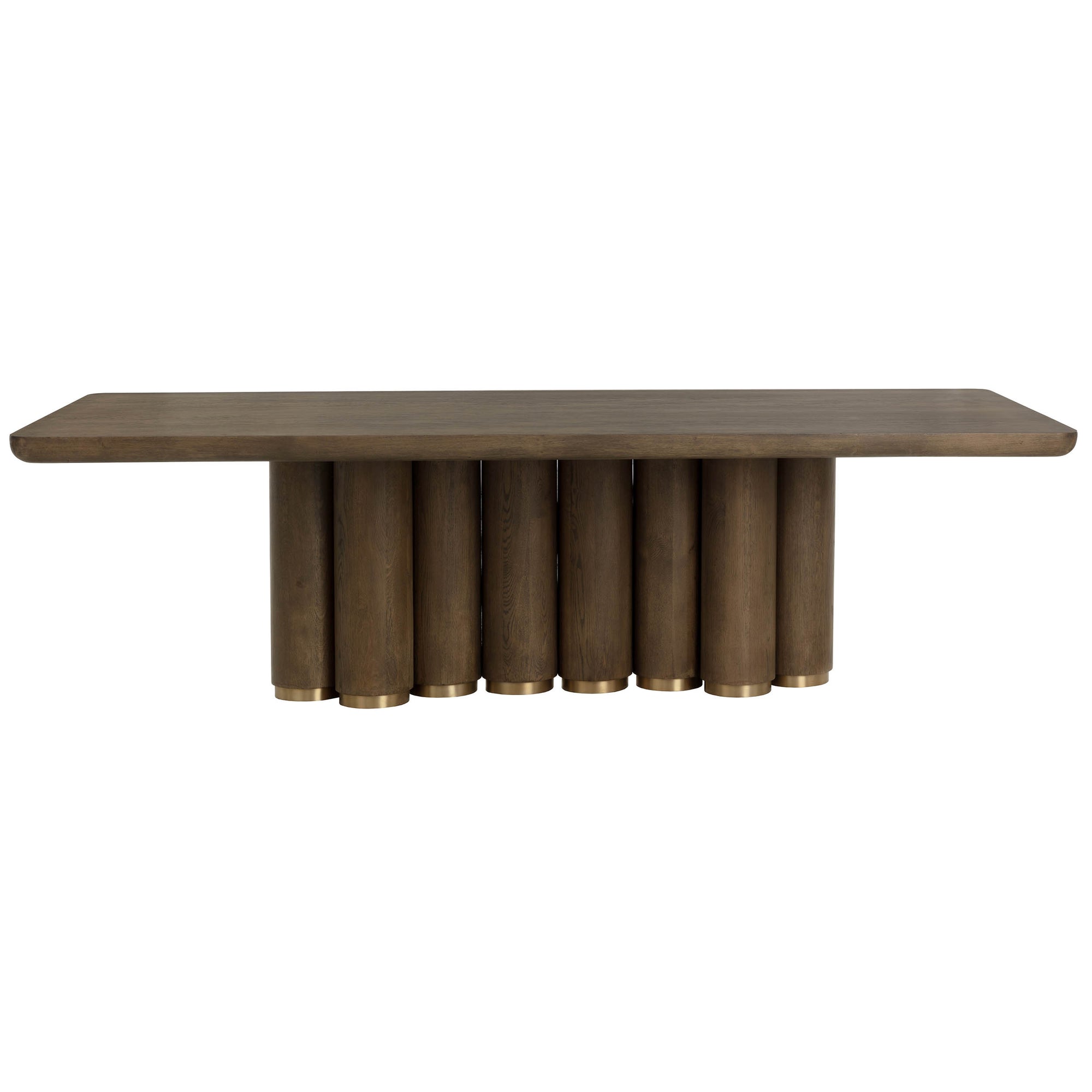 The Salix Dining Table, Brown features a sculptural rounded rectangular top supported by cylindrical pillar legs with subtle golden accents. Crafted from solid oak, it combines bold form with refined detail to anchor any dining space in style.