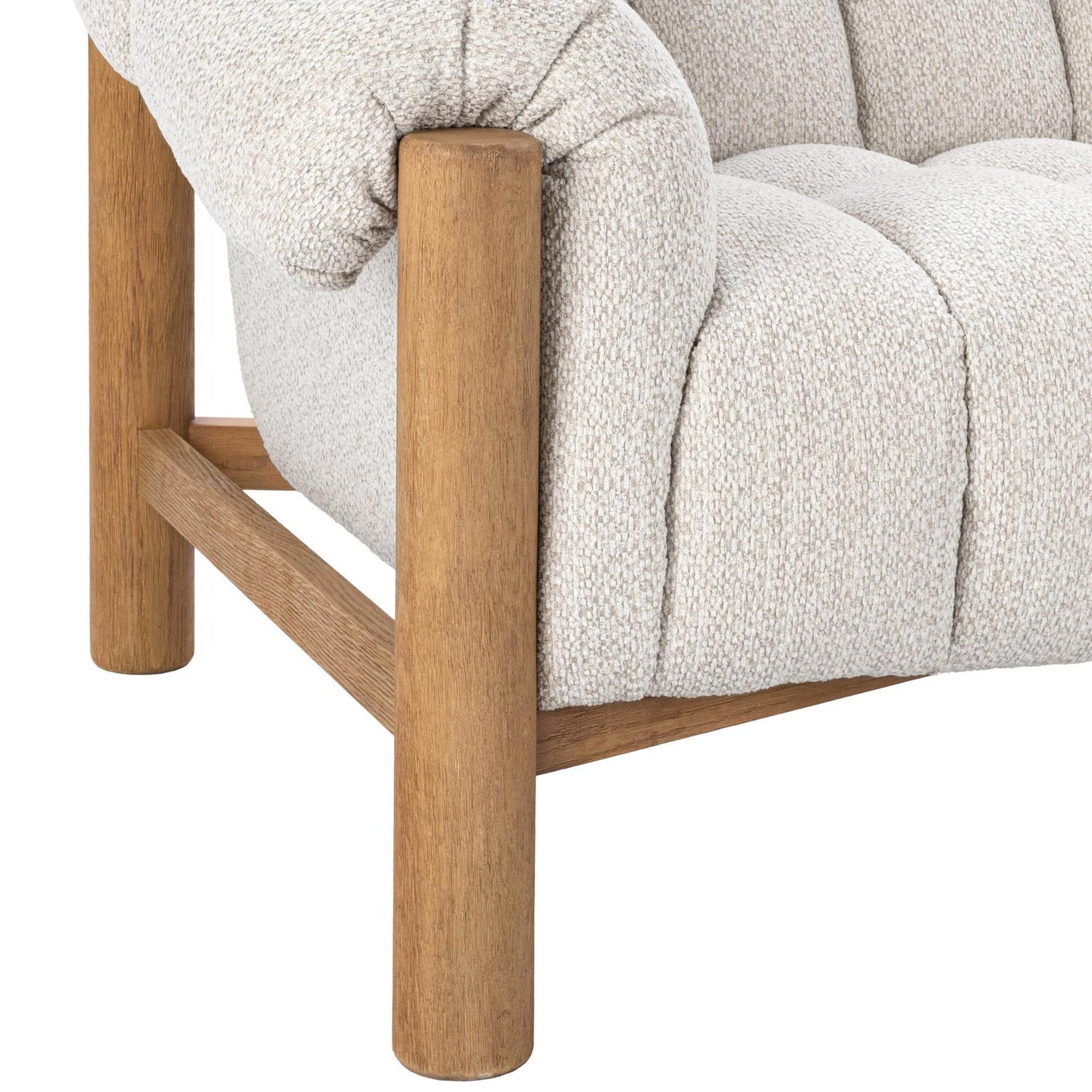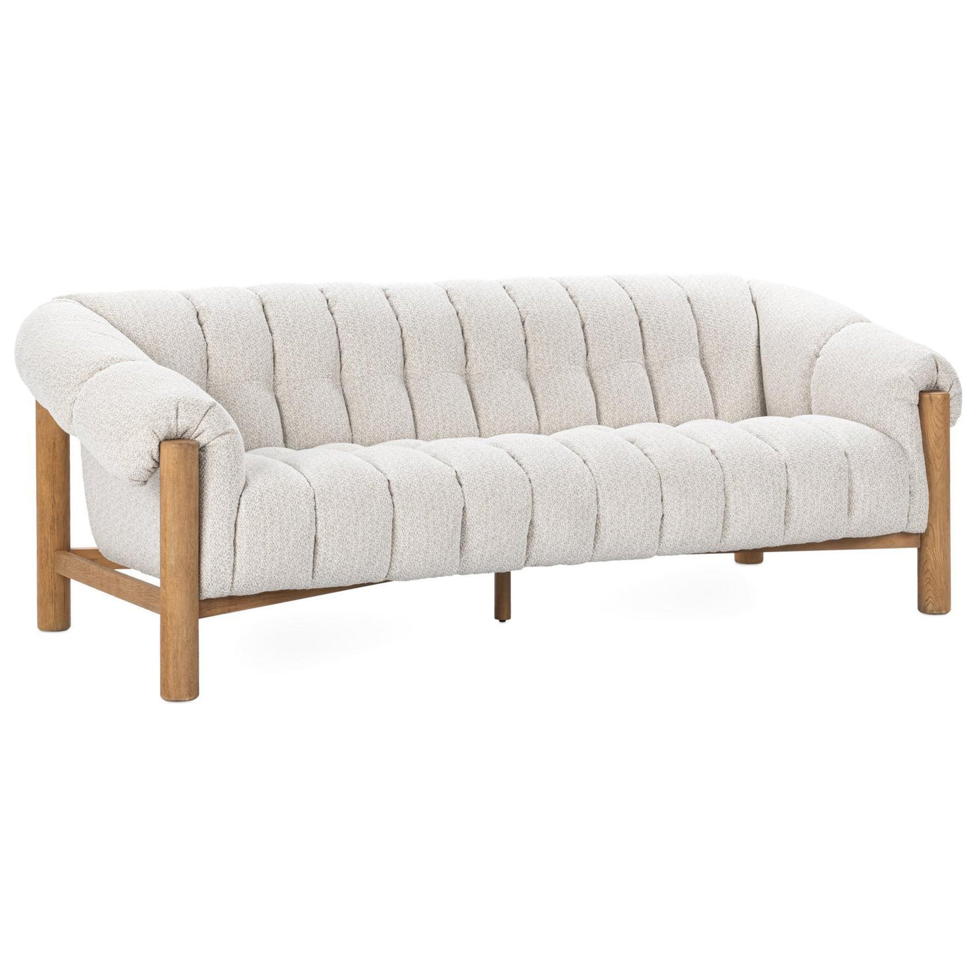The Sansa Sofa offers sculptural comfort and organic inspiration. Wrapped in plush, soft upholstered fabric, its deep tufting invites relaxation, while the natural brushed wood frame grounds the design with natural beauty. The rounded arms and softly curved silhouette offer a modern take on timeless comfort.