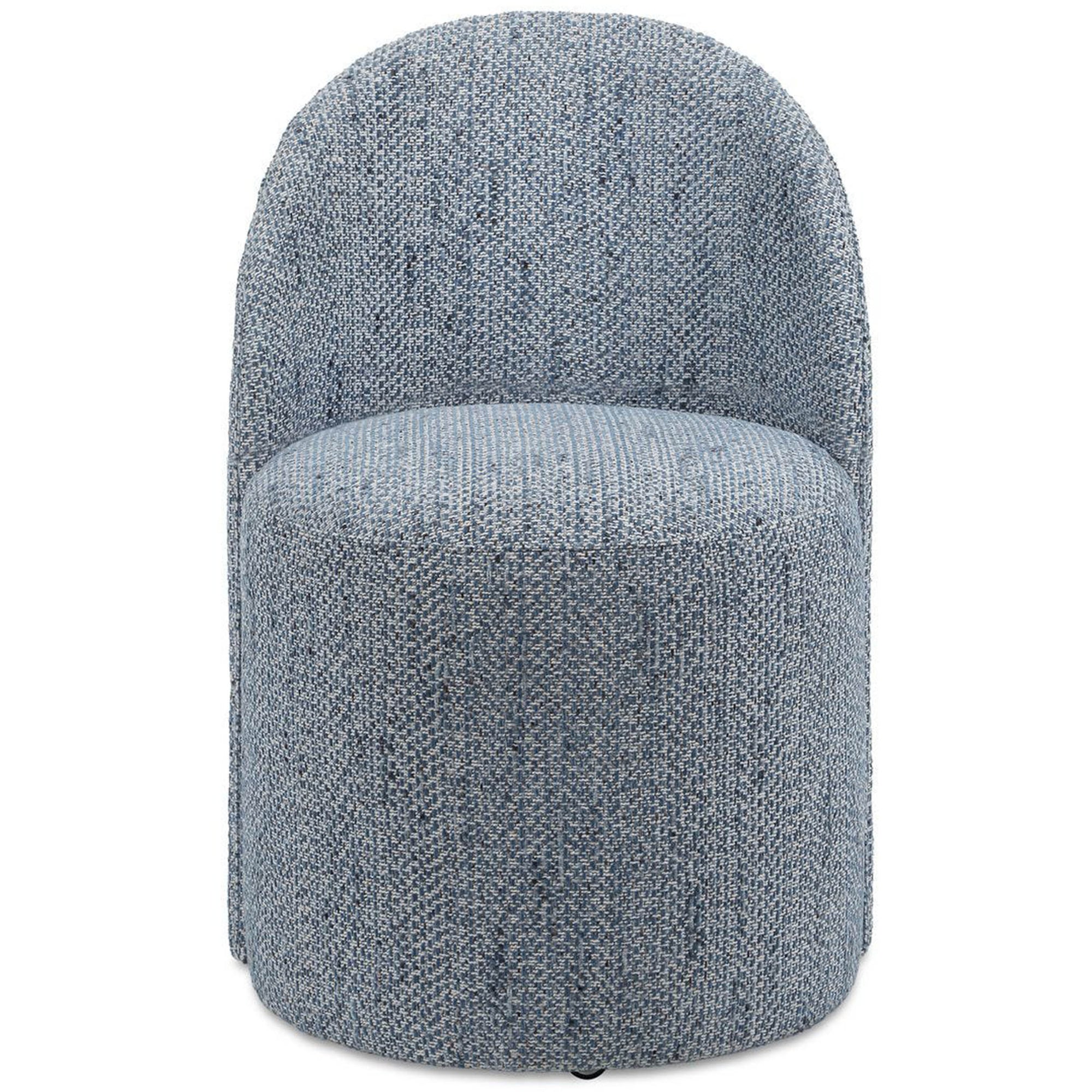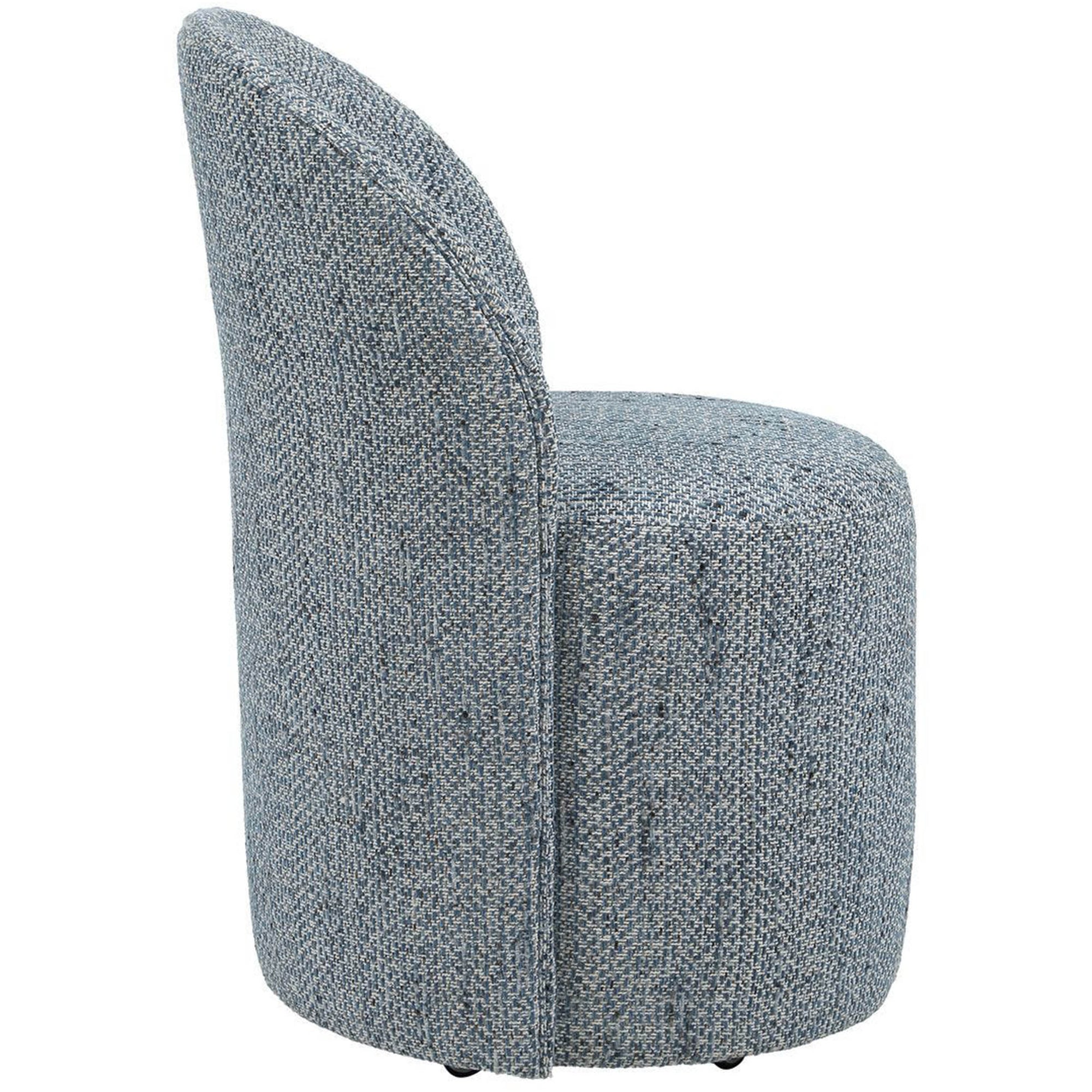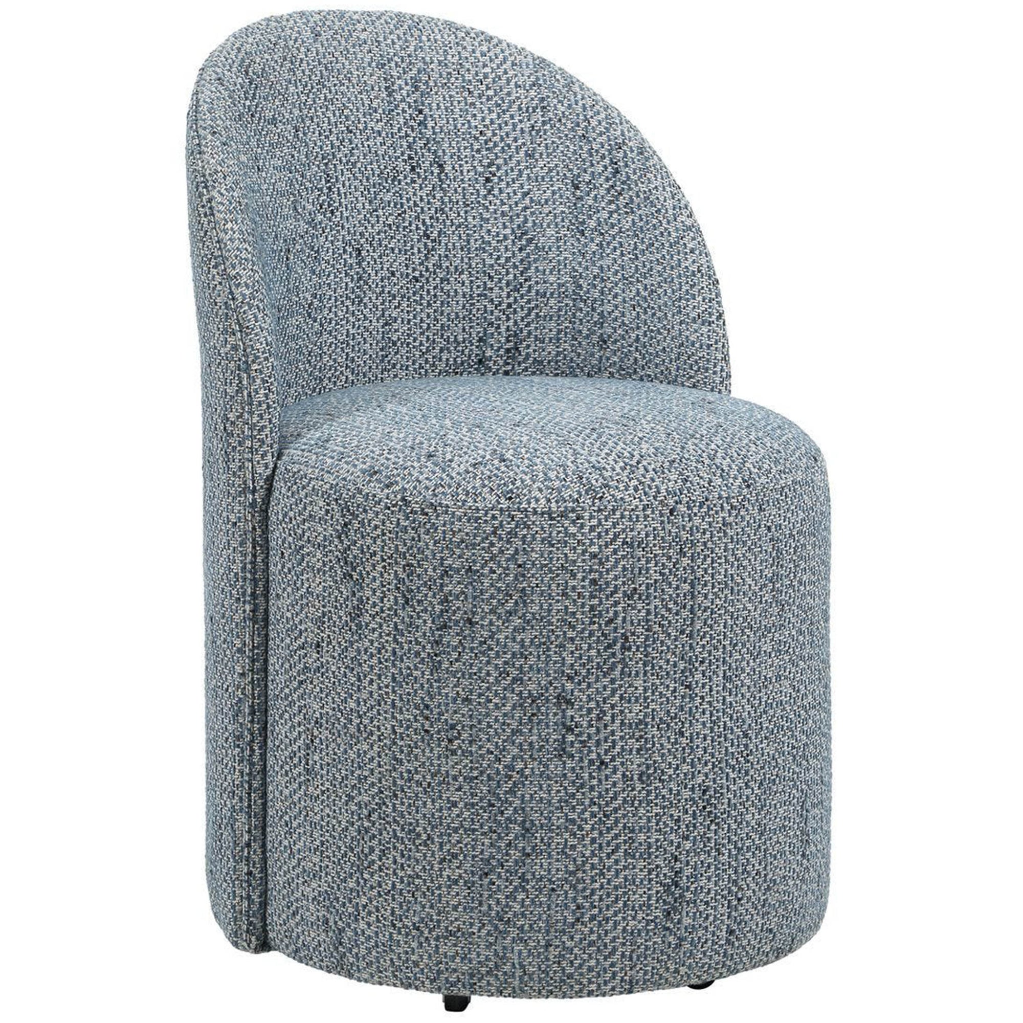 The Roll With It Dining Chair is inspired by classic vanity seating but proportioned perfectly for the dining table. Fully upholstered in a textural woven fabric, this chair features smooth lines that complement a variety of interiors. Finished with rolling casters for ease of use, it combines style with practical mobility.