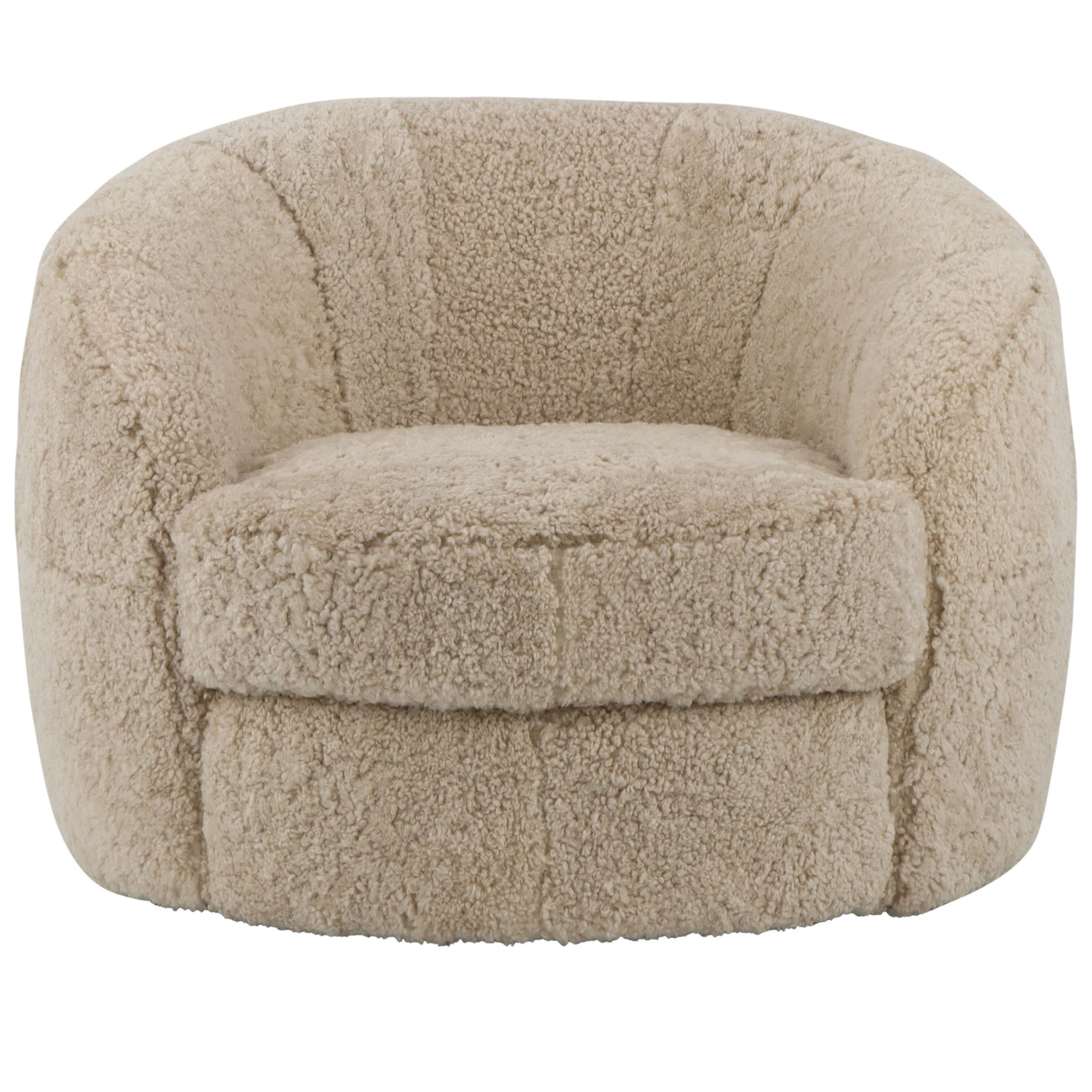 The Sennon Swivel Chair features a plush 100% sheep skin fabric cover, offering a luxurious touch and exceptional comfort. Its contemporary design and smooth swivel functionality make it a perfect addition to modern living spaces.