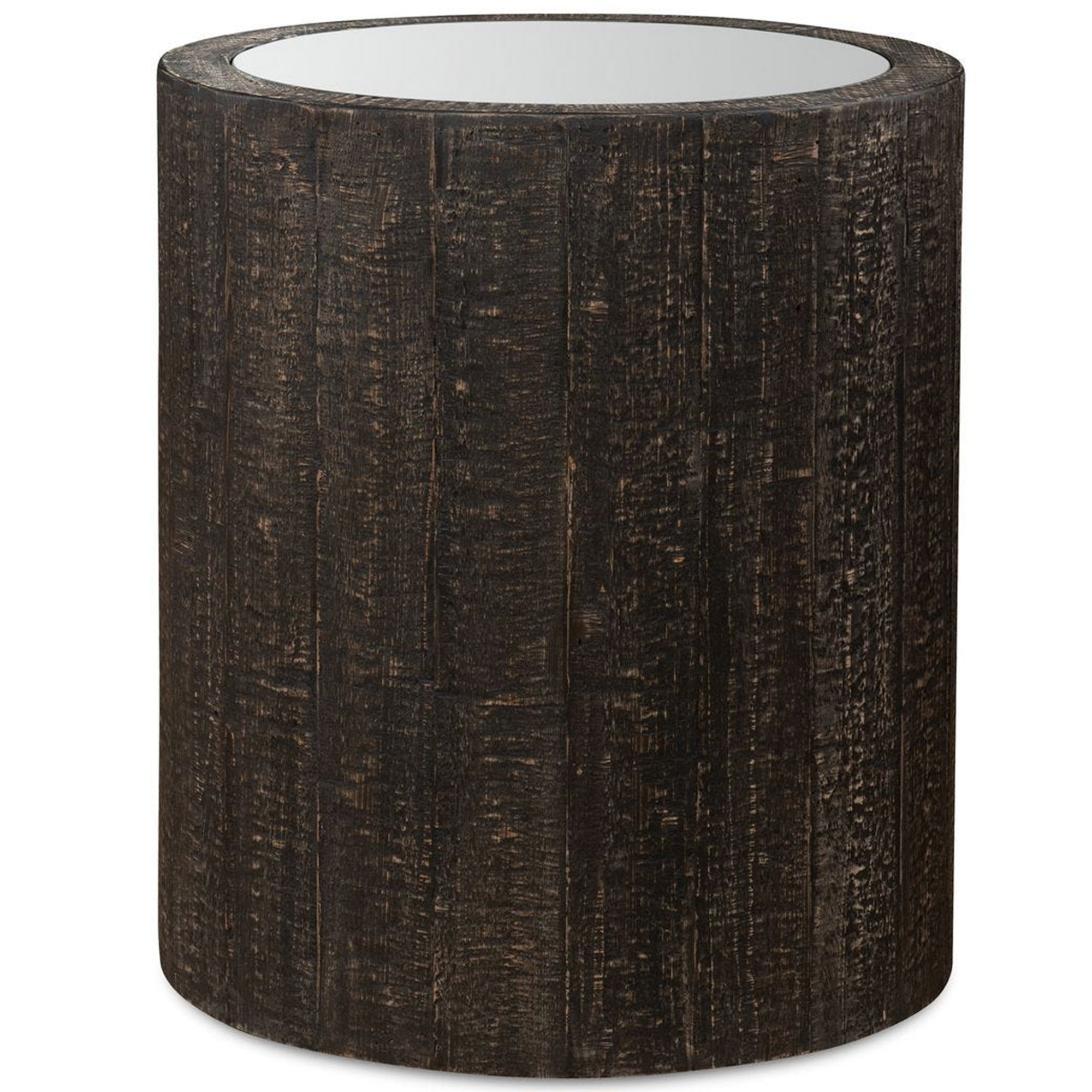 The Sequoia Accent Table features a solid cylindrical silhouette that brings a grounded architectural presence to any seating area. It showcases a flat round top with an inset reflective surface, providing a secure and functional spot for resting beverages or decorative items. This upper section sits flush within a continuous monolithic pillar base that extends directly to the floor. The main body is fully enveloped in a deep vertical grooved texture, adding immense tactile interest to the streamlined geometric profile. This well proportioned design effortlessly merges basic geometry with practical utility to ground a modern or rustic interior.