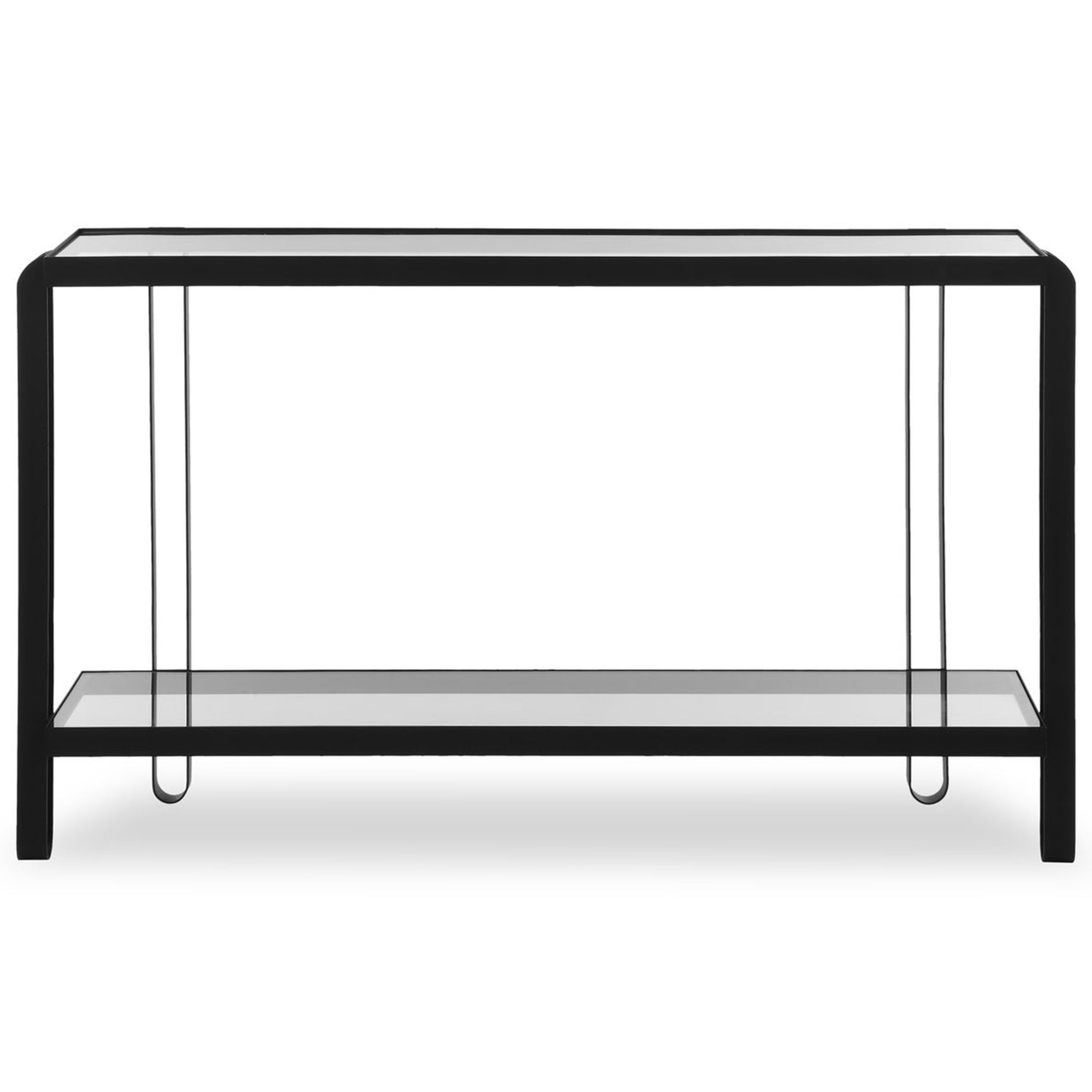 The Shadow Console Table is an elegant console table with simple clean cut lines and enriched with added curves. It features a satin black iron frame with a top and gallery shelf in clear glass. This sophisticated piece offers a minimalist aesthetic that fits seamlessly into contemporary entryways or living spaces, providing two levels of transparent surfaces for display.