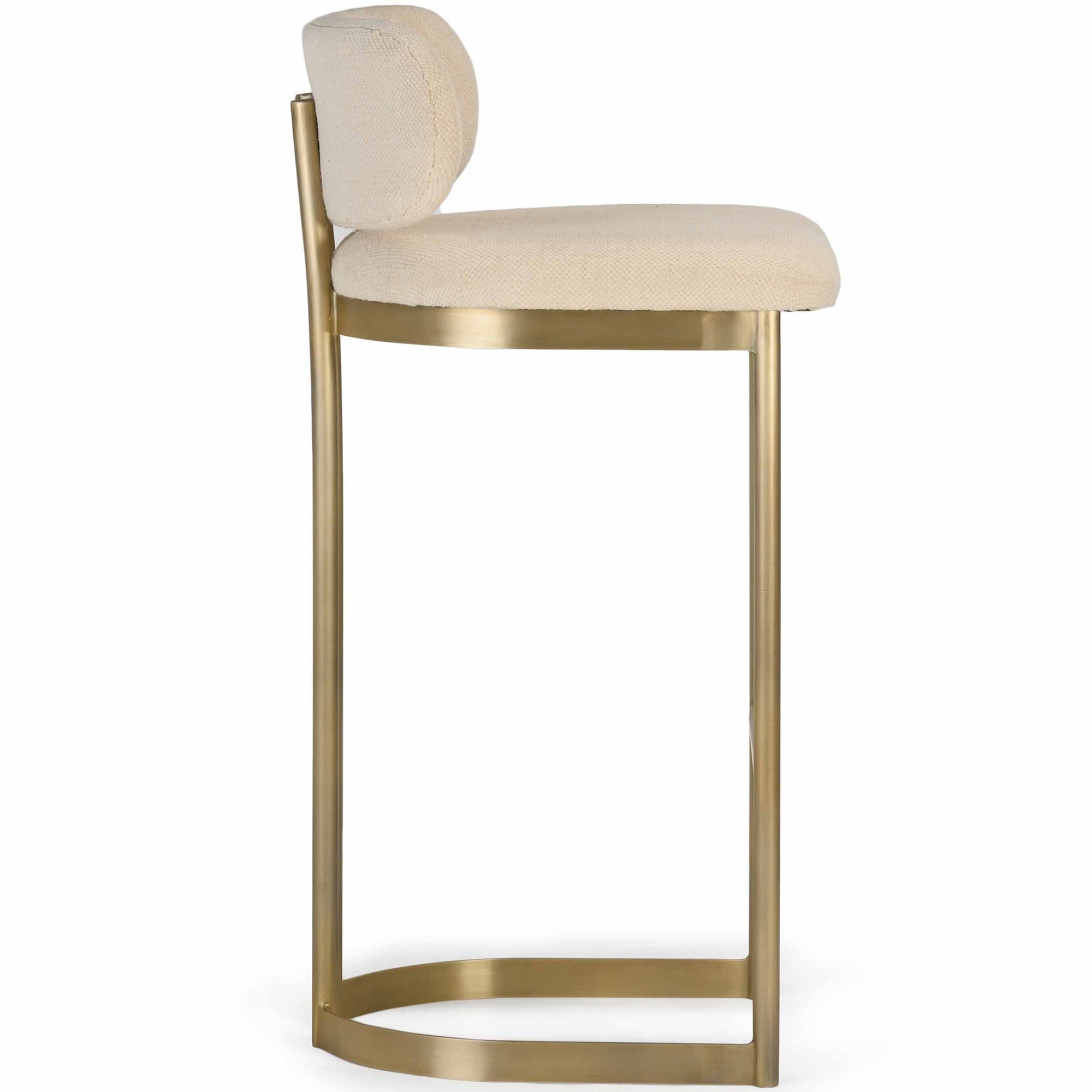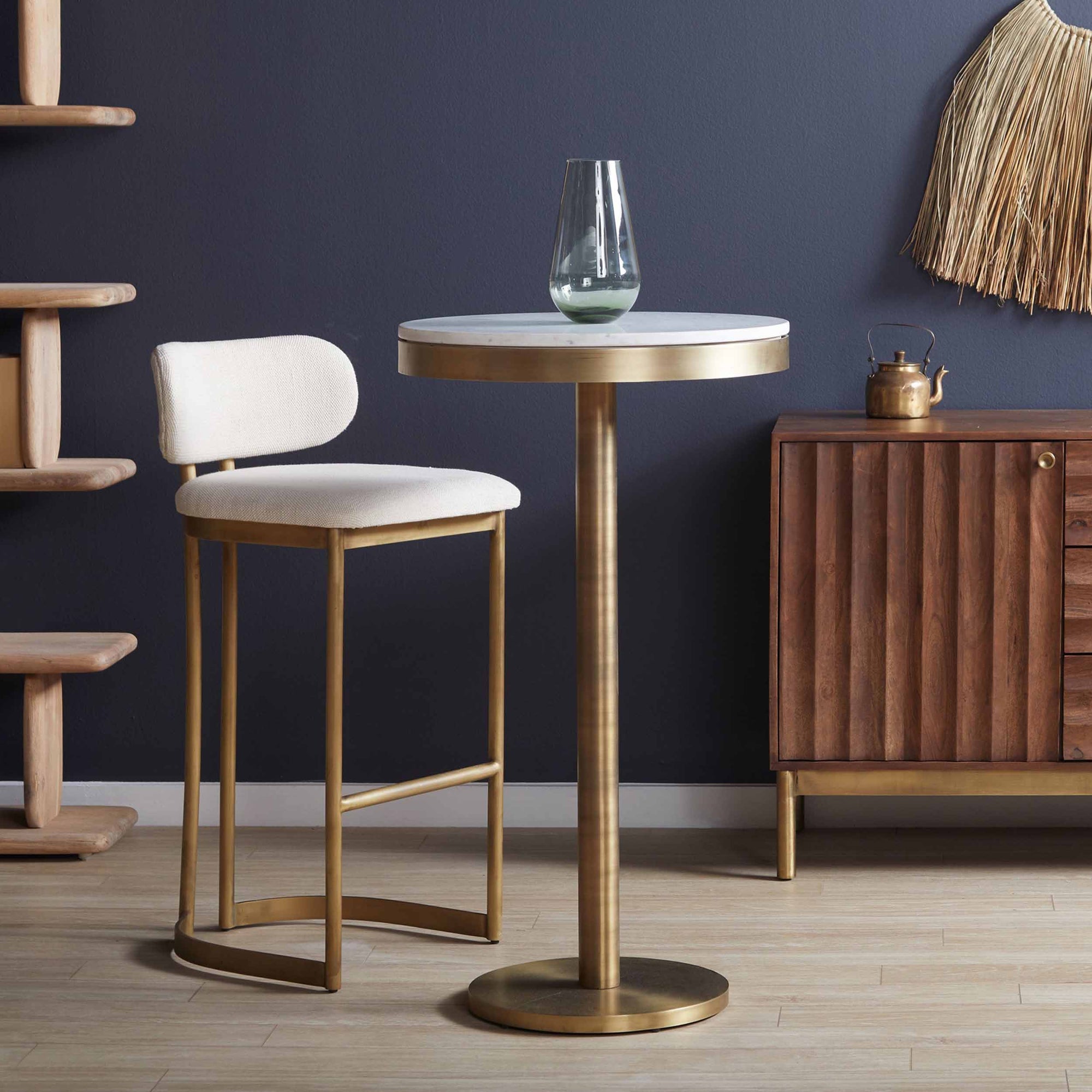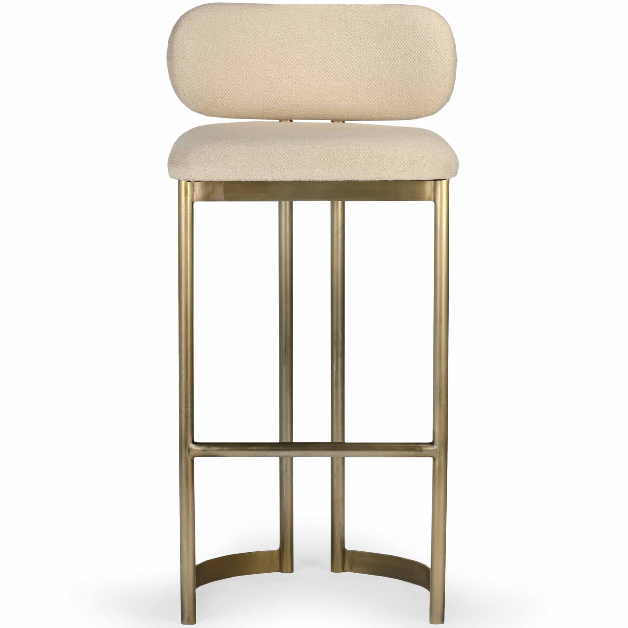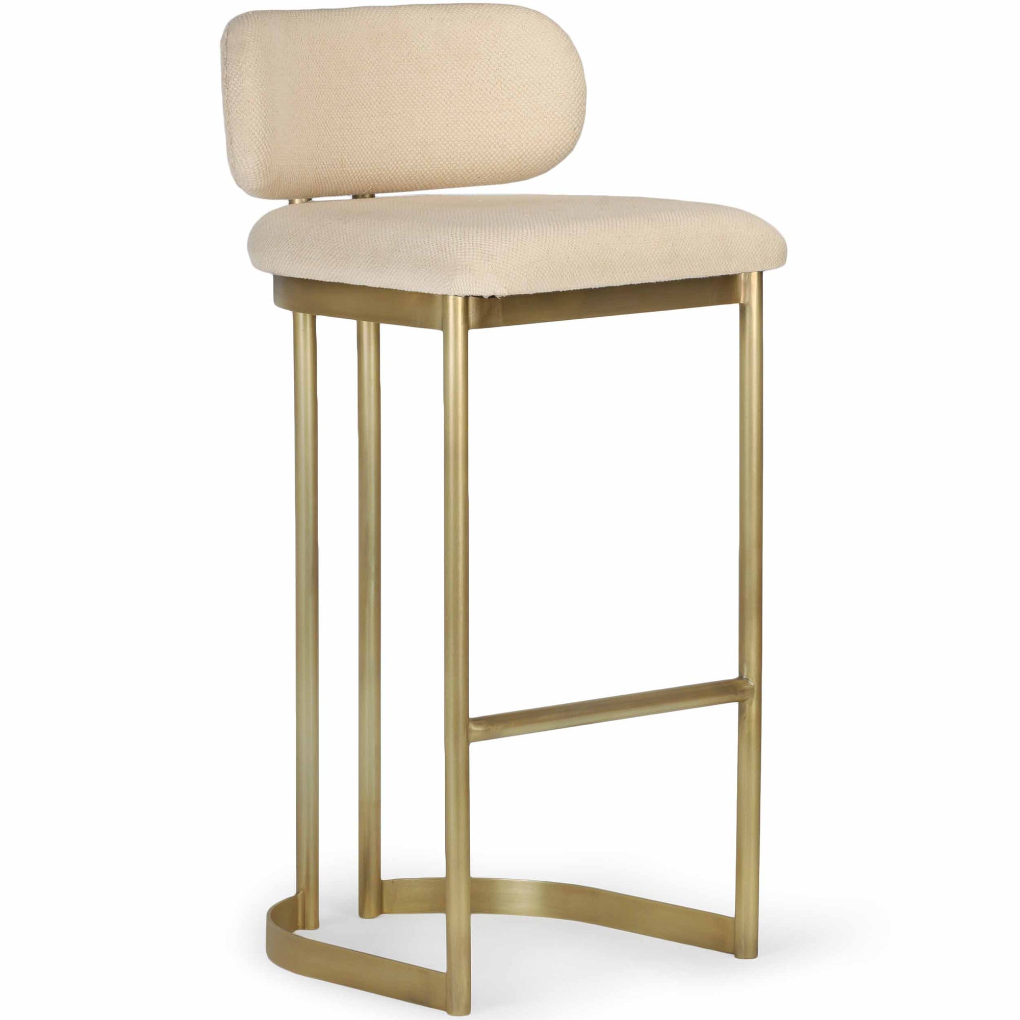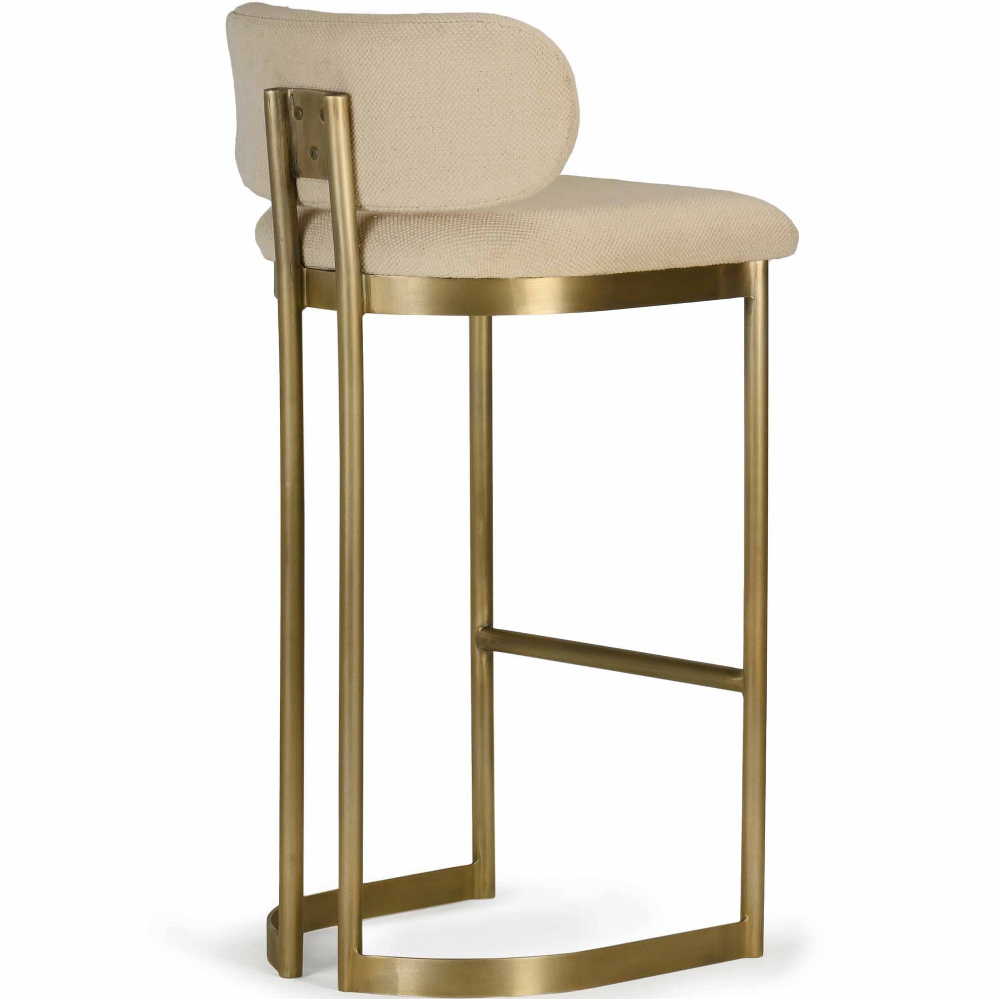 The Shay Bar & Counter Stool blends mid-century design with subtle Art Deco influences. Upholstered in cotton dhurrie fabric, it offers both comfort and style, while antique brass-plated legs provide a touch of elegance. This sophisticated stool enhances any dining space, combining timeless design with modern flair.