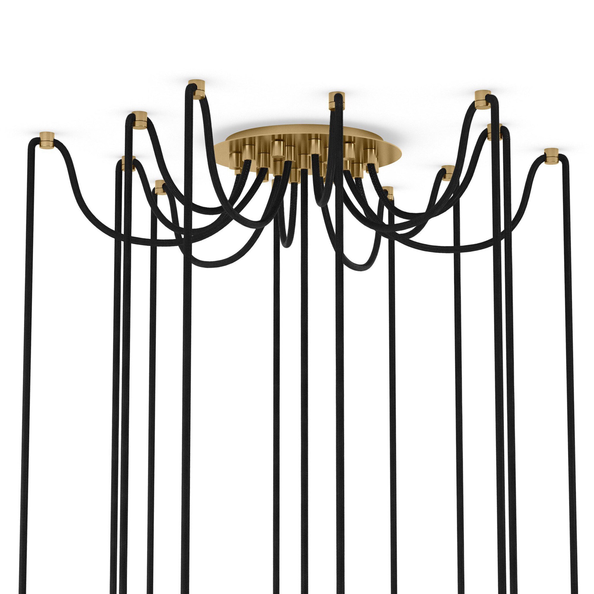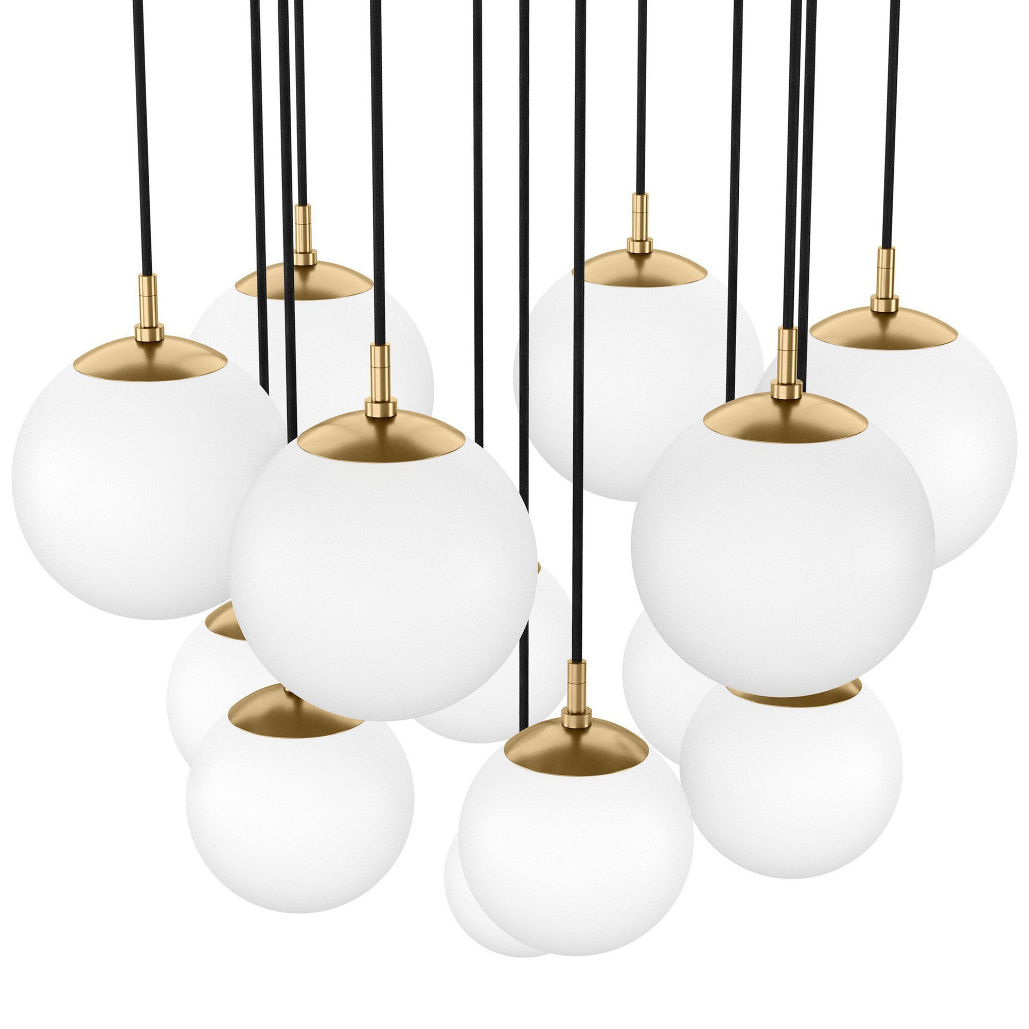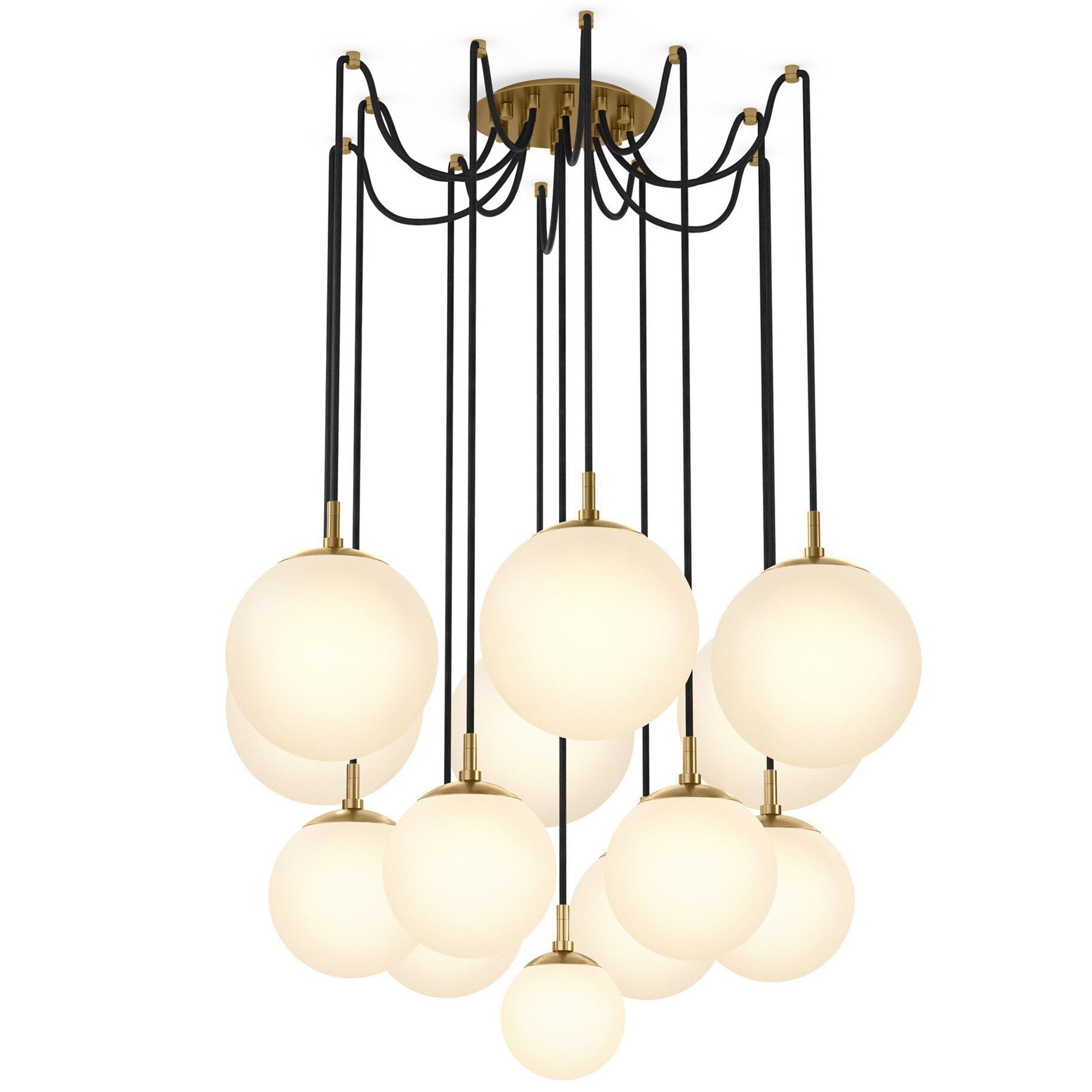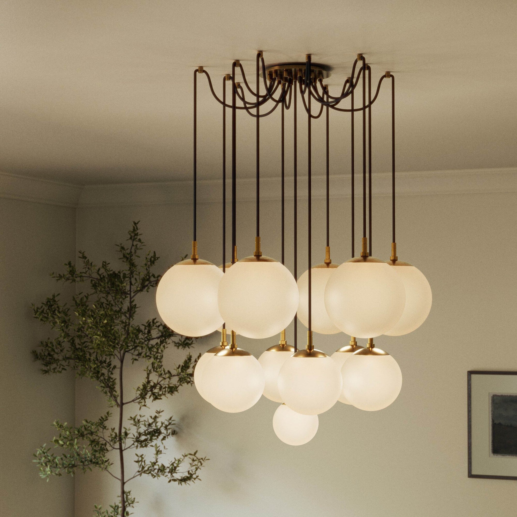 The Spider Chandelier features hand-blown matte glass spheres suspended at varying lengths for an eye-catching display. Crafted with a blackened brass frame, this chandelier provides diffused light with a modern sculptural presence. Designed and sustainably made in Poland, it combines artistry and functionality, making it a striking addition to any dry-rated interior space.