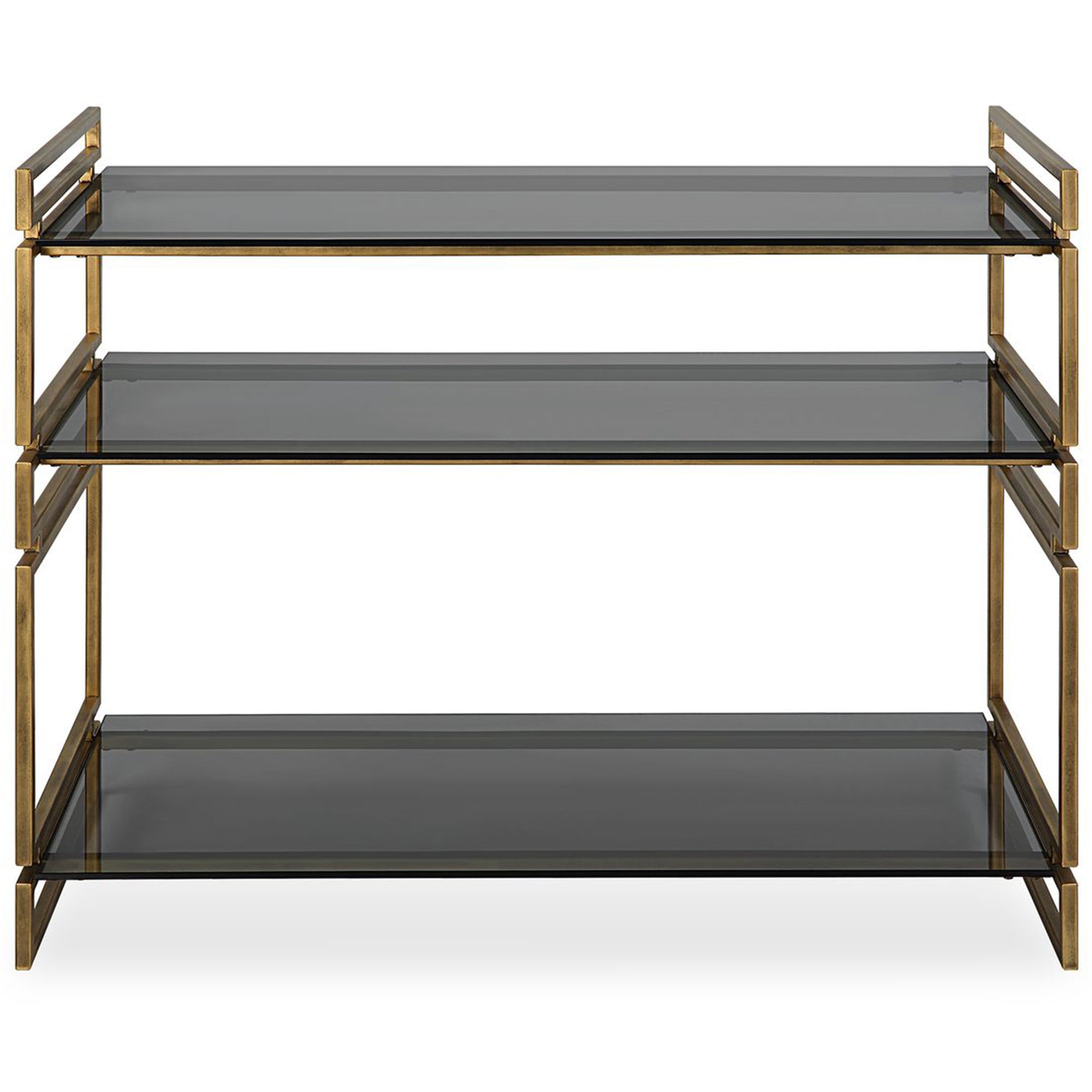 The Stacked Up Console Table is a functional accent that allows for creativity as an entryway piece or even as a bar. It features a striking combination of smoked gray glass with geometric iron supports finished in lightly antiqued gold. The multi-tiered design provides ample space for storage and display, while the open metallic frame maintains a light and airy presence in contemporary interiors.