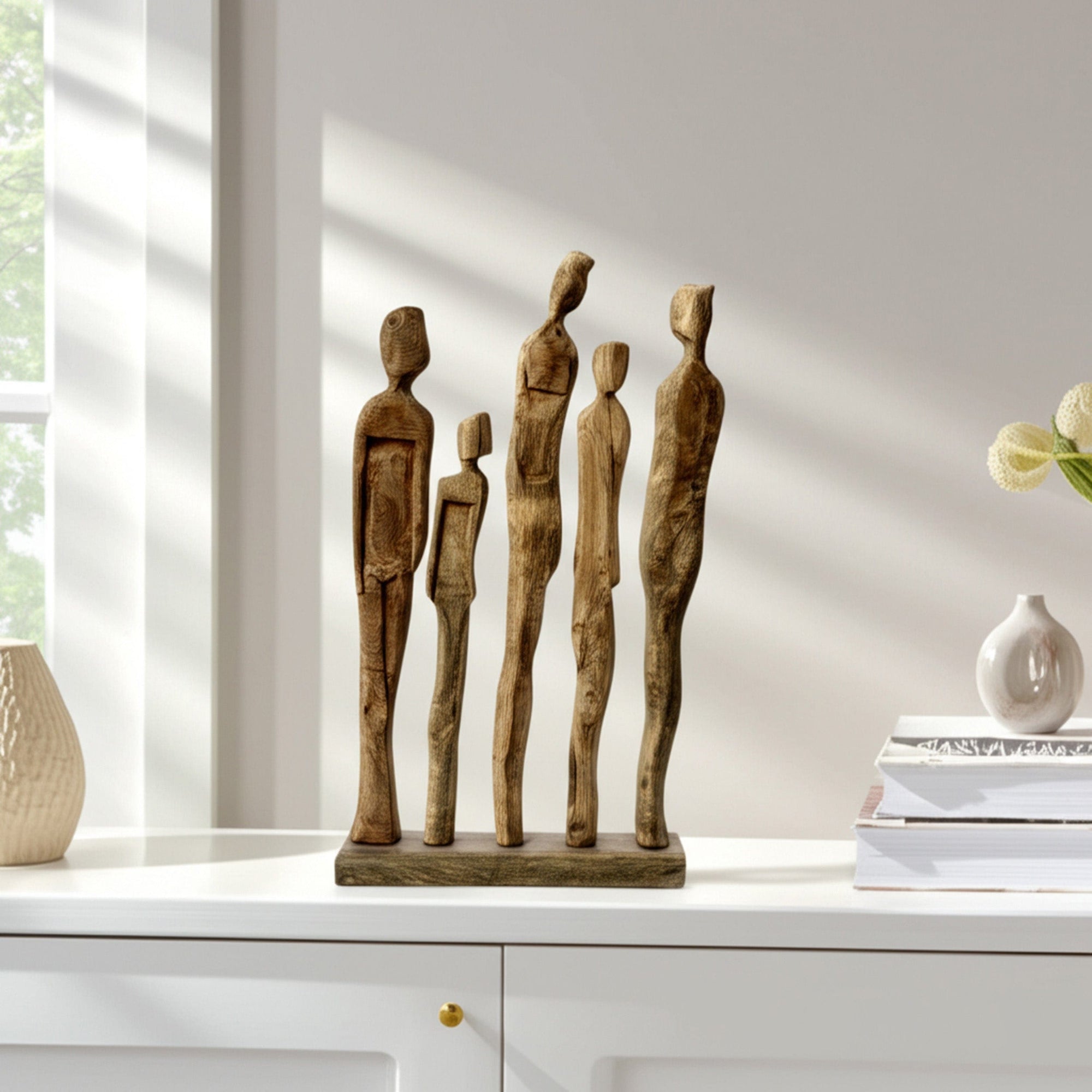 Bring artistry and warmth to your space with the Standing People sculpture. Handcrafted from premium mango wood, this elegant piece features five abstract human figures arranged on a sturdy fixed base, celebrating connection and harmony. The natural wood finish highlights the craftsmanship and organic beauty of the material, making it a striking addition to any shelf, console, or tabletop. Perfect for contemporary, rustic, or eclectic interiors, this sculpture serves as both a conversation starter and a timeless décor accent.