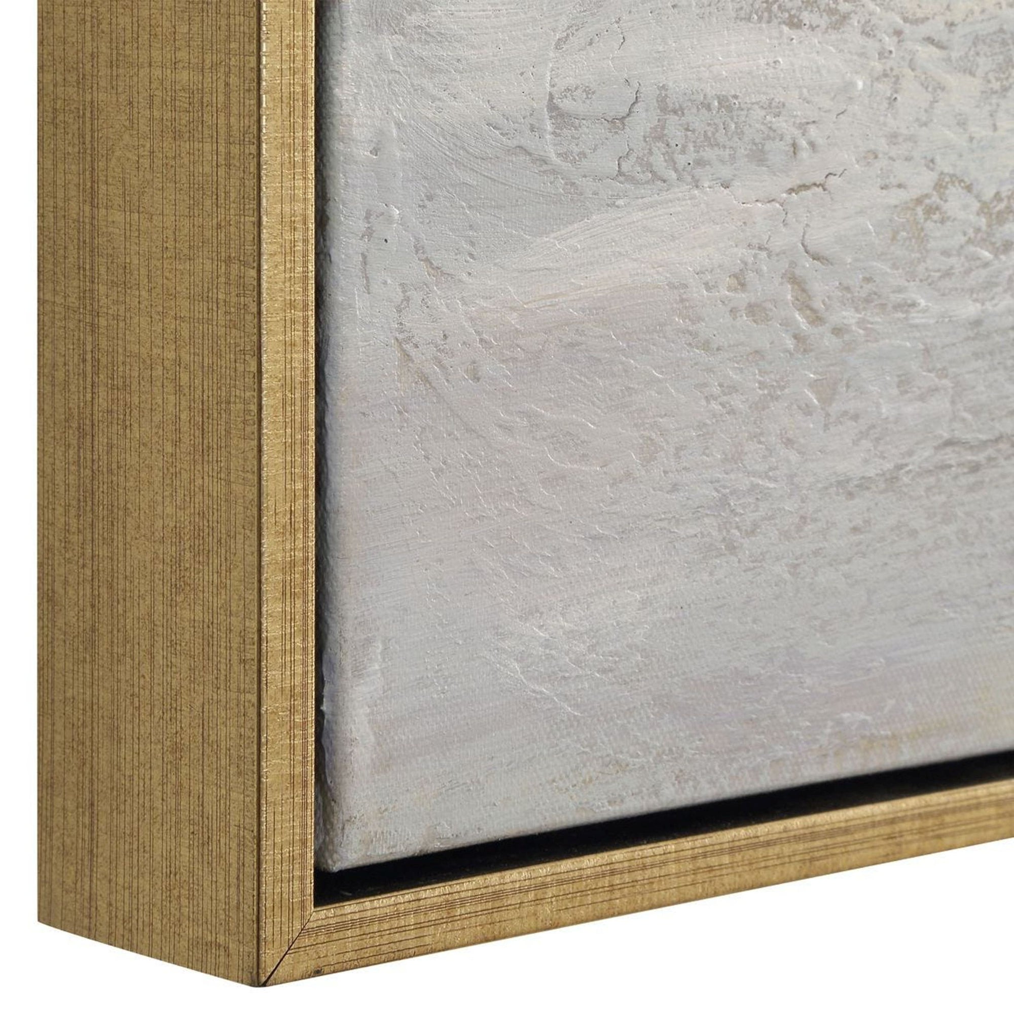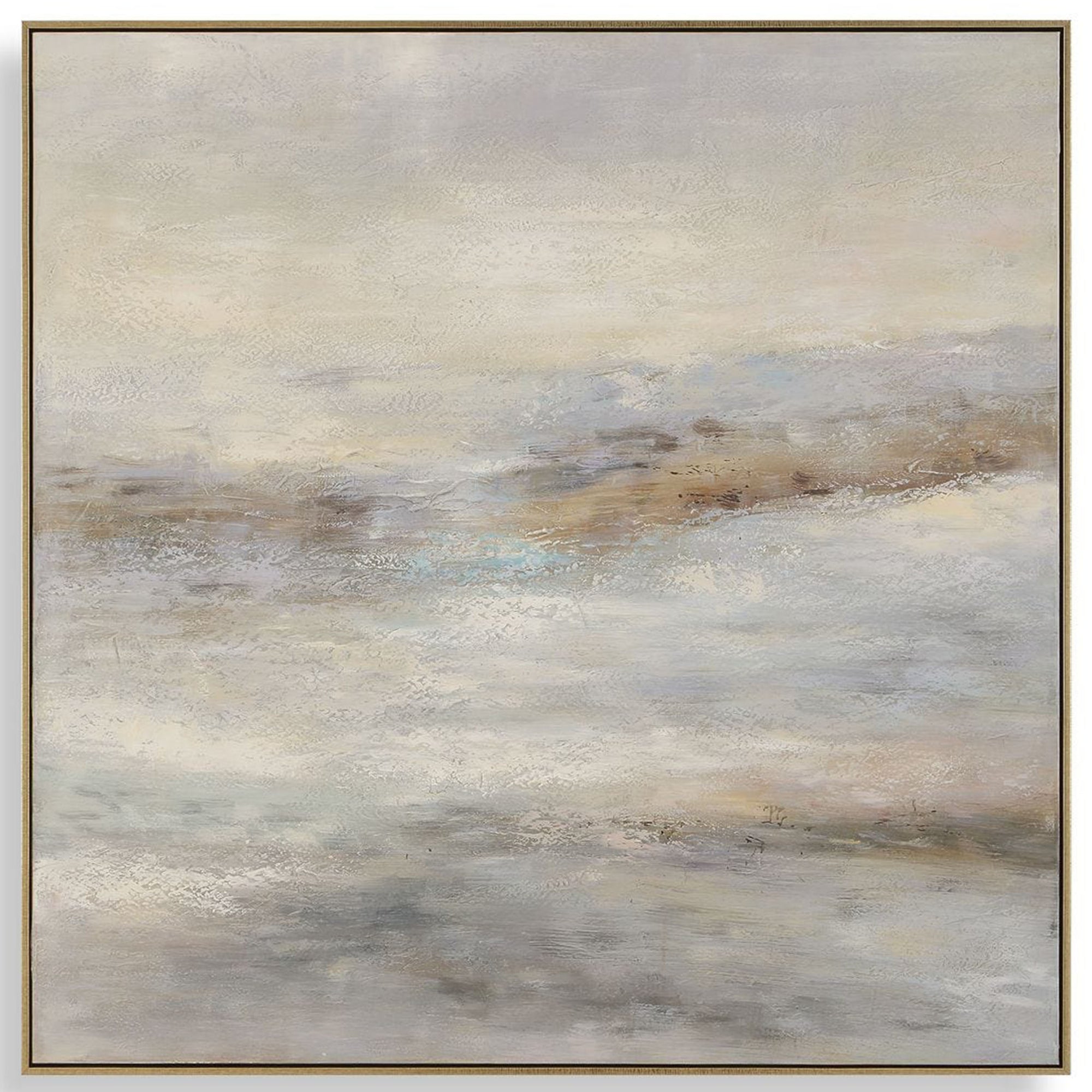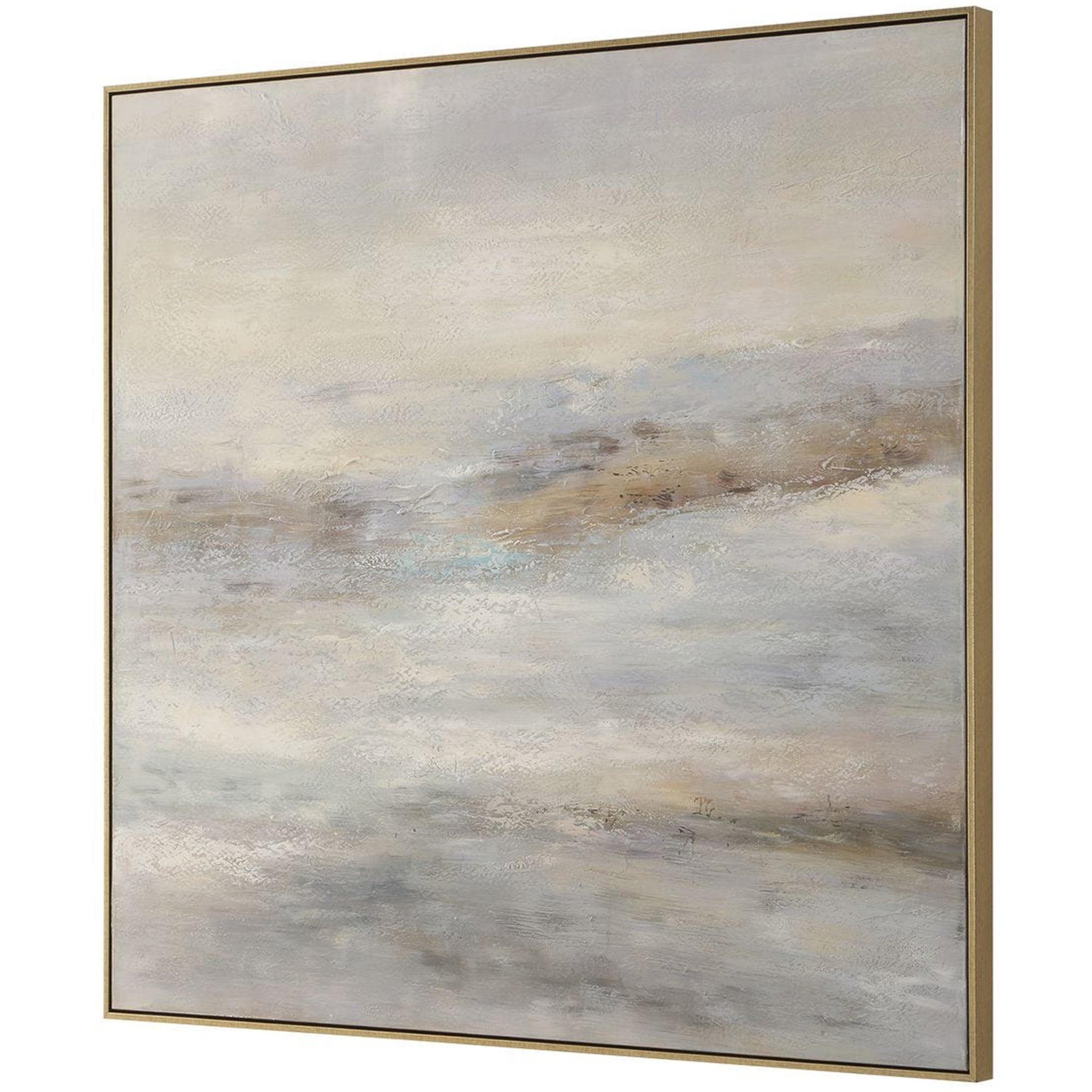 The Say When Framed artwork features a soothing neutral palette of soft creams, muted beiges, and deep charcoal. Hand-painted on canvas, the visible brushstrokes create layered texture that adds movement and depth to any wall. Encased in a petite gold leaf frame, this piece seamlessly integrates into diverse design styles.
