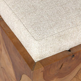 The Tomlin Outdoor Stool features a unique layered design crafted from laminated teak root with miter joinery. Its simple shape offers flexible seating with organic vibes and natural movement. Each stool is one-of-a-kind, with variations reflective of the natural material. Over time, joint expansion may become visible, adding to its character.